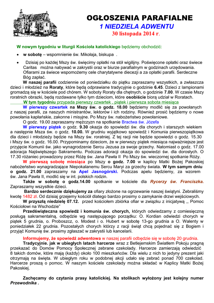 OGŁOSZENIA PARAFIALNE 1 NIEDZIELA ADWENTU 30 listopada 2014 r. W nowym tygodniu w liturgii Kościoła katolickiego będziemy obchodzić: w sobotę – wspomnienie św. Mikołaja, biskupa . Dzisiaj po każdej Mszy św. święcimy opłatki na stół wigilijny. Poświęcone opłatki oraz świece Caritas można nabywać w zakrystii oraz w biurze parafialnym w godzinach urzędowania. Ofiarami za świece wspomożemy cele charytatywne diecezji a za opłatki parafii. Serdeczne Bóg zapłać. W naszej parafii codziennie od poniedziałku do piątku zapraszamy wszystkich, a zwłaszcza dzieci i młodzież na Roraty, które będą odprawiane tradycyjnie o godzinie 6.45. Dzieci z lampionami gromadzą się w kościele pod chórem. W soboty Roraty dla chętnych, o godzinie 7.00. W czasie Mszy roratnich obrazki, będą rozdawane tylko tym dzieciom, które osobiście biorą udział w Roratach. W tym tygodniu przypada pierwszy czwartek , piątek i pierwsza sobota miesiąca W pierwszy czwartek na Mszy św. o godz. 18.00 będziemy modlić się za powołanych z naszej parafii, za naszych ministrantów, lektorów i ich rodziny. Również prosić będziemy o nowe powołania kapłańskie, zakonne i misyjne. Po Mszy św. nabożeństwo powołaniowe. O godz. 19.00 zapraszamy mężczyzn na spotkanie Bractwa św. Józefa W pierwszy piątek o godz. 9.30 okazja do spowiedzi św. dla chorych i starszych wiekiem a następnie Msza św. o godz. 10.00. W grudniu wyjątkowo spowiedź i Komunia pierwszopiątkowa dla dzieci i młodzieży będzie na Mszy św. roratniej. Z tej racji nie będzie spowiedzi o godz. 15.30 i Mszy św. o godz. 16.00. Przypominamy dzieciom, że w pierwszy piątek miesiąca najważniejsze jest przyjęcie Komunii św. jako wynagrodzenie Sercu Jezusa za swoje grzechy. Natomiast o godz. 17.00 adoracja Najświętszego Sakramentu. Podczas adoracji okazja do spowiedzi św. dla dorosłych. O 17.30 różaniec prowadzony przez Różę św. Jana Pawła II Po Mszy św. wieczornej spotkanie Róży. W pierwszą sobotę miesiąca po Mszy o godz. 7.00 w kaplicy Matki Bożej Pakoskiej nabożeństwo wynagradzające Niepokalanemu Sercu Maryi za grzechy świata. W tym samym dniu o godz. 21.00 zapraszamy na Apel Jasnogórski. Podczas apelu będziemy, za wzorem św. Jana Pawła II, modlić się w int. polskich rodzin. Także w sobotę o godz.14.00 spotkanie w kościele dla Rycerzy św. Franciszka. Zapraszamy wszystkie dzieci. Bardzo serdecznie dziękujemy za ofiary złożone na ogrzewanie naszej świątyni. Zebraliśmy kwotę 1482 zł. Od dzisiaj grzejemy kościół dlatego bardzo prosimy o zamykanie drzwi wejściowych. W przyszłą niedzielę 07.12. przed kościołem zbiórka ofiar w związku z inicjatywą ,, Pomoc Kościołowi na Wschodzie” Przedświąteczna spowiedź i komunia św. chorych, których odwiedzamy z comiesięczną posługą sakramentalną, odbędzie wg następującego porządku: O. Kordian odwiedzi chorych w piątek 5 grudnia, o. Proboszcz, o. Modest i o. Hubert w sobotę 13-go grudnia a O. Walenty w poniedziałek 22 grudnia. Pozostałych chorych którzy z racji świąt chcą pojednać się z Bogiem i przyjąć Komunię św. prosimy zgłaszać w zakrystii lub kancelarii. Informujemy, że spowiedź adwentowa w naszej parafii odbędzie się w sobotę 20 grudnia. Tradycyjnie. jak w ubiegłych latach harcerze wraz z Betlejemskim Światłem Pokoju pragną przekazać do Domów Pomocy Społecznej zebrane czekolady. Harcerze zamierzają odwiedzić 8 takich domów, które mają (każdy) około 100 mieszkańców. Dla wielu z nich to jedyny prezent jaki otrzymają na święta. W ubiegłym roku w podobnej akcji udało się zebrać ponad 700 czekolad. Harcerze proszą o pomoc. W naszym kościele czekolady można składać w Kaplicy Matki Bożej Pakoskiej. Zachęcamy do czytania prasy katolickiej. Na stolikach wyłożony jest kolejny numer Przewodnika . Spotkanie dla kandydatów do bierzmowania. KLASY II Gimnazjum: Poniedziałek. Msza Święta o godz. 18.00. Po Mszy spotkanie organizacyjne. Spotkanie dla kandydatów do bierzmowania. KLASY III Gimnazjum: Piątek. Msza Święta o godz. 18.00. Po Mszy spotkanie organizacyjne. Przed kościołem można nabyć sianko na stół wigilijny przygotowane przez młodzież. Dochód ze sprzedaży przeznaczony jest na wyjazd młodzieży na zimowe rekolekcje. Można przygotować świąteczną paczkę dla dziecka z naszej parafii. Na wieńcu adwentowym leżą gwiazdki, na których napisana jest płeć i wiek dziecka. Przygotowaną paczkę prosimy dostarczyć z gwiazdką do zakrystii. Możemy dać chwile radości tym, którzy dziś potrzebują naszej pomocy. Modlitwa o pokój w kaplicy Wniebowzięcia NMP w każdą niedzielę o 19.00. Odeszły do Pana: śp. Jolanta Żurek, l.64, Pławin , pochowana na naszym cmentarzu śp. Stefania Oleszko, l. 89, Wielowieś 31