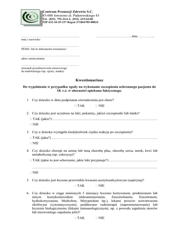 Centrum Promocji Zdrowia S.C. 43-600 Jaworzno ul. Paderewskiego 43 Tel. (032) 752-24-6 4, (032) 615-64-06 NIP 632-10-29-157 Regon 271864785-00024 …………………………………………………. imię i nazwisko …….………………………., data …………...... …………………………………………………. PESEL lub nr dokumentu tożsamości …………………………………………………. adres zamieszkania …………………………………………………. stosunek przedstawiciela ustawowego do małoletniego (np. ojciec, matka) Kwestionariusz Do wypełnienia w przypadku zgody na wykonanie szczepienia ochronnego pacjenta do 18. r.ż. w obecności opiekuna faktycznego. 1. Czy dziecko w dniu podpisania oświadczenia jest chore? TAK NIE 2. Czy dziecko jest uczulone na leki, pokarmy, jakieś szczepionki lub lateks? TAK (jakie?) …………………………………………………………………………… NIE 3. Czy u dziecka wystąpiła kiedykolwiek ciężka reakcja po szczepieniu? TAK (jaka?) ……………………………………………………………………………. NIE 4. Czy dziecko choruje na astmę lub inną chorobę płuc, chorobę serca, nerek, krwi lub metaboliczną (np. cukrzycę)? TAK (jakie to jest schorzenie, jakie leki przyjmuje?) …………………………………. ………………………………………………………………………………………….. NIE 5. Czy dziecko jest leczone przewlekle kwasem acetylosalicylowym (aspiryną)? TAK NIE 6. Czy dziecko w ciągu minionych 3 miesięcy leczono kortyzonem, prednizonem lub innym kortykosteroidem (deksametazonem, Encortolonem, Encortonem, hydrokortyzonem, Medrolem, Metypredem itp.), lekami przeciw nowotworom złośliwym (cytostatycznymi), poddawano radioterapii (napromieniowaniu) lub leczeniu biologicznemu (lekami immunologicznymi, np. z powodu zapalenia stawów lub nieswoistego zapalenia jelit)? TAK NIE Centrum Promocji Zdrowia S.C. 43-600 Jaworzno ul. Paderewskiego 43 Tel. (032) 752-24-6 4, (032) 615-64-06 NIP 632-10-29-157 Regon 271864785-00024 7. Czy dziecko choruje na nowotwór złośliwy, białaczkę, AIDS (zakażenie HIV) lub inne choroby układu immunologicznego (odpornościowego)? Czy u najbliższych krewnych rozpoznano ciężki wrodzony niedobór odporności lub występowały nagłe, niewyjaśnione zgony z powodu zakażeń? TAK NIE 8. Czy u dziecka, jego rodzeństwa lub rodzica występowały drgawki? Czy u dziecka występowały lub występują zaburzenia ze strony mózgu lub inne objawy ze strony układu nerwowego (np. zaburzenia świadomości, utrata przytomności, niedowład lub paraliż, upośledzenie umysłowe)? TAK NIE 9. Czy w ciągu minionego roku dziecko otrzymało krew lub preparat krwi (np. osocze, krwinki czerwone, płytki krwi), lek nazywany immunoglobuliną (gammaglobuliną) lub otrzymuje lek przeciwwirusowy (z powodu opryszczki zwyklej, ospy wietrznej lub półpaśca)? TAK NIE 10. Czy dziecko otrzymywało jakąkolwiek szczepionkę w ciągu ostatnich 4 tygodni? TAK (jaką?) …………………………………………………………………………... NIE 11. Czy dziewczynka/nastolatka jest w ciąży lub istnieje ryzyko, że będzie w ciąży w ciągu najbliższego miesiąca? TAK NIE NIE DOTYCZY Data poprzedniego szczepienia ………………………………………………………………… Nazwa szczepionki …………………………………………………………………………...… Dawka ………………………………………………………………………………………….. Po świadomym udzieleniu odpowiedzi na powyższe pytania, wyrażam zgodę na wykonanie u mojego niepełnoletniego dziecka szczepienia ochronnego w Centrum Promocji Zdrowia w Jaworznie w zakresie: ………………………………………………………………………………………………….. ……………………………………………... podpis osoby składającej oświadczenie …………………………………………… podpis osoby przyjmującej oświadczenie