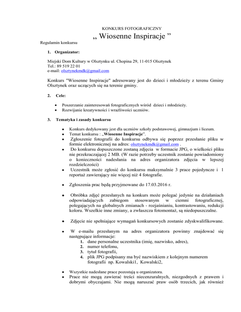 KONKURS FOTOGRAFICZNY „ Wiosenne Inspiracje ” Regulamin konkursu 1. Organizator: Miejski Dom Kultury w Olsztynku ul. Chopina 29, 11-015 Olsztynek Tel.: 89 519 22 01 e-mail: [email protected] Konkurs "Wiosenne Inspiracje" adresowany jest do dzieci i młodzieży z terenu Gminy Olsztynek oraz uczących się na terenie gminy. 2. Cele: 3. Poszerzanie zainteresowań fotograficznych wśród dzieci i młodzieży. Rozwijanie kreatywności i wrażliwości uczniów. Tematyka i zasady konkursu Konkurs dedykowany jest dla uczniów szkoły podstawowej, gimnazjum i liceum. Temat konkursu : „Wiosenne Inspiracje”. Zgłoszenie fotografii do konkursu odbywa się poprzez przesłanie pliku w formie elektronicznej na adres: [email protected] . Do konkursu dopuszczone zostaną zdjęcia w formacie JPG, o wielkości pliku nie przekraczającej 2 MB. (W razie potrzeby uczestnik zostanie powiadomiony o konieczności nadesłania na adres organizatora zdjęcia w lepszej rozdzielczości) Uczestnik może zgłosić do konkursu maksymalnie 3 prace pojedyncze i 1 reportaż zawierający nie więcej niż 4 fotografie. Zgłoszenia prac będą przyjmowane do 17.03.2016 r. Obróbka zdjęć przesłanych na konkurs może polegać jedynie na działaniach odpowiadających zabiegom stosowanym w ciemni fotograficznej, polegających na globalnych zmianach - rozjaśnianiu, kontrastowaniu, redukcji koloru. Wszelkie inne zmiany, a zwłaszcza fotomontaż, są niedopuszczalne. Zdjęcie nie spełniające wymagań konkursowych zostanie zdyskwalifikowane. W e-mailu przesłanym na adres organizatora powinny znajdować się następujące informacje: 1. dane personalne uczestnika (imię, nazwisko, adres), 2. numer telefonu, 3. tytuł fotografii, 4. plik JPG podpisany ma być nazwiskiem z kolejnym numerem fotografii np. Kowalski1, Kowalski2, Wszystkie nadesłane prace pozostają u organizatora. Prace nie mogą zawierać treści niecenzuralnych, niezgodnych z prawem i dobrymi obyczajami. Nie mogą naruszać praw osób trzecich, jak również przedstawiać lub opisywać sytuacji, które mogą powodować zagrożenie dla zdrowia lub życia ludzi lub zwierząt. Prace, które nie spełniają powyższych warunków nie będą podlegały ocenie. 4. Ocena prac i rozstrzygnięcie konkursu 1.Wszystkie zdjęcia nadesłane do Konkursu podlegają ocenie Jury powołanego przez Organizatora. 2. Jury dokonuje oceny po zakończeniu okresu trwania Konkursu biorąc pod uwagę wartość artystyczną, jakość i oryginalność nadesłanych fotografii. 3. Spośród nadesłanych prac Jury wybierze trzy prace, które zajmą pierwsze, drugie i trzecie miejsce. 4. Jury wybierze również prace wyróżnione – o ilości tych prac Jury zadecyduje podczas obrad. 5. Decyzje Jury są ostateczne i wiążące dla wszystkich uczestników Konkursu. 6. O decyzji Jury nagrodzone i wyróżnione osoby zostaną powiadomione telefonicznie i drogą elektroniczną. 7. Decyzje Jury zostaną ogłoszone na stronie internetowej Miejskiego Domu Kultury w Olsztynku mdkolsztynek.pl oraz na facebook’owym fanpage’u. 8.Prace konkursowe będzie można oglądać od 20.03.2016 r. do 1.06. 2016 r. w holu Ratusza Miejskiego w Olsztynku. 5. Dodatkowe informacje: Organizator zastrzega sobie prawo do kopiowania i publikowania prac w celach promocyjno – informacyjnych. Zgłoszenie prac oznacza akceptację regulaminu. Szczegółowych informacji dotyczących konkursu udziela instruktor ds. plastycznych Kamila Kupiec pod nr. tel. (89) 519 22 01. Zdjęcie, które zajmie pierwsze miejsce, zostanie opublikowane na okładce lokalnej gazety ALBO. Autorzy prac otrzymują pamiątkowe dyplomy. Konkursu zostanie rozstrzygnięty 19.03.2016 r. podczas Jarmarku Wielkanocnego.