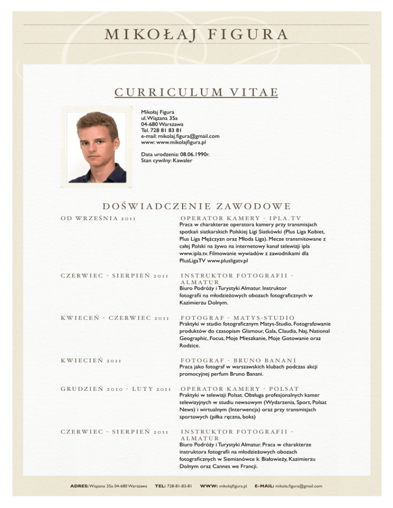 M I KO Ł A J F I G U R A C U R R I C U L U M V I TA E Mikołaj Figura ul. Wiązana 35a 04-680 Warszawa Tel. 728 81 83 81 e-mail: [email protected] www: www.mikolajfigura.pl Data urodzenia: 08.06.1990r. Stan cywilny: Kawaler D O Ś W I A D C Z E N I E Z AW O D O W E OD WRZEŚNIA 2011 " C Z E RW I E C " " " - S I E R P I E Ń 2 0 1 1" " " " O P E R A T O R K A M E RY - I P L A . T V Praca w charakterze operatora kamery przy transmisjach spotkań siatkarskich Polskiej Ligi Siatkówki (Plus Liga Kobiet, Plus Liga Mężczyzn oraz Młoda Liga). Mecze transmitowane z całej Polski na żywo na internetowy kanał telewizji ipla www.ipla.tv. Filmowanie wywiadów z zawodnikami dla PlusLigaTV www.plusligatv.pl I N S T RU KT O R F O T O G R A F I I A L M AT U R Biuro Podróży i Turystyki Almatur. Instruktor fotografii na młodzieżowych obozach fotograficznych w Kazimierzu Dolnym. K W I E C E Ń - C Z E RW I E C 2 0 1 1" F O T O G R A F - M AT Y S - S T U D I O Praktyki w studio fotograficznym Matys-Studio. Fotografowanie produktów do czasopism Glamour, Gala, Claudia, Naj, National Geographic, Focus, Moje Mieszkanie, Moje Gotowanie oraz Rodzice. K W I E C I E Ń 2 0 1 1" " F O T O G R A F - B RU N O B A N A N I Praca jako fotograf w warszawskich klubach podczas akcji promocyjnej perfum Bruno Banani. 2 0 1 1" O P E R A T O R K A M E RY - P O L S A T Praktyki w telewizji Polsat. Obsługa profesjonalnych kamer telewizyjnych w studiu newsowym (Wydarzenia, Sport, Polsat News) i wirtualnym (Interwencja) oraz przy transmisjach sportowych (piłka ręczna, boks) " G RU D Z I E Ń 2010 - LUTY C Z E RW I E C " " - S I E R P I E Ń 2 0 1 1" " " " ADRES: Wiązana 35a 04-680 Warszawa I N S T RU KT O R F O T O G R A F I I A L M AT U R Biuro Podróży i Turystyki Almatur. Praca w charakterze instruktora fotografii na młodzieżowych obozach fotograficznych w Siemianówce k. Białowieży, Kazimierzu Dolnym oraz Cannes we Francji. TEL: 728-81-83-81 WWW: mikolajfigura.pl E-MAIL: [email protected] M I KO Ł A J F I G U R A L I S T O P A D - S I E R P I E Ń 2 0 0 9" F O T O G R A F - I N P RO C O I N T E R I O R S Wykonywanie zdjęć wnętrz dla dekoratora wnętrz oraz developera mieszkań „pod klucz” Inproco Interiors. D O D AT KO W O • Realizacja koncertu grupy „The Intuition Orchestra” w Centrum Sztuki Współczesnej. • Wielokrotne fotografowanie eventów, imprez, ślubów itp. • Nagrywanie i montaż etiud krótkometrażowych. • Projektowanie logotypów, wizytówek, ulotek i stron internetowych dla prywatnego żłobka Piccolo oraz salonu odnowy biologicznej Pracownia Piękna. W Y K S Z TA Ł C E N I E O D P A Ź D Z I E R N I K A 2 0 1 1"" " " " " " " " " " " AKADEMIA FILMU I TELEWIZJI. SPECJALIZACJA - SZTUKA O P E R AT O R S K A C Z E R W I E C 2 0 1 1" " " " " " " " " " " " " PA Ń S T WOW Y DY P L O M P O T W I E R D Z A J Ą C Y K WA L I F I K A C J E Z AW O D O W E F O T O T E C H N I K A 2009-2011 " " " " " " " " " ZESPÓŁ SZKÓŁ F O T O T E C H N I C Z N Y C H W WA R S Z A W I E 2 0 0 9" " " " M AT U R A " UMIEJĘTNOŚCI I OSIĄGNIĘCIA • • • • • • • • • • • • • Zbiorowa wystawa fotografii w galerii Zamku Królewskiego w Warszawie. Wyróżnienie w ogólnopolskim konkursie plastycznym „Tęcza” organizowanym przez ASP. Zajęcie drugiego miejsca w ogólnopolskim konkursie fotograficznym „Szkoła bez przemocy” – reportaż. Wystawa prac na finale akcji 888. Znajomość systemów operacyjnych Microsoft Windows oraz Apple MacOS. Obsługa kamer z rodziny SONY seria PMW, HDR, HXR, HVR, NEX oraz lustrzanek cyfrowych wyposażonych w funkcje nagrywania filmów np. Canon EOS 5d mkII. Umiejętność pracy na programie montażowym Apple Final Cut Pro. Znajomość pakietów graficznych: Adobe Photoshop, Adobe Photoshop Lightroom oraz Adobe Illustrator. Obsługa pakietów biurowych Microsoft Office oraz Apple iWork. Język angielski w stopniu komunikatywnym. Dyspozycyjność. Prawo jazdy kat. B. Własny środek transportu. C E C H Y C H A R A KT E RU Obowiązkowość, entuzjazm do pracy, punktualność, umiejętność pracy w zespole, łatwość nawiązywania kontaktów, komunikatywność, życzliwość, optymizm, bezkonfliktowość, łatwość uczenia się, chęć zdobywania nowych doświadczeń i umiejętności. Strona 2 ADRES: Wiązana 35a 04-680 Warszawa TEL: 728-81-83-81 WWW: mikolajfigura.pl E-MAIL: [email protected]