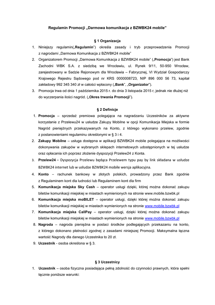 Regulamin Promocji „Darmowa komunikacja z BZWBK24 mobile” § 1 Organizacja 1. Niniejszy regulamin(„Regulamin”) określa zasady i tryb przeprowadzenia Promocji z nagrodami „Darmowa Komunikacja z BZWBK24 mobile” 2. Organizatorem Promocji „Darmowa Komunikacja z BZWBK24 mobile” („Promocja”) jest Bank Zachodni WBK S.A. z siedzibą we Wrocławiu, ul. Rynek 9/11, 50-950 Wrocław, zarejestrowany w Sadzie Rejonowym dla Wrocławia – Fabrycznej, VI Wydział Gospodarczy Krajowego Rejestru Sądowego pod nr KRS 0000008723, NIP 896 000 56 73, kapitał zakładowy 992 345 340 zł w całości wpłacony („Bank”, „Organizator”). 3. Promocja trwa od dnia 1 października 2015 r. do dnia 3 listopada 2015 r, jednak nie dłużej niż do wyczerpania ilości nagród. („Okres trwania Promocji”). § 2 Definicje 1. Promocja – sprzedaż premiowa polegająca na nagradzaniu Uczestników za aktywne korzystanie z Przelewu24 w usłudze Zakupy Mobilne w opcji Komunikacja Miejska w formie Nagród pieniężnych przekazywanych na Konto, z którego wykonano przelew, zgodnie z postanowieniami regulaminu określonymi w § 3 i 4. 2. Zakupy Mobilne – usługa dostępna w aplikacji BZWBK24 mobile polegająca na możliwości dokonywania zakupów w wybranych sklepach internetowych udostępnionych w tej usłudze oraz opłacania ich poprzez złożenie dyspozycji Przelew24 z Konta. 3. Przelew24 – Dyspozycja Przelewu będąca Przelewem typu pay by link składana w usłudze BZWBK24 internet lub w usłudze BZWBK24 mobile wersja aplikacyjna. 4. Konto – rachunek bankowy w złotych polskich, prowadzony przez Bank zgodnie z Regulaminem kont dla ludności lub Regulaminem kont dla firm 5. Komunikacja miejska Sky Cash – operator usługi dzięki, której można dokonać zakupu biletów komunikacji miejskiej w miastach wymienionych na stronie www.mobile.bzwbk.pl 6. Komunikacja miejska moBILET – operator usługi, dzięki której można dokonać zakupu biletów komunikacji miejskiej w miastach wymienionych na stronie www.mobile.bzwbk.pl 7. Komunikacja miejska CallPay – operator usługi, dzięki której można dokonać zakupu biletów komunikacji miejskiej w miastach wymienionych na stronie www.mobile.bzwbk.pl 8. Nagroda – nagroda pieniężna w postaci środków podlegających przekazaniu na konto, z którego dokonano płatności zgodnej z zasadami niniejszej Promocji. Maksymalna łączna wartość Nagrody dla danego Uczestnika to 20 zł. 9. Uczestnik - osoba określona w § 3. § 3 Uczestnicy 1. Uczestnik – osoba fizyczna posiadająca pełną zdolność do czynności prawnych, która spełni łącznie poniższe warunki: a) posiada Konto osobiste lub firmowe prowadzone w złotych w Banku b) dokona zakupu biletu komunikacji miejskiej korzystając z dyspozycji Przelew24 w usłudze Zakupy Mobilne dostępnej w aplikacji BZWBK24 mobile z Konta 2. Z udziału w Promocji wyłączeni są pracownicy Organizatora pracujący w Obszarze Bankowości Multikanałowej oraz pracownicy Organizatora zaangażowani bezpośrednio w realizację Promocji. Pracownikiem w rozumieniu niniejszego Regulaminu jest zarówno osoba zatrudniona przez Organizatora na podstawie umowy o pracę, jak i osoba współpracująca z Organizatorem na podstawie umowy cywilnoprawnej (w szczególności na podstawie umowy o dzieło, umowy zlecenia). § 4 Warunki promocji 1. Z Promocji może skorzystać każdy Uczestnik spełniający warunki wskazane w § 3. 2. Promocja obejmuje zakup biletów komunikacji miejskiej poprzez usługę Zakupy Mobilne w aplikacji BZWBK24 mobile w Okresie trwania Promocji. 3. Uczestnik promocji może otrzymać Nagrodę w wysokości odpowiadającej wysokości dokonanych zakupów biletów komunikacji miejskiej poprzez usługę Zakupy Mobilne maksymalnie do kwoty 20 zł. 4. W przypadku zakupu biletów na większą kwotę niż 20 zł Uczestnik otrzyma Nagrodę w wysokości 20 zł za zakupy. 5. Weryfikacja spełnienia przez Uczestników warunków wskazanych w niniejszym Regulaminie nastąpi do 10 dni roboczych od zakończenia Okresu trwania Promocji. Wypłata Nagród nastąpi na Konto, z którego zostały wykonane dyspozycje Przelew24 na zakup biletów komunikacji miejskiej. Konto zostanie uznane do dnia 20 listopada 2015 r. 6. Uczestnik nie może przenieść prawa do otrzymania Nagrody na osoby trzecie. 7. Uczestnik nie może domagać się zamiany Nagrody na inną. 8. Wartość Nagród przewidzianych w Promocji jest zwolniona z podatku dochodowego od osób fizycznych na podstawie art. 21 ust.1 pkt 68 ustawy z dnia 26 lipca 1991 r.o podatku dochodowym od osób fizycznych (Dz.U. z 2012 , poz.361 z pózn. zm.). 9. Limit Nagród w promocji wynosi 50 000 zł brutto. § 5 Reklamacje I. Tryb rozpatrywania reklamacji i skarg złożonych do 10 10.2015r. włącznie. 1. Uczestnik może złożyć reklamacje ustnie w siedzibie Banku, dowolnej jednostce organizacyjnej Banku zajmującej się obsługą klienta, pisemnie na adres Banku lub jego dowolnej jednostki organizacyjnej zajmującej się obsługą klienta, telefonicznie lub w formie elektronicznej. Odpowiednie adresy, w tym poczty elektronicznej oraz numery telefonów dostępne są w jednostkach organizacyjnych Banku zajmujących się obsługą klienta oraz wskazane na stronie internetowej Banku www.bzwbk.pl. 2. Reklamacje powinny zawierać imię, nazwisko i dokładny adres Uczestnika, jak również opis i wskazanie przyczyny reklamacji. 3. Odpowiedź na reklamacje, w zależności od charakteru sprawy zostanie udzielona przez Bank pisemnie, telefonicznie, ustnie lub w formie elektronicznej, bez zbędnej zwłoki, jednak nie później niż w terminie 30 dni od daty otrzymania reklamacji. W uzasadnionych przypadkach termin udzielenia odpowiedzi może zostać wydłużony maksymalnie do 90 dni, po uprzednim wyjaśnieniu Uczestnikowi przyczyn opóźnienia i wskazania okoliczności wymagających dodatkowego ustalenia. II. Tryb rozpatrywania reklamacji i skarg złożonych po 10.10.2015r. 1. Uczes