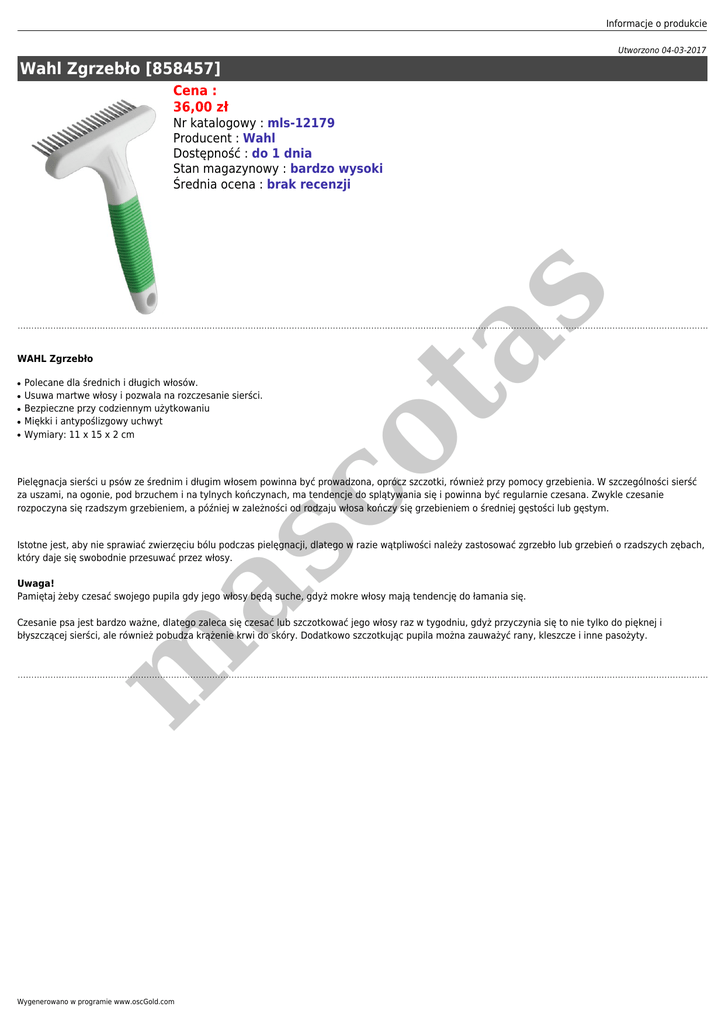 Informacje o produkcie Utworzono 04-03-2017 Wahl Zgrzebło [858457] Cena : 36,00 zł WAHL Zgrzebło ● ● ● ● ● co ta s Nr katalogowy : mls-12179 Producent : Wahl Dostępność : do 1 dnia Stan magazynowy : bardzo wysoki Średnia ocena : brak recenzji Polecane dla średnich i długich włosów. Usuwa martwe włosy i pozwala na rozczesanie sierści. Bezpieczne przy codziennym użytkowaniu Miękki i antypoślizgowy uchwyt Wymiary: 11 x 15 x 2 cm Pielęgnacja sierści u psów ze średnim i długim włosem powinna być prowadzona, oprócz szczotki, również przy pomocy grzebienia. W szczególności sierść za uszami, na ogonie, pod brzuchem i na tylnych kończynach, ma tendencje do splątywania się i powinna być regularnie czesana. Zwykle czesanie rozpoczyna się rzadszym grzebieniem, a później w zależności od rodzaju włosa kończy się grzebieniem o średniej gęstości lub gęstym. m as Istotne jest, aby nie sprawiać zwierzęciu bólu podczas pielęgnacji, dlatego w razie wątpliwości należy zastosować zgrzebło lub grzebień o rzadszych zębach, który daje się swobodnie przesuwać przez włosy. Uwaga! Pamiętaj żeby czesać swojego pupila gdy jego włosy będą suche, gdyż mokre włosy mają tendencję do łamania się. Czesanie psa jest bardzo ważne, dlatego zaleca się czesać lub szczotkować jego włosy raz w tygodniu, gdyż przyczynia się to nie tylko do pięknej i błyszczącej sierści, ale również pobudza krążenie krwi do skóry. Dodatkowo szczotkując pupila można zauważyć rany, kleszcze i inne pasożyty. Wygenerowano w programie www.oscGold.com