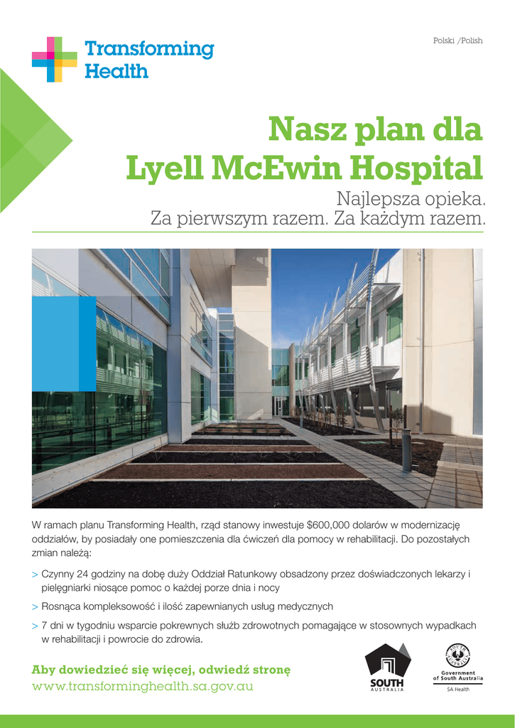 Transforming Health Polski /Polish Nasz plan dla Lyell McEwin Hospital Najlepsza opieka. Za pierwszym razem. Za każdym razem. W ramach planu Transforming Health, rząd stanowy inwestuje $600,000 dolarów w modernizację oddziałów, by posiadały one pomieszczenia dla ćwiczeń dla pomocy w rehabilitacji. Do pozostałych zmian należą: >> Czynny 24 godziny na dobę duży Oddział Ratunkowy obsadzony przez doświadczonych lekarzy i pielęgniarki niosące pomoc o każdej porze dnia i nocy >> Rosnąca kompleksowość i ilość zapewnianych usług medycznych >> 7 dni w tygodniu wsparcie pokrewnych służb zdrowotnych pomagające w stosownych wypadkach w rehabilitacji i powrocie do zdrowia. Aby dowiedzieć się więcej, odwiedź stronę www.transforminghealth.sa.gov.au Budowanie na naszej inwestycji Od 2002 r. zainwestowaliśmy w Lyell McEwin Hospital 227 milionów dolarów w formie ciągłego programu trzyetapowej rozbudowy. Obecnie jesteśmy w Stadium C tego projektu. Prace z tym związane przekształciły Lyell McEwin Hospital w liczący się szpital w północnej części Adelajdy. Końcowe prace budowlane zostaną ukończone w połowie 2015 r. i obejmą nowy oddział intensywnej terapii oraz powiększenie ambulatorium i prace na zewnątrz. Wykonane prace na różnych etapach rozbudowy obejmują: >> zbudowanie nowego 50-łóżkowego budynku zdrowia psychicznego, nowy 96-łóżkowy budynek szpitalny z lądowiskiem helikopterowym, nowy kobiecy i dziecięcy budynek szpitalny, nowy 8-łóżkowy Oddział Poszerzonej Opieki Ratunkowej, a także pomieszczenia administracyjne, szkoleniowe i badawcze nocy pomoc w zagrażających życiu przypadkach i urazach. Oddział Ratunkowy będzie umożliwiał również w razie potrzeby całodobowe usługi diagnostyki obrazowej oraz 24-godzinną służbę dojazdów na wezwanie dla przypadków ostrego zespołu wieńcowego. Lyell McEwin Hospital posiadać będzie również na miejscu doświadczonych lekarzy i pielęgniarki 24 godziny na dobę, by zapewnić szybkie podejmowanie decyzji w nagłych sytuacjach. Oznacza to, że właściwe wyspecjalizowane zespoły i sprzęt dostępne będą we wszystkich nagłych wypadkach – w dzień i w nocy, w dni powszednie i w weekendy. W nagłych wypadkach należy zawsze zadzwonić pod trzy zera (000). Zmiany te nie nastąpią natychmiast Będziemy cię informowali o wszelkich zmianach w Lyell McEwin Hospital, zanim one nastąpią. >> odnowienie szpitalnych oddziałów opieki paliatywnej i medycznego, pomieszczeń ambulatoryjnych dla usług Aboriginal Health, usług patologicznych SA Pathology, diagnostyki obrazowej, sal operacyjnych i oddziału zabiegów jednego dnia oraz udogodnień onkologicznych włącznie z dostawą dwóch akceleratorów liniowych >> znaczne unowocześnienie i udoskonalenia infrastruktury inżynieryjnej. Nowy, wielopoziomowy parking zbudowany na początku 2010 r. zapewni wystarczającą ilość miejsc parkingowych dla wszystkich stadiów rozbudowy. Obecnie chcemy w oparciu o tę inwestycję mieć pewność, że nasz system zapewni stałą opiekę wysokiej jakości za pierwszym i za każdym razem. Szybka pomoc w nagłych wypadkach 24 godziny na dobę, 7 dni w tygodniu Lyell McEwin Hospital oferować będzie Oddział Ratunkowy obsadzony przez doświadczonych lekarzy i pielęgniarki niosące o każdej porze dnia i strona 2 Poprawa opieki w przypadku udaru Dla pacjentów z udarem, szybka reakcja medyczna na wyspecjalizowanym oddziale udarowym może zdecydować o życiu lub śmierci, bądź też o długotrwałym inwalidztwie lub jego uniknięciu. Z tego powodu Lyell McEwin Hospital będzie kontynuować zapewnianie opieki na miejscu 7 dni w tygodniu od 8 rano do 8 wieczorem dla miejscowych pacjentów oraz wszystkich uprawnionych pacjentów wymagających reperfuzji (przywrócenia dopływu krwi do mózgu). Wszechstronne usługi chirurgiczne Lyell McEwin Hospital zwiększy kompleksowość i ilość całej gamy usług chirurgicznych i oferować będzie całodobowy dostęp do chirurgii urazowej. Lyell McEwin Hospital stanie się również głównym szpitalem w rejonie północnym dla zaplanowanej chirurgii wielodniowej. Chirurgia jednego dnia i inne zabiegi będą w dalszym ciągu dostępne w Lyell McEwin Hospital i Modbury Hospital dla mieszkańców północnej części Adelajdy. Najlepsza opieka kobieca i dziecięca Lyell McEwin Hospital zapewni opiekę zarówno zaplanowaną, jak i w nagłych wypadkach dla dzieci z północnej części Adelajdy, jak również kompleksową opiekę w ostrych przypadkach chorób noworodków, pod ogólnostanowym nadzorem, wspólnie z Women’s and Children’s Hospital i Flinders Medical Centre. Oddział Intensywnej Opieki Dla Noworodków będzie utrzymany pod zarządem stanowym. Więcej usług rehabilitacyjnych dla Północy Rehabilitacja jest najskuteczniejsza, jeżeli zacznie się ją stosować natychmiast, jak tylko pacjent będzie gotowy. Dlatego też unowocześniamy oddziały w Lyell McEwin Hospital tak, by posiadały one nowe pomieszczenia do ćwiczeń na oddziale, pozwalające na wcześniejsze rozpoczęcie rehabilitacji. Pokrewne służby zdrowotne będą dostępne 7 dni w tygodniu w stosownych przypadkach, by pomagać pacjentom w powrocie do zdrowia i szybkim wypisaniu ze szpitala. strona 3 Udoskonalone usługi dla osób starszych Szpitale są szczególnie ryzykownym miejscem dla osób starszych. Im dłużej ktoś przebywa w szpitalu, tym większe ryzyko pogorszenia się jego stanu, infekcji, upadków i dodatkowych złamań. Dlatego też zamierzamy wprowadzić jeden ogólnostanowy model usług ortogeriatrycznych, by zapewnić szybkie wyleczenie i wypisanie do domu starszych pacjentów. Szybsze leczenie problemów zdrowia psychicznego Miejscowe usługi z zakresu zdrowia psychicznego będą nadal świadczone w Lyell McEwin Hospital. Oznaczać to będzie więcej bezpośrednich przyjęć do łóżek i mniej czasu spędzanego na oddziałach ratunkowych. Inwestujemy w opiekę zdr