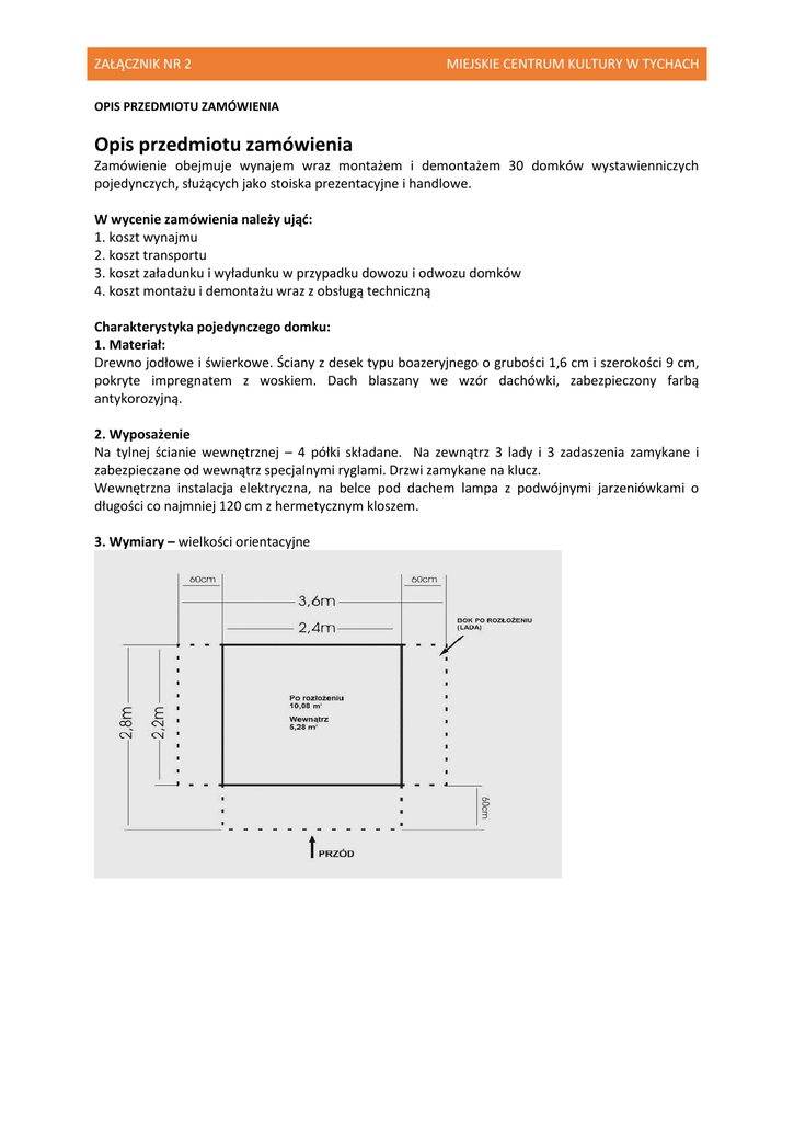 ZAŁĄCZNIK NR 2 MIEJSKIE CENTRUM KULTURY W TYCHACH OPIS PRZEDMIOTU ZAMÓWIENIA Opis przedmiotu zamówienia Zamówienie obejmuje wynajem wraz montażem i demontażem 30 domków wystawienniczych pojedynczych, służących jako stoiska prezentacyjne i handlowe. W wycenie zamówienia należy ująć: 1. koszt wynajmu 2. koszt transportu 3. koszt załadunku i wyładunku w przypadku dowozu i odwozu domków 4. koszt montażu i demontażu wraz z obsługą techniczną Charakterystyka pojedynczego domku: 1. Materiał: Drewno jodłowe i świerkowe. Ściany z desek typu boazeryjnego o grubości 1,6 cm i szerokości 9 cm, pokryte impregnatem z woskiem. Dach blaszany we wzór dachówki, zabezpieczony farbą antykorozyjną. 2. Wyposażenie Na tylnej ścianie wewnętrznej – 4 półki składane. Na zewnątrz 3 lady i 3 zadaszenia zamykane i zabezpieczane od wewnątrz specjalnymi ryglami. Drzwi zamykane na klucz. Wewnętrzna instalacja elektryczna, na belce pod dachem lampa z podwójnymi jarzeniówkami o długości co najmniej 120 cm z hermetycznym kloszem. 3. Wymiary – wielkości orientacyjne ZAŁĄCZNIK NR 2 Zdjęcia przykładowe MIEJSKIE CENTRUM KULTURY W TYCHACH