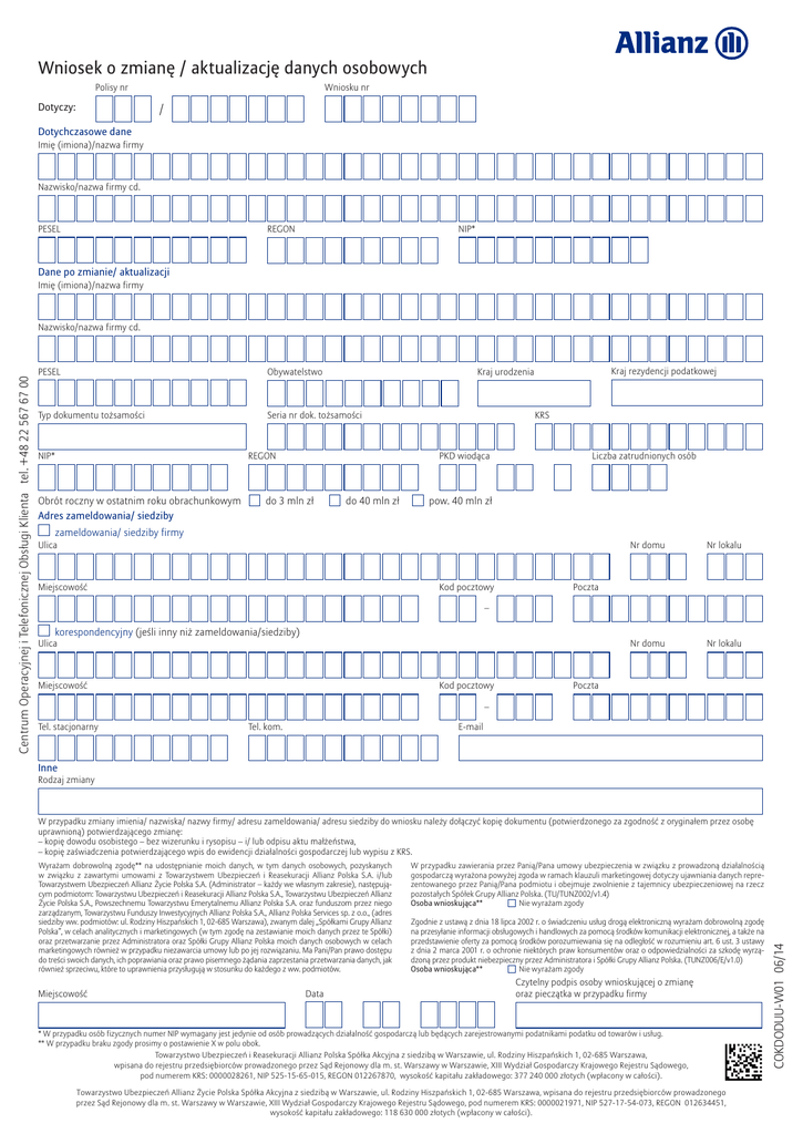Wniosek o zmianę / aktualizację danych osobowych Polisy nr Dotyczy: Wniosku nr / Dotychczasowe dane Imię (imiona)/nazwa firmy Nazwisko/nazwa firmy cd. PESEL REGON NIP* Dane po zmianie/ aktualizacji Imię (imiona)/nazwa firmy PESEL Obywatelstwo Typ dokumentu tożsamości Seria nr dok. tożsamości NIP* REGON Obrót roczny w ostatnim roku obrachunkowym Adres zameldowania/ siedziby KRS PKD wiodąca do 3 mln zł Kraj rezydencji podatkowej Kraj urodzenia do 40 mln zł Liczba zatrudnionych osób pow. 40 mln zł zameldowania/ siedziby firmy Ulica Miejscowość Kod pocztowy Nr domu Nr lokalu Nr domu Nr lokalu Poczta – korespondencyjny (jeśli inny niż zameldowania/siedziby) Ulica Miejscowość Kod pocztowy Poczta – Tel. stacjonarny Tel. kom. E-mail Inne Rodzaj zmiany W przypadku zmiany imienia/ nazwiska/ nazwy firmy/ adresu zameldowania/ adresu siedziby do wniosku należy dołączyć kopię dokumentu (potwierdzonego za zgodność z oryginałem przez osobę uprawnioną) potwierdzającego zmianę: – kopię dowodu osobistego – bez wizerunku i rysopisu – i/ lub odpisu aktu małżeństwa, – kopię zaświadczenia potwierdzającego wpis do ewidencji działalności gospodarczej lub wypisu z KRS. Wyrażam dobrowolną zgodę** na udostępnianie moich danych, w tym danych osobowych, pozyskanych w związku z zawartymi umowami z Towarzystwem Ubezpieczeń i Reasekuracji Allianz Polska S.A. i/lub Towarzystwem Ubezpieczeń Allianz Życie Polska S.A. (Administrator – każdy we własnym zakresie), następującym podmiotom: Towarzystwu Ubezpieczeń i Reasekuracji Allianz Polska S.A., Towarzystwu Ubezpieczeń Allianz Życie Polska S.A., Powszechnemu Towarzystwu Emerytalnemu Allianz Polska S.A. oraz funduszom przez niego zarządzanym, Towarzystwu Funduszy Inwestycyjnych Allianz Polska S.A., Allianz Polska Services sp. z o.o., (adres siedziby ww. podmiotów: ul. Rodziny Hiszpańskich 1, 02-685 Warszawa), zwanym dalej „Spółkami Grupy Allianz Polska”, w celach analitycznych i marketingowych (w tym zgodę na zestawianie moich danych przez te Spółki) oraz przetwarzanie przez Administratora oraz Spółki Grupy Allianz Polska moich danych osobowych w celach marketingowych również w przypadku niezawarcia umowy lub po jej rozwiązaniu. Ma Pani/Pan prawo dostępu do treści swoich danych, ich poprawiania oraz prawo pisemnego żądania zaprzestania przetwarzania danych, jak również sprzeciwu, które to uprawnienia przysługują w stosunku do każdego z ww. podmiotów. Miejscowość Data W przypadku zawierania przez Panią/Pana umowy ubezpieczenia w związku z prowadzoną działalnością gospodarczą wyrażona powyżej zgoda w ramach klauzuli marketingowej dotyczy ujawniania danych reprezentowanego przez Panią/Pana podmiotu i obejmuje zwolnienie z tajemnicy ubezpieczeniowej na rzecz pozostałych Spółek Grupy Allianz Polska. (TU/TUNZ002/v1.4) Nie wyrażam zgody Osoba wnioskująca** Zgodnie z ustawą z dnia 18 lipca 2002 r. o świadczeniu usług drogą elektroniczną wyrażam dobrowolną zgodę na przesyłanie informacji obsługowych i handlowych za pomocą środków komunikacji elektronicznej, a także na przedstawienie oferty za pomocą środków porozumiewania się na odległość w rozumieniu art. 6 ust. 3 ustawy z dnia 2 marca 2001 r. o ochronie niektórych praw konsumentów oraz o odpowiedzialności za szkodę wyrządzoną przez produkt niebezpieczny przez Administratora i Spółki Grupy Allianz Polska. (TUNZ006/E/v1.0) Nie wyrażam zgody Osoba wnioskująca** Czytelny podpis osoby wnioskującej o zmianę oraz pieczątka w przypadku firmy * W przypadku osób fizycznych numer NIP wymagany jest jedynie od osób prowadzących działalność gospodarczą lub będących zarejestrowanymi podatnikami podatku od towarów i usług. ** W przypadku braku zgody prosimy o postawienie X w polu obok. Towarzystwo Ubezpieczeń i Reasekuracji Allianz Polska Spółka Akcyjna z siedzibą w Warszawie, ul. Rodziny Hiszpańskich 1, 02-685 Warszawa, wpisana do rejestru przedsiębiorców prowadzonego przez Sąd Rejonowy dla m. st. Warszawy w Warszawie, XIII Wydział Gospodarczy Krajowego Rejestru Sądowego, pod numerem KRS: 0000028261, NIP 525-15-65-015, REGON 012267870, wysokość kapitału zakładowego: 377 240 000 złotych (wpłacony w całości). Towarzystwo Ubezpieczeń Allianz Życie Polska Spółka Akcyjna z siedzibą w Warszawie, ul. Rodziny Hiszpańskich 1, 02-685 Warszawa, wpisana do rejestru przedsiębiorców prowadzonego przez Sąd Rejonowy dla m. st. Warszawy w Warszawie, XIII Wydział Gospodarczy Krajowego Rejestru Sądowego, pod numerem KRS: 0000021971, NIP 527-17-54-073, REGON 012634451, wysokość kapitału zakładowego: 118 630 000 złotych (wpłacony w całości). COKDODUU-W01 06/14 Centrum Operacyjnej i Telefonicznej Obsługi Klienta tel. +48 22 567 67 00 Nazwisko/nazwa firmy cd.