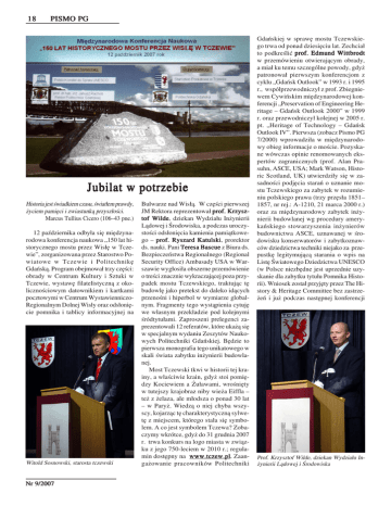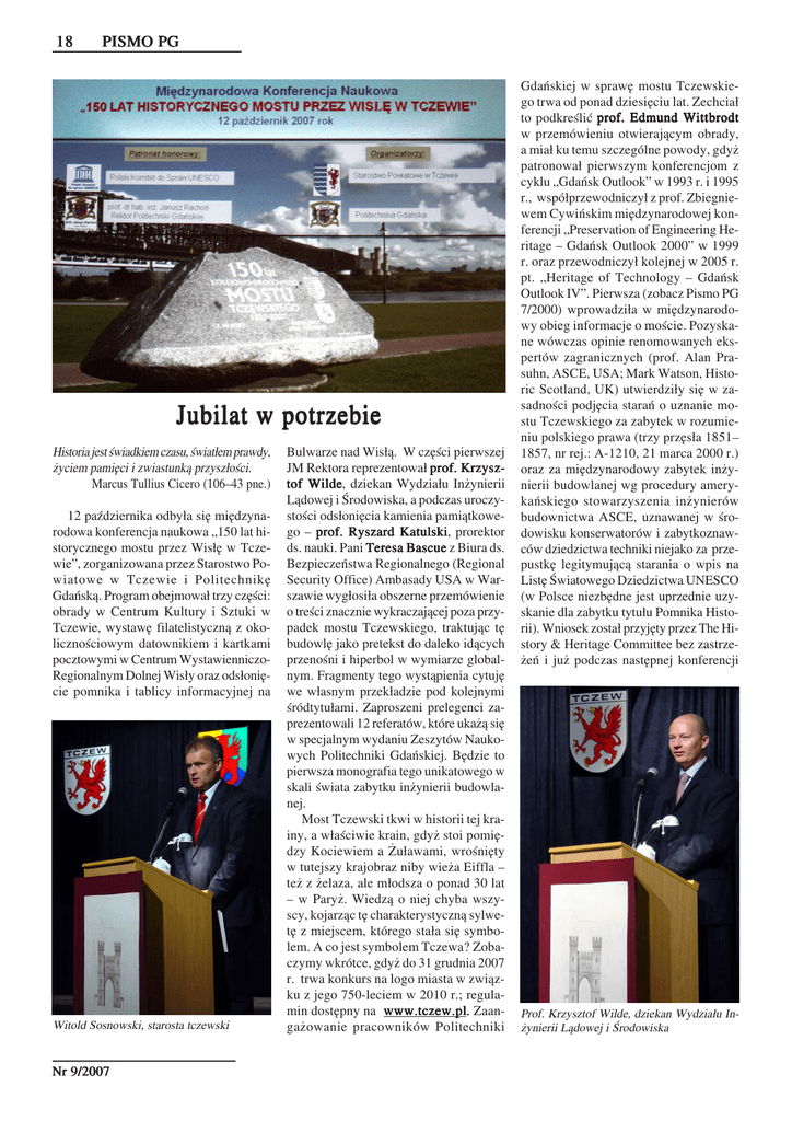 18 PISMO PG Jubilat w potrzebie Historia jest świadkiem czasu, światłem prawdy, życiem pamięci i zwiastunką przyszłości. Marcus Tullius Cicero (106–43 pne.) 12 października odbyła się międzyna− rodowa konferencja naukowa „150 lat hi− storycznego mostu przez Wisłę w Tcze− wie”, zorganizowana przez Starostwo Po− wiatowe w Tczewie i Politechnikę Gdańską. Program obejmował trzy części: obrady w Centrum Kultury i Sztuki w Tczewie, wystawę filatelistyczną z oko− licznościowym datownikiem i kartkami pocztowymi w Centrum Wystawienniczo− Regionalnym Dolnej Wisły oraz odsłonię− cie pomnika i tablicy informacyjnej na Witold Sosnowski, starosta tczewski Nr 9/2007 Bulwarze nad Wisłą. W części pierwszej JM Rektora reprezentował prof. Krzysz− tof Wilde Wilde, dziekan Wydziału Inżynierii Lądowej i Środowiska, a podczas uroczy− stości odsłonięcia kamienia pamiątkowe− go – prof. Ryszard Katulski Katulski, prorektor ds. nauki. Pani Teresa Bascue z Biura ds. Bezpieczeństwa Regionalnego (Regional Security Office) Ambasady USA w War− szawie wygłosiła obszerne przemówienie o treści znacznie wykraczającej poza przy− padek mostu Tczewskiego, traktując tę budowlę jako pretekst do daleko idących przenośni i hiperbol w wymiarze global− nym. Fragmenty tego wystąpienia cytuję we własnym przekładzie pod kolejnymi śródtytułami. Zaproszeni prelegenci za− prezentowali 12 referatów, które ukażą się w specjalnym wydaniu Zeszytów Nauko− wych Politechniki Gdańskiej. Będzie to pierwsza monografia tego unikatowego w skali świata zabytku inżynierii budowla− nej. Most Tczewski tkwi w historii tej kra− iny, a właściwie krain, gdyż stoi pomię− dzy Kociewiem a Żuławami, wrośnięty w tutejszy krajobraz niby wieża Eiffla – też z żelaza, ale młodsza o ponad 30 lat – w Paryż. Wiedzą o niej chyba wszy− scy, kojarząc tę charakterystyczną sylwe− tę z miejscem, którego stała się symbo− lem. A co jest symbolem Tczewa? Zoba− czymy wkrótce, gdyż do 31 grudnia 2007 r. trwa konkurs na logo miasta w związ− ku z jego 750−leciem w 2010 r.; regula− min dostępny na www.tczew.pl www.tczew.pl.. Zaan− gażowanie pracowników Politechniki Gdańskiej w sprawę mostu Tczewskie− go trwa od ponad dziesięciu lat. Zechciał to podkreślić prof. Edmund Wittbrodt w przemówieniu otwierającym obrady, a miał ku temu szczególne powody, gdyż patronował pierwszym konferencjom z cyklu „Gdańsk Outlook” w 1993 r. i 1995 r., współprzewodniczył z prof. Zbiegnie− wem Cywińskim międzynarodowej kon− ferencji „Preservation of Engineering He− ritage – Gdańsk Outlook 2000” w 1999 r. oraz przewodniczył kolejnej w 2005 r. pt. „Heritage of Technology – Gdańsk Outlook IV”. Pierwsza (zobacz Pismo PG 7/2000) wprowadziła w międzynarodo− wy obieg informacje o moście. Pozyska− ne wówczas opinie renomowanych eks− pertów zagranicznych (prof. Alan Pra− suhn, ASCE, USA; Mark Watson, Histo− ric Scotland, UK) utwierdziły się w za− sadności podjęcia starań o uznanie mo− stu Tczewskiego za zabytek w rozumie− niu polskiego prawa (trzy przęsła 1851– 1857, nr rej.: A−1210, 21 marca 2000 r.) oraz za międzynarodowy zabytek inży− nierii budowlanej wg procedury amery− kańskiego stowarzyszenia inżynierów budownictwa ASCE, uznawanej w śro− dowisku konserwatorów i zabytkoznaw− ców dziedzictwa techniki niejako za prze− pustkę legitymującą starania o wpis na Listę Światowego Dziedzictwa UNESCO (w Polsce niezbędne jest uprzednie uzy− skanie dla zabytku tytułu Pomnika Histo− rii). Wniosek został przyjęty przez The Hi− story & Heritage Committee bez zastrze− żeń i już podczas następnej konferencji Prof. Krzysztof Wilde, dziekan Wydziału In− żynierii Lądowej i Środowiska PISMO PG Prof. Wieland Ramm i prof. Edmund Wittbrodt otrzymują okolicznościowe upominki z rąk prezydenta Tczewa Zenona Odyi i starosty tczewskiego Witolda Sosnowskiego mogła odbyć się ceremonia odsłonięcia stosownej tablicy umocowanej na zabyt− kowej konstrukcji od strony przyczółka Lisewskiego z udziałem przedstawiciela UNESCO (zobacz: Pismo PG 6/2005). Zresztą Polski Komitet ds. UNESCO pa− tronował konferencji z cyklu „Gdańsk Outlook”. Dzisiaj właściwa informacja o zabytkowym moście Tczewskim widnie− je na wielu wiarygodnych stronach inter− netowych: http://en.structurae.de http://www.international.icomos.org http://www.brueckenweb.de http://www.asce.org/history/landmark/ Nie jest przesadą stwierdzenie, iż inter− pretacja i popularyzacja wartości kulturo− wych mostu Tczewskiego przez specjali− stów z Politechniki Gdańskiej pomogła władzom samorządowym w pozyskiwaniu środków finansowych na konieczne robo− ty budowlane, dzięki czemu most otwarto ponownie w 2001 r., po okresie całkowite− go wyłączenia z użytkowania. Notabene, aby uczestnicy konferencji we wrześniu 1999 r. mogli naocznie poznać szczegóły konstrukcyjne przęseł, trzeba było uzyskać pozwolenie władz, wykonać niezbędne prace zabezpieczające, a sam spacer po moście wykonać w asyście policji. Wów− czas mostowi Tczewskiemu groziło powtó− rzenie sytuacji z Wyszogrodu, gdzie tam− tejszy most drewniany przez Wisłę – jak powiadano, najdłuższy w świecie – roze− brano, pozbawiając Polskę tego inżynieryj− nego kuriozum i niewątpliwej atrakcji tu− rystycznej. Ponadto w obu przypadkach bu− downiczowie byli obcej proweniencji na− rodowej. Świadek czasu Wszystkie zaprojektowane i rozmiesz− czone w konstrukcji elementy wzajemnie od siebie zależą. Jeżeli jeden zawiedzie, cała struktura zawodzi. W międzynarodo− wych koalicjach, każdy element, bez względu na to, jak istotną rolę, przypisu− je mu budowniczy, jest ważny dla utrzy− mania jedności i stabilności niezbędnych do przetrwania w czasie. Prof. Wieland Ramm