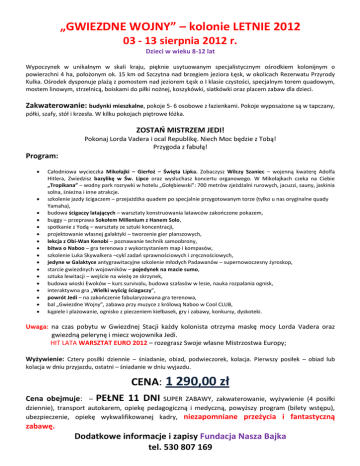 „GWIEZDNE WOJNY” – kolonie LETNIE 2012 03 - 13 sierpnia 2012 r. Dzieci w wieku 8-12 lat Wypoczynek w unikalnym w skali kraju, pięknie usytuowanym specjalistycznym ośrodkiem kolonijnym o powierzchni 4 ha, położonym ok. 15 km od Szczytna nad brzegiem jeziora Łęsk, w okolicach Rezerwatu Przyrody Kulka. Ośrodek dysponuje plażą z pomostem nad jeziorem Łęsk o I klasie czystości, specjalnym torem quadowym, mostem linowym, strzelnicą, boiskami do piłki nożnej, koszykówki, siatkówki oraz placem zabaw dla dzieci. Zakwaterowanie: budynki mieszkalne, pokoje 5- 6 osobowe z łazienkami. Pokoje wyposażone są w tapczany, półki, szafy, stół i krzesła. W kilku pokojach piętrowe łóżka. ZOSTAŃ MISTRZEM JEDI! Pokonaj Lorda Vadera i ocal Republikę. Niech Moc będzie z Tobą! Przygoda z fabułą! Program: Całodniowa wycieczka Mikołajki – Gierłoż – Święta Lipka. Zobaczysz Wilczy Szaniec – wojenną kwaterę Adolfa Hitlera, Zwiedzisz bazylikę w Św. Lipce oraz wysłuchasz koncertu organowego. W Mikołajkach czeka na Ciebie „Tropikana” – wodny park rozrywki w hotelu „Gołębiewski”: 700 metrów zjeżdżalni rurowych, jacuzzi, sauny, jaskinia solna, śnieżna i inne atrakcje. szkolenie jazdy ścigaczem – przejażdżka quadem po specjalnie przygotowanym torze (tylko u nas oryginalne quady Yamaha), budowa ścigaczy latających – warsztaty konstruowania latawców zakończone pokazem, buggy – przeprawa Sokołem Millenium z Hanem Solo, spotkanie z Yodą – warsztaty ze sztuki koncentracji, projektowanie własnej galaktyki – tworzenie gier planszowych, lekcja z Obi-Wan Kenobi – poznawanie technik samoobrony, bitwa o Naboo – gra terenowa z wykorzystaniem map i kompasów, szkolenie Luka Skywalkera –cykl zadań sprawnościowych i zręcznościowych, jedyne w Galaktyce antygrawitacyjne szkolenie młodych Padawanów – supernowoczesny żyroskop, starcie gwiezdnych wojowników – pojedynek na macie sumo, sztuka lewitacji – wejście na wieżę ze skrzynek, budowa wioski Ewoków – kurs survivalu, budowa szałasów w lesie, nauka rozpalania ognisk, interaktywna gra „Wielki wyścig ściagaczy”, powrót Jedi – na zakończenie fabularyzowana gra terenowa, bal „Gwiezdne Wojny”, zabawa przy muzyce z królową Naboo w Cool CLUB, kąpiele i plażowanie, ognisko z pieczeniem kiełbasek, gry i zabawy, konkursy, dyskoteki. Uwaga: na czas pobytu w Gwiezdnej Stacji każdy kolonista otrzyma maskę mocy Lorda Vadera oraz gwiezdną pelerynę i miecz wojownika Jedi. HIT LATA WARSZTAT EURO 2012 – rozegrasz Swoje własne Mistrzostwa Europy; Wyżywienie: Cztery posiłki dziennie – śniadanie, obiad, podwieczorek, kolacja. Pierwszy posiłek – obiad lub kolacja w dniu przyjazdu, ostatni – śniadanie w dniu wyjazdu. CENA: 1 290,00 zł Cena obejmuje: – PEŁNE 11 DNI SUPER ZABAWY, zakwaterowanie, wyżywienie (4 posiłki dziennie), transport autokarem, opiekę pedagogiczną i medyczną, powyższy program (bilety wstępu), ubezpieczenie, opiekę wykwalifikowanej kadry, niezapomniane przeżycia i fantastyczną zabawę. Dodatkowe informacje i zapisy Fundacja Nasza Bajka tel. 530 807 169