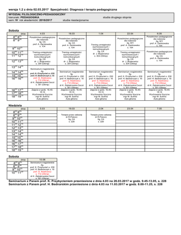 wersja 1.2 z dnia 02.03.2017 Specjalność: Diagnoza i terapia pedagogiczna WYDZIAŁ FILOLOGICZNO-PEDAGOGICZNY kierunek: PEDAGOGIKA sem: IV rok akademicki: 2016/2017 studia niestacjonarne studia drugiego stopnia Sobota dnia: 00 45 8 8 50 35 8 9 40 25 9 10 40 25 10 11 30 15 11 12 20 05 20 05 10 55 50 35 12 13 13 14 14 14 00 45 15 15 00 45 16 16 16 17 40 25 17 18 30 15 18 19 4.03 Poradnictwo pedagogiczne dla rodziców 3g. CA prof. A. Zamkowska s. 104 Trening umiejętności wychowawczych i komunikacyjnych 3g. CA dr J. Bojanowicz s. 304 (Olimp) Seminarium magisterskie 4g. prof. K. Przybycień s. 230 prof. H. Bednarczyk s. 16 prof. G. Kiedrowicz s. 712 (Olimp) dr K. Ziębakowska-Cecot s. 301 (Olimp) 18.03 Poradnictwo pedagogiczne dla rodziców 3g. CA prof. A. Zamkowska s. 104 Trening umiejętności wychowawczych i komunikacyjnych 3g. CA dr J. Bojanowicz s. 304 (Olimp) 1.04 Trening umiejętności wychowawczych i komunikacyjnych 6g. CA dr J. Bojanowicz s. 304 (Olimp) 22.04 Poradnictwo pedagogiczne dla rodziców 3g. WY prof. A. Zamkowska s. 104 6.05 Poradnictwo pedagogiczne dla rodziców 2g. WY prof. A. Zamkowska s. 104 Trening umiejętności wychowawczych i komunikacyjnych 3g. CA dr J. Bojanowicz s. 304 (Olimp) Poradnictwo pedagogiczne dla rodziców 4g. CA prof. A. Zamkowska s. 104 Zajęcia w godz. 16.4519.15 Wychowanie fizyczne mgr M. Sulima Aula główna Seminarium magisterskie 3g. prof. K. Przybycień s. 230 prof. H. Bednarczyk s. 16 prof. G. Kiedrowicz s. 712 (Olimp) dr K. Ziębakowska-Cecot s. 301 (Olimp) Zajęcia w godz. 16.4519.15 Wychowanie fizyczne mgr M. Sulima Aula główna Seminarium magisterskie 3g. prof. K. Przybycień s. 230 prof. H. Bednarczyk s. 16 prof. G. Kiedrowicz s. 712 (Olimp) dr K. Ziębakowska-Cecot s. 301 (Olimp) Zajęcia w godz. 16.4519.15 Wychowanie fizyczne mgr M. Sulima Aula główna Seminarium magisterskie 3g. prof. K. Przybycień s. 230 prof. H. Bednarczyk s. 16 prof. G. Kiedrowicz s. 712 (Olimp) dr K. Ziębakowska-Cecot s. 301 (Olimp) Zajęcia w godz. 16.4519.15 Wychowanie fizyczne mgr M. Sulima Aula główna Seminarium magisterskie 3g. prof. K. Przybycień s. 230 prof. H. Bednarczyk s. 16 prof. G. Kiedrowicz s. 712 (Olimp) dr K. Ziębakowska-Cecot s. 301 (Olimp) Zajęcia w godz. 16.4519.15 Wychowanie fizyczne mgr M. Sulima Aula główna 5.03 19.03 2.04 23.04 7.05 Terapia przez zabawę dr R.Piskorz 5g. CA s. 228 Terapia przez zabawę dr R.Piskorz 5g. CA s. 228 Niedziela dnia: 00 45 8 8 50 35 8 9 40 25 9 10 40 25 10 11 30 15 11 12 20 05 12 13 20 05 13 14 10 55 14 14 00 45 15 15 00 45 16 16 50 35 16 17 40 25 17 18 30 15 18 19 Sobota dnia: 00 45 8 8 50 35 8 9 40 25 9 10 40 25 10 11 10.06 Seminarium magisterskie 4g. prof. K. Przybycień s. 230 prof. H. Bednarczyk s. 16 prof. G. Kiedrowicz s. 712 (Olimp) dr K. Ziębakowska-Cecot s. 301 (Olimp) Seminarium z Panem prof. K. Przybycieniem przeniesione z dnia 4.03 na 26.03.2017 w godz. 9.45-13.05, s. 228 Seminarium z Panem prof. H. Bednarskim przeniesione z dnia 4.03 na 11.03.2017 w godz. 8.00-11.25, s. 228