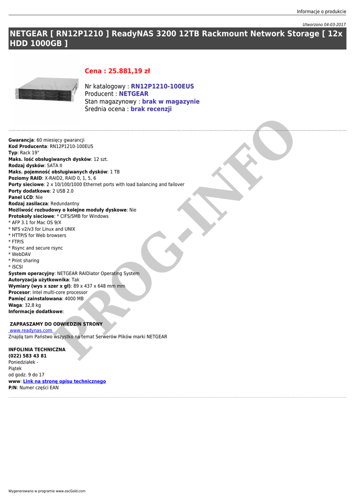 Informacje o produkcie Utworzono 04-03-2017 NETGEAR [ RN12P1210 ] ReadyNAS 3200 12TB Rackmount Network Storage [ 12x HDD 1000GB ] Cena : 25.881,19 zł PR O G -I N Gwarancja: 60 miesięcy gwarancji Kod Producenta: RN12P1210-100EUS Typ: Rack 19" Maks. lość obsługiwanych dysków: 12 szt. Rodzaj dysków: SATA II Maks. pojemność obsługiwanych dysków: 1 TB Poziomy RAID: X-RAID2, RAID 0, 1, 5, 6 Porty sieciowe: 2 x 10/100/1000 Ethernet ports with load balancing and failover Porty dodatkowe: 2 USB 2.0 Panel LCD: Nie Rodzaj zasilacza: Redundantny Możliwość rozbudowy o kolejne moduły dyskowe: Nie Protokoły sieciowe: * CIFS/SMB for Windows * AFP 3.1 for Mac OS 9/X * NFS v2/v3 for Linux and UNIX * HTTP/S for Web browsers * FTP/S * Rsync and secure rsync * WebDAV * Print sharing * iSCSI System operacyjny: NETGEAR RAIDiator Operating System Autoryzacja użytkownika: Tak Wymiary (wys x szer x gł): 89 x 437 x 648 mm mm Procesor: Intel multi-core processor Pamięć zainstalowana: 4000 MB Waga: 32,8 kg Informacje dodatkowe: FO Nr katalogowy : RN12P1210-100EUS Producent : NETGEAR Stan magazynowy : brak w magazynie Średnia ocena : brak recenzji ZAPRASZAMY DO ODWIEDZIN STRONY www.readynas.com Znajdą tam Państwo wszystko na temat Serwerów Plików marki NETGEAR INFOLINIA TECHNICZNA (022) 583 43 81 Poniedziałek Piątek od godz. 9 do 17 www: Link na stronę opisu technicznego P/N: Numer części EAN Wygenerowano w programie www.oscGold.com