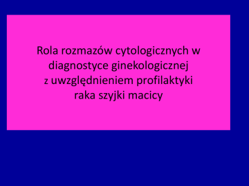 Rola rozmazów cytologicznych w diagnostyce ginekologicznej z uwzględnieniem profilaktyki raka szyjki macicy Cytologia złuszczeniowa Cytologia ginekologiczna należy do rodzaju cytologii złuszczeniowej. Oznacza to, że materiał poddawany ocenie został złuszczony spontanicznie lub zeskrobany specjalną szczoteczką. Cele badania cytologicznego: • Podstawowym i najważniejszym celem badania cytologicznego jest wykrycie zmian przedrakowych szyjki macicy oraz nieinwazyjnej postaci raka (rak in situ) szyjki macicy • Ocena efektywności leczenia onkologicznego i wczesne wykrywanie wznowy • Ocena stanów zapalnych i kontrola efektywności ich leczenia • Ocena hormonalna cyklu miesiączkowego oraz przebiegu ciąży Jak przygotować się do badania cytologicznego: • - na 4 dni przed badaniem nie stosować żadnych środków dopochwowych i irygacji • - na 24 godziny przed badaniem należy powstrzymać się od współżycia • - na 24 godz. przed badaniem cytologicznym nie należy poddawać się badaniu ginekologicznemu • - nie należy poddawać się badaniu cytologicznemu w krótkim czasie po zabiegach ginekologicznych • - nie pobiera się rozmazu podczas miesiączki Pamiętaj !!!!! 50% popełnionych w diagnostyce cytologicznej błędów wynika z nieprawidłowego przygotowania się pacjentki do badania Zalety badania cytologicznego • • • • • nie wymaga skierowania od lekarza. nie wymaga specjalistycznego przygotowania jest bezbolesne nie niesie za sobą ryzyka powikłań nie wymaga specjalnego postępowania po pobraniu materiału • może być wykonane u pacjentki w każdym wieku, dziewicy i kobiety w ciąży • badanie może być wykonane wielokrotnie i tak często jak wymaga tego sytuacja (jedynym ograniczeniem jest faza cyklu). • niski koszt badania i wysoka skuteczność Kiedy powinno się wykonać badanie cytologiczne • zalecenie lekarza • niepokojące objawy • kobiety z grupy wysokiego ryzyka raz na rok (HPV onkogenny ) • kobiety z grupy niskiego ryzyka raz na 2-3 lata • Kobiety w ciąży – dwa razy w ciągu ciąży – między 1 a 3 miesiącem i między 7 a 9 m-cem Nadżerka Nadżerka rzekoma( ectopia) – wywinięcie nabłonka gruczołowego na tarczę szyjki macicy Stan fizjologiczny nie wymaga leczenia Nadżerka prawdziwa – ubytek w strukturze nabłonka. Stan patologiczny , wymaga leczenia. Metaplazja zamiana jednego dojrzałego nabłonka w inny dojrzały nabłonek - efekt przewlekłego drażnienia - proces adaptacyjny - najczęściej zmiana odwracalna - przy dłuższym działaniu czynnika drażniącego może przejść w zmianę dysplastyczną Dysplazja ( wewnątrznabłonkowa neoplazja) • zaburzenie różnicowania komórek pociągające za sobą zaburzenia architektury nabłonka • zmiana odwracalna • zmiana z której potencjalnie może rozwinąć się rak • wraz ze stopniem dysplazji rośnie ryzyko rozwoju raka Budowa nabłonka wielowarstwowego płaskiego Błona podstawna oddziela nabłonek od podścieliska. - komórki bazalne (podstawne,rozrodcze ) - komórki parabazalne (przypodstawne) - komórki intermedialne (pośrednie) - komórki superficjalne (powierzchniowe) Okres przed pokwitaniem Po urodzeniu nabłonek wykazuje cechy dojrzewania – wpływ hormonów matczynych / in utero/ Po kilku dniach efekt ten zanika i nabłonek staje się niedojrzały (warstwa bazalna i parabazalna ). Taki nabłonek utrzymuje się aż do czasu dojrzewania Cykliczne zmiany w nabłonku płaskim w okresie dojrzałości płciowej • Nabłonek płaski dojrzewa pod wpływem cyklicznie wydzielanych żeńskich hormonów płciowych • progesteron - niepełne dojrzewanie do warstwy pośredniej ( w rozmazie przewaga komórek pośrednich) • estrogeny – pełne dojrzewanie do warstwy powierzchniowej ( przewaga komórek powierzchniowych) ZMIANY HORMONALNE NABŁONKA WIELOWARSTWOWEGO PŁASKIEGO • 1-6 dzień cyklu (miesiączka)-głównie intermedialne, erytrocyty i endometrialne • 6-14 dzień cyklu (faza proliferacji- ESTROGENY)dominują intermrdialne zastepowane stopniowo superficjalnymi, nieliczne endometrialne • 14-15 owulacja- prawie wyłącznie superficjalne • 15-24 wczesna faza sekrecji -PROGESTERON– zaczynają dominować intermedialne • 24-28 późna faza sekrecji – dominują intermedialne Menopauza Po menopauzie, na skutek zaniku funkcji wydzielniczej jajników nabłonek zanika (warstwa bazalna i parabazalna ) nabłonek atroficzny. • Do końca pierwszego trymestru komórki superficjalne mogą występowac w dużej ilosci w rozmazie. • Potem tylko komórki intermedialne a jeśli pojawiaja się superficjalne to może istniec zagrożenie poronieniem bo nadal działają estrogeny co należy zgłosic lekarzowi • Po 10 dniu cylku występowanie w rozmazie komórek endometrialnych może sugerowac ENDOMETRIOZĘ • Regurgitacja – WSTECZNA MENSTRUACJA „zarzucanie” komórek endometrium do jamy otrzewnowej via jajowód Komórki parabazalne Komórki intermedialne Komórki powierzchniowe Komórki gruczołowe • Komórki endocerwikalne – z kanału szyjki macicy • Komórki endometrialne – z trzonu macicy Komórki endocerwikalne Komórki endometrialne Komórki endometrialne Klasyfikacja Bethesda A. Ocena jakości rozmazu I. nadaje się do oceny II. warunkowa ocena rozmazu ( słaby technicznie np. podsuszony, brak komórek gruczołowych, zbyt liczne leukocyty, zbyt liczne erytrocyty ) III. Nie nadaje się do oceny ( zły technicznie, zbyt ubogokomórkowy, zbyt liczne leukocyty, zbyt liczne erytrocyty) Klasyfikacja Bethesda • B. Ocena stanu rozmazu I. Rozmaz prawidłowy- nie stwierdza się śródnabłonkowej neoplazji ani raka II. Rozmaz nieprawidłowy- stwierdza się nieprawidłowe komórki nabłonka Klasyfikacja Bethesda C. Część opisowa I, czynniki infekcyjne - grzyby - bakterie - pierwotniaki - wirusy II. Inne zmiany nienowotworowe - jatrogenne( radio- i chemioterapia) - obecność komórek endometrialnych u kobiet po 40 r.ż ( prz