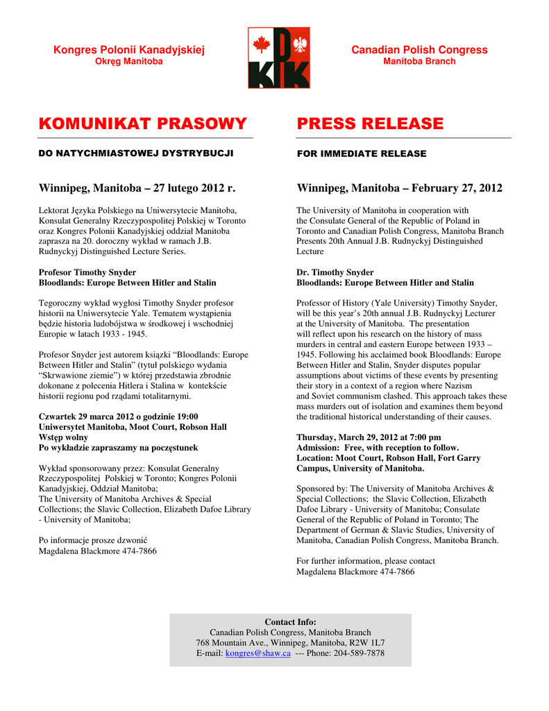 Kongres Polonii Kanadyjskiej Canadian Polish Congress Okręg Manitoba Manitoba Branch KOMUNIKAT PRASOWY PRESS RELEASE DO NATYCHMIASTOWEJ DYSTRYBUCJI FOR IMMEDIATE RELEASE Winnipeg, Manitoba – 27 lutego 2012 r. Winnipeg, Manitoba – February 27, 2012 Lektorat Języka Polskiego na Uniwersytecie Manitoba, Konsulat Generalny Rzeczypospolitej Polskiej w Toronto oraz Kongres Polonii Kanadyjskiej oddział Manitoba zaprasza na 20. doroczny wykład w ramach J.B. Rudnyckyj Distinguished Lecture Series. The University of Manitoba in cooperation with the Consulate General of the Republic of Poland in Toronto and Canadian Polish Congress, Manitoba Branch Presents 20th Annual J.B. Rudnyckyj Distinguished Lecture Profesor Timothy Snyder Bloodlands: Europe Between Hitler and Stalin Dr. Timothy Snyder Bloodlands: Europe Between Hitler and Stalin Tegoroczny wykład wygłosi Timothy Snyder profesor historii na Uniwersytecie Yale. Tematem wystąpienia będzie historia ludobójstwa w środkowej i wschodniej Europie w latach 1933 - 1945. Professor of History (Yale University) Timothy Snyder, will be this year’s 20th annual J.B. Rudnyckyj Lecturer at the University of Manitoba. The presentation will reflect upon his research on the history of mass murders in central and eastern Europe between 1933 – 1945. Following his acclaimed book Bloodlands: Europe Between Hitler and Stalin, Snyder disputes popular assumptions about victims of these events by presenting their story in a context of a region where Nazism and Soviet communism clashed. This approach takes these mass murders out of isolation and examines them beyond the traditional historical understanding of their causes. Profesor Snyder jest autorem ksiązki “Bloodlands: Europe Between Hitler and Stalin” (tytuł polskiego wydania “Skrwawione ziemie”) w której przedstawia zbrodnie dokonane z polecenia Hitlera i Stalina w kontekście historii regionu pod rządami totalitarnymi. Czwartek 29 marca 2012 o godzinie 19:00 Uniwersytet Manitoba, Moot Court, Robson Hall Wstęp wolny Po wykładzie zapraszamy na poczęstunek Wykład sponsorowany przez: Konsulat Generalny Rzeczypospolitej Polskiej w Toronto; Kongres Polonii Kanadyjskiej, Oddział Manitoba; The University of Manitoba Archives & Special Collections; the Slavic Collection, Elizabeth Dafoe Library - University of Manitoba; Po informacje prosze dzwonić Magdalena Blackmore 474-7866 Thursday, March 29, 2012 at 7:00 pm Admission: Free, with reception to follow. Location: Moot Court, Robson Hall, Fort Garry Campus, University of Manitoba. Sponsored by: The University of Manitoba Archives & Special Collections; the Slavic Collection, Elizabeth Dafoe Library - University of Manitoba; Consulate General of the Republic of Poland in Toronto; The Department of German & Slavic Studies, University of Manitoba, Canadian Polish Congress, Manitoba Branch. For further information, please contact Magdalena Blackmore 474-7866 Contact Info: Canadian Polish Congress, Manitoba Branch 768 Mountain Ave., Winnipeg, Manitoba, R2W 1L7 E-mail: [email protected] --- Phone: 204-589-7878
