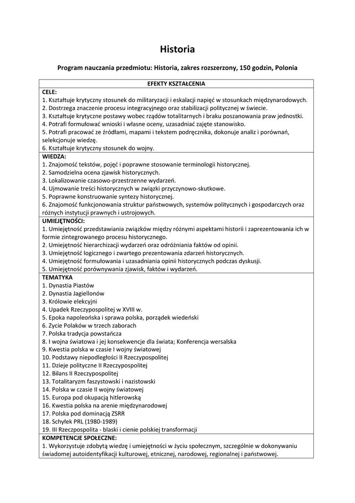 Historia Program nauczania przedmiotu: Historia, zakres rozszerzony, 150 godzin, Polonia EFEKTY KSZTAŁCENIA CELE: 1. Kształtuje krytyczny stosunek do militaryzacji i eskalacji napięć w stosunkach międzynarodowych. 2. Dostrzega znaczenie procesu integracyjnego oraz stabilizacji politycznej w świecie. 3. Kształtuje krytyczne postawy wobec rządów totalitarnych i braku poszanowania praw jednostki. 4. Potrafi formułować wnioski i własne oceny, uzasadniać zajęte stanowisko. 5. Potrafi pracować ze źródłami, mapami i tekstem podręcznika, dokonuje analiz i porównań, selekcjonuje wiedzę. 6. Kształtuje krytyczny stosunek do wojny. WIEDZA: 1. Znajomość tekstów, pojęć i poprawne stosowanie terminologii historycznej. 2. Samodzielna ocena zjawisk historycznych. 3. Lokalizowanie czasowo-przestrzenne wydarzeń. 4. Ujmowanie treści historycznych w związki przyczynowo-skutkowe. 5. Poprawne konstruowanie syntezy historycznej. 6. Znajomość funkcjonowania struktur państwowych, systemów politycznych i gospodarczych oraz różnych instytucji prawnych i ustrojowych. UMIEJĘTNOŚCI: 1. Umiejętność przedstawiania związków między różnymi aspektami historii i zaprezentowania ich w formie zintegrowanego procesu historycznego. 2. Umiejętność hierarchizacji wydarzeń oraz odróżniania faktów od opinii. 3. Umiejętność logicznego i zwartego prezentowania zdarzeń historycznych. 4. Umiejętność formułowania i uzasadniania opinii historycznych podczas dyskusji. 5. Umiejętność porównywania zjawisk, faktów i wydarzeń. TEMATYKA 1. Dynastia Piastów 2. Dynastia Jagiellonów 3. Królowie elekcyjni 4. Upadek Rzeczypospolitej w XVIII w. 5. Epoka napoleońska i sprawa polska, porządek wiedeński 6. Zycie Polaków w trzech zaborach 7. Polska tradycja powstańcza 8. I wojna światowa i jej konsekwencje dla świata; Konferencja wersalska 9. Kwestia polska w czasie I wojny światowej 10. Podstawy niepodległości II Rzeczypospolitej 11. Dzieje polityczne II Rzeczypospolitej 12. Bilans II Rzeczypospolitej 13. Totalitaryzm faszystowski i nazistowski 14. Polska w czasie II wojny światowej 15. Europa pod okupacją hitlerowską 16. Kwestia polska na arenie międzynarodowej 17. Polska pod dominacją ZSRR 18. Schyłek PRL (1980-1989) 19. III Rzeczpospolita - blaski i cienie polskiej transformacji KOMPETENCJE SPOŁECZNE: 1. Wykorzystuje zdobytą wiedzę i umiejętności w życiu społecznym, szczególnie w dokonywaniu świadomej autoidentyfikacji kulturowej, etnicznej, narodowej, regionalnej i państwowej. 2. Dostrzega wkład polskiej kultury i nauki do cywilizacji światowej. 3. Wykorzystuje rozumienie przyczyn istnienia związków lub ich braku między różnymi częściami świata i Europy w długich ciągach czasowych i w różnych dziedzinach społecznej aktywności danych ludów, narodów, państw i cywilizacji. 4. Wykorzystuje zdobytą wiedzę, przeciwdziała kreowaniu mitów i stereotypów. LITERATURA PODSTAWOWA: 1. Bogucka M., Historia Polski od 1864, Wrocław 1999 2. Dybkowska A., Żaryn J., Żaryn M., Polskie Dzieje, Warszawa 2002 3. Poczet królów i książąt polskich, pod red. A. Garlickiego, Warszawa 1980 4. Zarys historii Polski, pod red. J. Tazbira, Warszawa 1980 5. Jasienica P., Polska Piastów, Warszawa 1979 6. Jasienica P., Polska Jagiellonów, Warszawa 1979