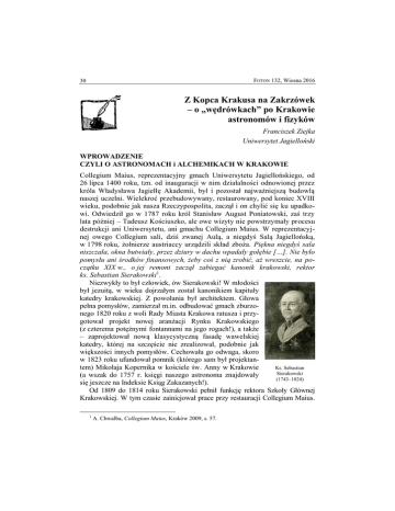 FOTON 132, Wiosna 2016 30 Z Kopca Krakusa na Zakrzówek – o „wędrówkach” po Krakowie astronomów i fizyków Franciszek Ziejka Uniwersytet Jagielloński WPROWADZENIE CZYLI O ASTRONOMACH i ALCHEMIKACH W KRAKOWIE Collegium Maius, reprezentacyjny gmach Uniwersytetu Jagiellońskiego, od 26 lipca 1400 roku, tzn. od inauguracji w nim działalności odnowionej przez króla Władysława Jagiełłę Akademii, był i pozostał najważniejszą budowlą naszej uczelni. Wielekroć przebudowywany, restaurowany, pod koniec XVIII wieku, podobnie jak nasza Rzeczypospolita, zaczął i on chylić się ku upadkowi. Odwiedził go w 1787 roku król Stanisław August Poniatowski, zaś trzy lata później – Tadeusz Kościuszko, ale owe wizyty nie powstrzymały procesu destrukcji ani Uniwersytetu, ani gmachu Collegium Maius. W reprezentacyjnej owego Collegium sali, dziś zwanej Aulą, a niegdyś Salą Jagiellońską, w 1798 roku, żołnierze austriaccy urządzili skład zboża. Piękna niegdyś sala niszczała, okna butwiały, przez dziury w dachu wpadały gołębie […]. Nie było pomysłu ani środków finansowych, żeby coś z nią zrobić, aż wreszcie, na początku XIX w., o jej remont zaczął zabiegać kanonik krakowski, rektor ks. Sebastian Sierakowski1. Niezwykły to był człowiek, ów Sierakowski! W młodości był jezuitą, w wieku dojrzałym został kanonikiem kapituły katedry krakowskiej. Z powołania był architektem. Głowa pełna pomysłów, zamierzał m.in. odbudować gmach zburzonego 1820 roku z woli Rady Miasta Krakowa ratusza i przygotował projekt nowej aranżacji Rynku Krakowskiego (z czterema potężnymi fontannami na jego rogach!), a także – zaprojektował nową klasycystyczną fasadę wawelskiej katedry, której na szczęście nie zrealizował, podobnie jak większości innych pomysłów. Cechowała go odwaga, skoro w 1823 roku ufundował pomnik (którego sam był projektantem) Mikołaja Kopernika w kościele św. Anny w Krakowie Ks. Sebastian Sierakowski (a wszak do 1757 r. księgi naszego astronoma znajdowały (1743–1824) się jeszcze na Indeksie Ksiąg Zakazanych!). Od 1809 do 1814 roku Sierakowski pełnił funkcję rektora Szkoły Głównej Krakowskiej. W tym czasie zainicjował prace przy restauracji Collegium Maius. 1 A. Chwalba, Collegium Maius, Kraków 2009, s. 57. FOTON 132, Wiosna 2016 31 W 1816 roku udało mu się pozyskać pierwszą dotację na ten cel, dzięki czemu wzmocniono strop Sali Jagiellońskiej (Auli). W 1821 roku podjął inne wielkie wyzwanie: zwrócił się do swojego następcy, rektora Walentego Litwińskiego, z propozycją ozdobienia – na własny koszt! – Sali Jagiellońskiej obrazami historycznymi z dziejów Uniwersytetu. Rektor Litwiński zgodził się, toteż kanonik Sierakowski przygotował program ikonograficzny, według którego Michał Stachowicz, najbardziej wzięty naówczas malarz krakowski, wykonał polichromię Sali, w której przez całe wieki odbywały się wykłady, ale i uroczyste promocje doktorskie. Pomysł i fundusze jednego, a talent drugiego sprawiły, że w 1821 roku Sala Jagiellońska została przekształcona w swoistą Księgę Dziejów Akademii Krakowskiej. W jedenastu wielkich obrazach i kilkudziesięciu mniejszych Stachowicz zamknął jej trzywiekową historię: od założenia aż po czasy potopu szwedzkiego. Co więcej, wystrój Sali wzbogacił kilkudziesięcioma portretami królów, uczonych i dobrodziejów Akademii2. Wspominam tu o tej sprawie, bowiem przy tej okazji niejako oficjalnie wprowadzono na karty historii naszej Wszechnicy jednego z „ojców duchowych” dzisiejszego Wydziału Fizyki, Astronomii i Informatyki Stosowanej Uniwersytetu Jagiellońskiego: astronoma Witelona z XIII wieku, którego autorzy pomysłu połączyli z postacią „krakowskiego” czarnoksiężnika – Twardowskiego. Okazuje się, że na jednym z przywołanych wyżej jedenastu obrazów Stachowicz pokazał Witelona prowadzącego obserwacje Słońca z Kopca Krakusa! W objaśnieniu tego dzieła, zamieszczoMichał Stachowicz, Vitelion nym w piśmie „Pszczółka Krakowska” Twardowski na Kopcu Krakusa z 1821 roku, Konstanty Majeranowski pisał: W szczupłym zajęciu ściany przy oknie umieszczony jest widok mogiły Krakusa, na której Vitelion Twardowski, astronomii jeszcze w XIII wieku sławny nauczyciel, przez narzędzie astronomiczne czyni obserwację słońca, a z uczniów po stronie jeden przez szkło optyczne zapala słomę, którą inny z daleka na kiju wyniesioną trzyma. Na równinie nad mogiłą widać domek drewniany, gdzie, jak niesie podanie, zamykał się Twar- 2 Szczegółowe opracowanie tego dzieła można znaleźć u Zbigniewa Michalczyka: Michał Stachowicz 1768–1825. Krakowski malarz między barokiem a romantyzmem, Warszawa 2011, t. I, s. 145–146. Wcześniej pisał o tym dziele Stachowicza Jerzy Dobrzycki w rozprawie pt. Dzieje Almae Matris pendzla Michała Stachowicza, Kraków 1925. 32 FOTON 132, Wiosna 2016 dowski dla czynienia swoich rachub i przechowywał narzędzia. Domek ten zwany był „Szkołą Twardowskiego”3. Witelon (Vitellion), sławny w całej Europie astronom i twórca optyki z XIII wieku, pochodził z Dolnego Śląska, a właściwie – z Legnicy4. Józef Sołtykowicz, który dał mu nawet polskie nazwisko Erazma Ciołka, nie wykluczał, że Witelon pochodził z Krakowa – co było już jednak pełną fantazją tego autora. Opowieść o Witelonie–Twardowskim na swój sposób dokumentowała istnienie na Zachodzie Europy, głównie w Niemczech, sławy Akademii Krakowskiej jako ośrodka uprawiania i nauczania czarnej magii. Sławy, którą podtrzymywała m.in. spisana w 1587 roku przez Johanna Spiessa Historia doktora Jana Fausta, szeroko okrzyczanego czarnoksiężnika i maga. Autor tej książki podobno przekonywał czytelników, że Faust w młodości wybrał się do Krakowa, do słynnej przed laty z czarnoksięstwa akademii i znalazł tamże jemu podobnych, którzy pojawili się tam, aby p