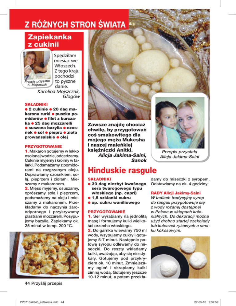 Z RÓŻNYCH STRON ŚWIATA Zapiekanka z cukinii Spędziłam miesiąc we Włoszech. Z tego kraju pochodzi to pyszne Przepis przysłała K. Mojszczak danie. Karolina Mojszczak, Głogów SKŁADNIKI ● 2 cukinie ● 20 dag makaronu rurki ● puszka pomidorów ● filet z kurczaka ● 25 dag mozzarelli ● suszona bazylia ● czosnek ● sól ● pieprz ● zioła prowansalskie ● olej PRZYGOTOWANIE 1. Makaron gotujemy w lekko osolonej wodzie, odcedzamy. Cukinie myjemy i kroimy w talarki. Podsmażamy z pomidorami na rozgrzanym oleju. Doprawiamy czosnkiem, solą, pieprzem i ziołami. Mieszamy z makaronem. 2. Mięso myjemy, osuszamy, oprószamy solą i pieprzem, podsmażamy na oleju i mieszamy z makaronem. Przekładamy do naczynia żaroodpornego i przykrywamy plastrami mozzarelli. Posypujemy bazylią. Zapiekamy ok. 25 minut w temp. 200 °C. Zawsze znajdę chociaż chwilę, by przygotować coś smakowitego dla mojego męża Mukesha i naszej maleńkiej księżniczki Anitki. Alicja Jakima-Saini, Sanok Przepis przysłała Alicja Jakima-Saini Hinduskie rasgule SKŁADNIKI ● 30 dag niezbyt kwaśnego sera twarogowego typu włoskiego (np. capri) ● 1,5 szklanki cukru ● op. cukru waniliowego PRZYGOTOWANIE 1. Ser wyrabiamy na jednolitą masę i formujemy kulki wielkości orzecha włoskiego. 2. Do garnka wlewamy 750 ml wody, wsypujemy cukry i gotujemy 5-7 minut. Następnie połowę syropu odlewamy do miseczki. Do reszty wkładamy kulki, uważając, aby się nie stykały. Gotujemy pod przykryciem ok. 10 minut. Zmniejszamy ogień i skrapiamy kulki zimną wodą. Gotujemy jeszcze 10-12 minut, a potem przekła- damy do miseczki z syropem. Odstawiamy na ok. 4 godziny. RADY Alicji Jakimy-Saini W Indiach tradycyjny syrop do rasguli przygotowuje się z wody różanej dostępnej w Polsce w sklepach kolonialnych. Do dekoracji można użyć drobno startej czekolady lub kuleczek ryżowych o smaku kokosowym. 44 Przyślij przepis PP0710s4245_zeSwiata.indd 44 27-05-10 9:37:59