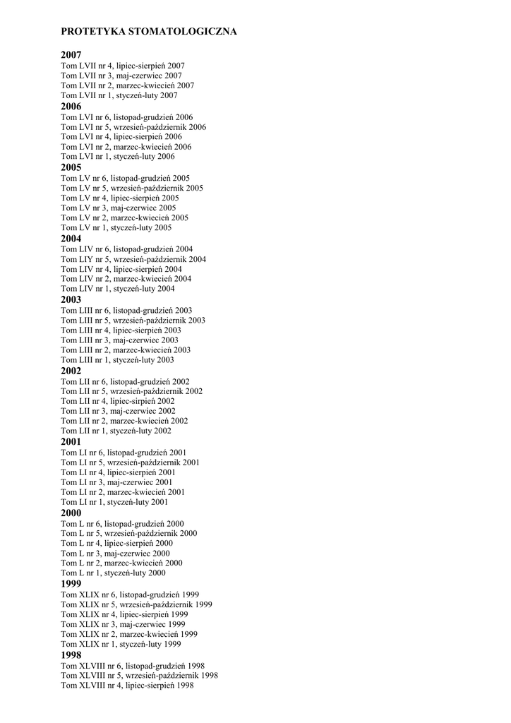 PROTETYKA STOMATOLOGICZNA 2007 Tom LVII nr 4, lipiec-sierpień 2007 Tom LVII nr 3, maj-czerwiec 2007 Tom LVII nr 2, marzec-kwiecień 2007 Tom LVII nr 1, styczeń-luty 2007 2006 Tom LVI nr 6, listopad-grudzień 2006 Tom LVI nr 5, wrzesień-październik 2006 Tom LVI nr 4, lipiec-sierpień 2006 Tom LVI nr 2, marzec-kwiecień 2006 Tom LVI nr 1, styczeń-luty 2006 2005 Tom LV nr 6, listopad-grudzień 2005 Tom LV nr 5, wrzesień-październik 2005 Tom LV nr 4, lipiec-sierpień 2005 Tom LV nr 3, maj-czerwiec 2005 Tom LV nr 2, marzec-kwiecień 2005 Tom LV nr 1, styczeń-luty 2005 2004 Tom LIV nr 6, listopad-grudzień 2004 Tom LIY nr 5, wrzesień-październik 2004 Tom LIV nr 4, lipiec-sierpień 2004 Tom LIV nr 2, marzec-kwiecień 2004 Tom LIV nr 1, styczeń-luty 2004 2003 Tom LIII nr 6, listopad-grudzień 2003 Tom LIII nr 5, wrzesień-październik 2003 Tom LIII nr 4, lipiec-sierpień 2003 Tom LIII nr 3, maj-czerwiec 2003 Tom LIII nr 2, marzec-kwiecień 2003 Tom LIII nr 1, styczeń-luty 2003 2002 Tom LII nr 6, listopad-grudzień 2002 Tom LII nr 5, wrzesień-październik 2002 Tom LII nr 4, lipiec-sirpień 2002 Tom LII nr 3, maj-czerwiec 2002 Tom LII nr 2, marzec-kwiecień 2002 Tom LII nr 1, styczeń-luty 2002 2001 Tom LI nr 6, listopad-grudzień 2001 Tom LI nr 5, wrzesień-październik 2001 Tom LI nr 4, lipiec-sierpień 2001 Tom LI nr 3, maj-czerwiec 2001 Tom LI nr 2, marzec-kwiecień 2001 Tom LI nr 1, styczeń-luty 2001 2000 Tom L nr 6, listopad-grudzień 2000 Tom L nr 5, wrzesień-październik 2000 Tom L nr 4, lipiec-sierpień 2000 Tom L nr 3, maj-czerwiec 2000 Tom L nr 2, marzec-kwiecień 2000 Tom L nr 1, styczeń-luty 2000 1999 Tom XLIX nr 6, listopad-grudzień 1999 Tom XLIX nr 5, wrzesień-październik 1999 Tom XLIX nr 4, lipiec-sierpień 1999 Tom XLIX nr 3, maj-czerwiec 1999 Tom XLIX nr 2, marzec-kwiecień 1999 Tom XLIX nr 1, styczeń-luty 1999 1998 Tom XLVIII nr 6, listopad-grudzień 1998 Tom XLVIII nr 5, wrzesień-październik 1998 Tom XLVIII nr 4, lipiec-sierpień 1998 Tom XLVIII nr 3, maj-czerwiec 1998 Tom XLVIII nr 2, marzec-kwiecień 1998 Tom XLVIII nr 1, styczeń-luty 1998 1997 Tom XLVII nr 6, listopad-grudzień 1997 Tom XLVII nr 5, wrzesień-październik 1997 Tom XLVII nr 4, lipiec-sierpień 1997 Tom HLVII nr 3, maj-czerwiec 1997 Tom XLVII nr 2, marzec-kwiecień 1997 Tom XLVII nr 1, styczeń-luty 1997 1996 Tom XLVI nr 6, listopad-grudzień 1996 Tom XLVI nr 5, wrzesień-październik 1996 Tom XLVI nr 4, lipiec-sierpień 1996 Tom XLVI nr 3, maj-czerwiec 1996 Tom XLVI nr 2, marzec-kwiecień 1996 Tom XLVI nr 1, styczeń-luty 1996 1995 Tom XLV nr 6, listopad-grudzień 1995 Tom XLV nr 5, wrzesień-październik 1995 Tom XLV nr 4, lipiec-sierpień 1995 Tom XLV nr 3, maj-czerwiec 1995 Tom XLV nr 2, marzec-kwiecień 1995 Tom XLV nr 1, styczeń-luty 1995 1994 Tom XLIV nr 6, listopad-grudzień 1994 Tom XLIV nr 5, wrzesień-październik 1994 Tom XLIV nr 4, lipiec-sierpień 1994 Tom XLIV nr 3, maj-czerwiec 1994 Tom XLIV nr 2, marzec-kwiecień 1994 Tom XLIV nr 1, styczeń-luty 1994