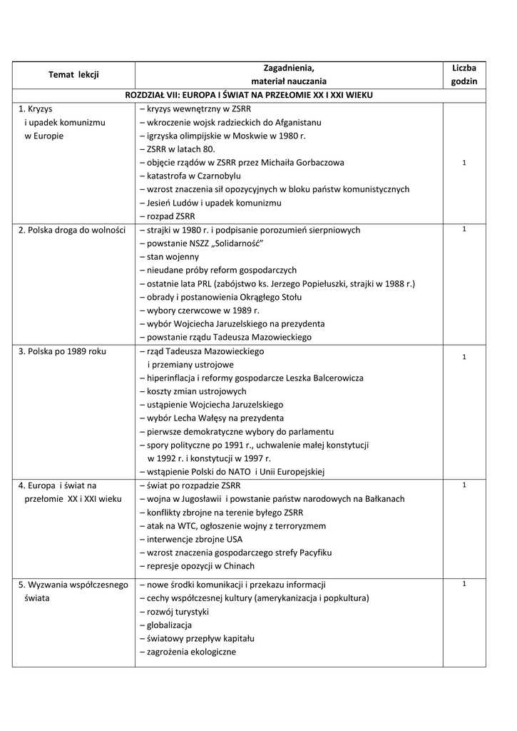 Zagadnienia, materiał nauczania ROZDZIAŁ VII: EUROPA I ŚWIAT NA PRZEŁOMIE XX I XXI WIEKU 1. Kryzys – kryzys wewnętrzny w ZSRR i upadek komunizmu – wkroczenie wojsk radzieckich do Afganistanu w Europie – igrzyska olimpijskie w Moskwie w 1980 r. – ZSRR w latach 80. – objęcie rządów w ZSRR przez Michaiła Gorbaczowa – katastrofa w Czarnobylu – wzrost znaczenia sił opozycyjnych w bloku paostw komunistycznych – Jesieo Ludów i upadek komunizmu – rozpad ZSRR 2. Polska droga do wolności – strajki w 1980 r. i podpisanie porozumieo sierpniowych – powstanie NSZZ „Solidarnośd” – stan wojenny – nieudane próby reform gospodarczych – ostatnie lata PRL (zabójstwo ks. Jerzego Popiełuszki, strajki w 1988 r.) – obrady i postanowienia Okrągłego Stołu – wybory czerwcowe w 1989 r. – wybór Wojciecha Jaruzelskiego na prezydenta – powstanie rządu Tadeusza Mazowieckiego 3. Polska po 1989 roku – rząd Tadeusza Mazowieckiego i przemiany ustrojowe – hiperinflacja i reformy gospodarcze Leszka Balcerowicza – koszty zmian ustrojowych – ustąpienie Wojciecha Jaruzelskiego – wybór Lecha Wałęsy na prezydenta – pierwsze demokratyczne wybory do parlamentu – spory polityczne po 1991 r., uchwalenie małej konstytucji w 1992 r. i konstytucji w 1997 r. – wstąpienie Polski do NATO i Unii Europejskiej 4. Europa i świat na – świat po rozpadzie ZSRR przełomie XX i XXI wieku – wojna w Jugosławii i powstanie paostw narodowych na Bałkanach – konflikty zbrojne na terenie byłego ZSRR – atak na WTC, ogłoszenie wojny z terroryzmem – interwencje zbrojne USA – wzrost znaczenia gospodarczego strefy Pacyfiku – represje opozycji w Chinach Temat lekcji 5. Wyzwania współczesnego świata – nowe środki komunikacji i przekazu informacji – cechy współczesnej kultury (amerykanizacja i popkultura) – rozwój turystyki – globalizacja – światowy przepływ kapitału – zagrożenia ekologiczne Liczba godzin 1 1 1 1 1 – wzrost kontrastów społecznych – zderzenie cywilizacji i rodzące się konflikty 6. Powtórzenie wiadomości 7. Sprawdzian 1 1