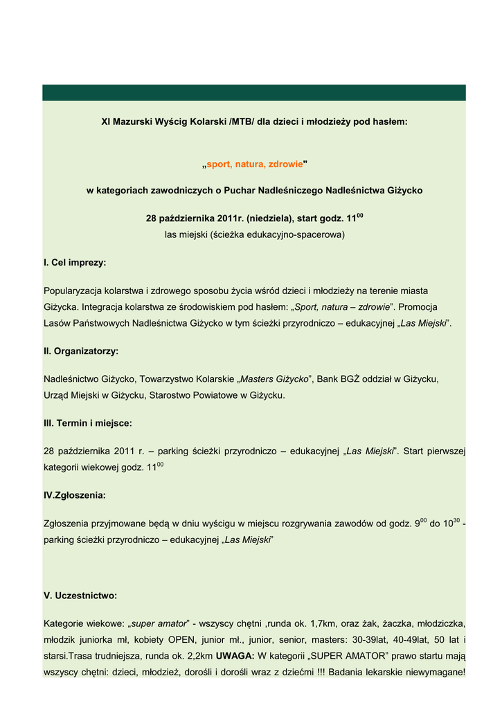 XI Mazurski Wyścig Kolarski /MTB/ dla dzieci i młodzieży pod hasłem: „sport, natura, zdrowie" w kategoriach zawodniczych o Puchar Nadleśniczego Nadleśnictwa Giżycko 28 października 2011r. (niedziela), start godz. 1100 las miejski (ścieżka edukacyjno-spacerowa) I. Cel imprezy: Popularyzacja kolarstwa i zdrowego sposobu życia wśród dzieci i młodzieży na terenie miasta Giżycka. Integracja kolarstwa ze środowiskiem pod hasłem: „Sport, natura – zdrowie”. Promocja Lasów Państwowych Nadleśnictwa Giżycko w tym ścieżki przyrodniczo – edukacyjnej „Las Miejski”. II. Organizatorzy: Nadleśnictwo Giżycko, Towarzystwo Kolarskie „Masters Giżycko”, Bank BGŻ oddział w Giżycku, Urząd Miejski w Giżycku, Starostwo Powiatowe w Giżycku. III. Termin i miejsce: 28 października 2011 r. – parking ścieżki przyrodniczo – edukacyjnej „Las Miejski”. Start pierwszej kategorii wiekowej godz. 1100 IV.Zgłoszenia: Zgłoszenia przyjmowane będą w dniu wyścigu w miejscu rozgrywania zawodów od godz. 9 00 do 1030 parking ścieżki przyrodniczo – edukacyjnej „Las Miejski” V. Uczestnictwo: Kategorie wiekowe: „super amator” - wszyscy chętni ,runda ok. 1,7km, oraz żak, żaczka, młodziczka, młodzik juniorka mł, kobiety OPEN, junior mł., junior, senior, masters: 30-39lat, 40-49lat, 50 lat i starsi.Trasa trudniejsza, runda ok. 2,2km UWAGA: W kategorii „SUPER AMATOR” prawo startu mają wszyscy chętni: dzieci, młodzież, dorośli i dorośli wraz z dziećmi !!! Badania lekarskie niewymagane! Posiadanie kasku mile widziane!! Za ukończenie wyścigu każdy zawodnik otrzyma pamiątkowy medal. (trasa i tempo super spacerowe, runda ok.1,7km) VI. Zasady rozgrywania wyścigu: 1. W kategorii super amator liczy się ukończenie wyścigu. 2. Dla zawodników licencjonowanych wyścig zostanie rozegrany tylko w klasyfikacji indywidualnej 3. Sędzia główny określi dla każdej kat wiekowej ilość okrążeń do przejechania 4. W zależności od ilości zawodników w kat. junior, senior i masters mogą one zostać połączone w jeden wyścig z uwzględnieniem odrębnej klasyfikacji w każdej kategorii. VII.Nagrody: Kat. „super amator” – medal pamiątkowy za ukończenie wyścigu!!! W każdej kategorii wiekowej zawodników licencjonowanych: I–III miejsce puchar. VIII. Ramowy program Zawodów: Przyjazd i zgłoszenia zawodników 900-1030 Odprawa techniczna 1035-1045 Uroczyste otwarcie zawodów 1050-1055 Start kat. SUPER AMATOR 1100 Pokaz ratownictwa medycznego (MOPR) Dekoracja Super Amatorów Następnie: Start: żak, żaczka, młodziczka, młodzik juniorka mł, kobiety OPEN, junior mł. junior, senior, masters: 30-39lat, 40-49lat, 50 lat i starsi Uroczyste zakończenie zawodów, dekoracja, ognisko z kiełbaskami. UWAGA: Program ramowy może ulec zmianie w zależności od ilości startujących zawodników!!! IX. Postanowienia końcowe: Wyścig zostanie przeprowadzony zgodnie z przepisami PZKol. Zawodnicy obowiązkowo startują w kaskach sztywnych. Organizator nie ponosi odpowiedzialności za wypadki powstałe na trasie wyścigu, oraz za rzeczy zagubione i ukradzione We wszystkich sprawach spornych nie objętych niniejszym regulaminem decyduje Sędzią Główny zawodników w porozumieniu z organizatorem. Odpowiedzialny za przeprowadzenie zawodów z ramienia organizatora jest prezes TK „Masters Giżycko” Jerzy Gawarecki. Tel. 502 841 033 e-mail: [email protected] Uwaga: zawody odbędą się bez względu na pogodę. Życzymy wiele radości ze sportowej rywalizacji !!! Mapka dojazdu do miejsca startu. Parking ścieżki przyrodniczo –edukacyjnej „Las Miejski”