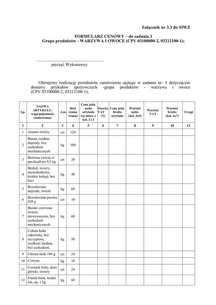 Załącznik nr 3.3 do SIWZ FORMULARZ CENOWY – do zadania 3 Grupa produktów - WARZYWA I OWOCE (CPV 03100000-2, 03212100-1); .............................................................. pieczęć Wykonawcy Oferujemy realizację przedmiotu zamówienia ujętego w zadaniu nr: 3 dotyczącym dostawy artykułów spożywczych -grupa produktów - warzywa i owoce (CPV 03100000-2, 03212100-1); Lp. NAZWA ARTYKUŁU, waga/pojemność (zamawiana) 1 2 Cena jedn. Ilość netto Stawka Cena jedn. J.m. (zama artykułu VAT brutto wiana) wg miary z /%/ artykułu kol. 2 i 3 3 4 1 Ananas świeży szt 120 2 Banan, średnio dojrzały, bez uszkodzeń mechanicznych kg 100 3 Botwina świeża w pęczkach po 0,5 kg szt 20 4 Brokuł, świeży, nieuszkodzony, krótkie łodygi, bez liści kg 40 5 Brzoskwinie dojrzałe, świeże kg 60 6 Brzoskwinia puszka szt 820 g 10 7 Buraki czerwone świeże, niewysuszone, bez uszkodzeń mechanicznych kg 60 8 Cebula biała cukrówka, bez szczypioru, wielkość średnia, bez uszkodzeń, kg 50 9 Chrzan słoik 180 g szt 24 kg 10 11 Czosnek biały, duże szt główki, świeży 24 12 Fasola biała, średni Jaś, op. 1 kg 60 10 Cytryna kg 5 6 7 Wartość netto (kol. 4x5) Wartość VAT Wartość brutto (kol. 4x7) Uwagi 8 9 10 11 13 Fasola szparagowa zielona, świeża kg 30 14 Gruszki dojrzałe kg 60 15 Groch łuskany kg 18 Groszek 16 konserwowy 400 g, puszka szt 30 Grzyby suszone op. 20 g szt 20 Jabłka średniej wielkości, 18 nieuszkodzone, świeże kg 50 19 Kapusta młoda kg 60 Kaki, owoce 20 świeże, dojrzałe, nieuszkodzone kg 45 Kalafior, róża kalafiora czysta, duża, 21 nieuszkodzona, małe liście, krótkie łodygi, świeży kg 15 Kapusta biała słodka, główki 22 duże, nieobsuszone, świeże kg 60 Kapusta czerwona, główki średnie, 23 świeże, bez uszkodzeń kg 40 Kapusta kiszona w wiadrach 24 plastikowych po 5 kg kg 100 Kapusta pekińska, 25 główki średnie, świeża kg 50 Kiwi, dojrzałe, 26 świeże, nieuszkodzone kg 25 Koperek zielony, świeży, 27 nieobsuszony, w pęczku po 100 g szt 50 Kukurydza 28 konserwowa puszka szt 400g 45 17 29 Mandarynki, średnie, słodkie Marchew świeża, 30 jędrna, nieuszkodzona kg 80 kg 240 Mięta świeża w pojemniku szt 20 Natka pietruszki w 32 pęczkach po 100 g, świeża szt 130 Nektarynki, 33 dojrzałe, soczyste, bez uszkodzeń kg 60 Ogórek kiszony, średniej wielkości, 34 twardy, w wiadrach plastikowych po 10 kg kg 50 Ogórek zielony świeży, bez 35 uszkodzeń mechanicznych kg 40 Papryka czerwona 36 świeża, nieuszkodzona kg 10 Pieczarki białe, 37 średniej wielkości, świeże kg 45 Pietruszka korzeń, świeża, jędrna, kg 80 Pomarańcze, 39 średnie, słodkie, nieuszkodzone kg 50 Pomidory, świeże, 40 dojrzałe, nieuszkodzone kg 40 41 Pomidory krojone puszka 400 g szt 30 42 Pomidory całe puszka 400 g szt 10 Przecier pomidorowy typu 43 Pudliszki op. 500 g szt szt 80 Por sałatowy duży, niewysuszony, 44 nieuszkodzony, świeży kg 60 Rodzynki, opakowanie 100 g szt 24 Rzodkiewka, świeża, główki 46 średnie, nieuszkodzone w pęczkach po 200 g szt 40 Sałata lodowa, świeża, 47 nieuszkodzona mechanicznie szt 30 31 38 45 Sałata zielona, 48 świeża, liście nieuszkodzone szt 40 kg 80 Szczaw 50 konserwowy w słoiku 280 g szt 20 Szczaw świeży pęczek 100g szt 30 Szczypior zielony, świeży, 52 nieobsuszony, w pęczku po 100 g szt 10 Śliwki suszone op. 150 g szt 10 Truskawki 54 dojrzałe, nieuszkodzone kg 50 Winogrona 55 soczyste, bez uszkodzeń kg 35 56 Ziemniaki młode kg 700 Ziemniaki białe, duże bulwy, 57 nieuszkodzone, czyste, nienadmarznięte kg 1500 49 51 53 Seler duży, świeży, nieuszkodzony Razem: Słownie razem wartość netto: ………………………………………………………………….. ………………………………………………………………….. Słownie razem wartość brutto: …………………………………………………………………. …………………………………………………………………. …………………dnia……………. Podpisy osób uprawnionych do reprezentacji Wykonawcy lub Pełnomocnika