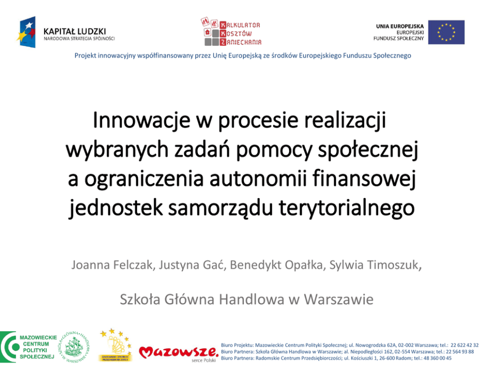 Projekt innowacyjny współfinansowany przez Unię Europejską ze środków Europejskiego Funduszu Społecznego Innowacje w procesie realizacji wybranych zadań pomocy społecznej a ograniczenia autonomii finansowej jednostek samorządu terytorialnego Joanna Felczak, Justyna Gać, Benedykt Opałka, Sylwia Timoszuk, Szkoła Główna Handlowa w Warszawie Biuro Projektu: Mazowieckie Centrum Polityki Społecznej; ul. Nowogrodzka 62A, 02-002 Warszawa; tel.: 22 622 42 32 Biuro Partnera: Szkoła Główna Handlowa w Warszawie; al. Niepodległości 162, 02-554 Warszawa; tel.: 22 564 93 88 Biuro Partnera: Radomskie Centrum Przedsiębiorczości; ul. Kościuszki 1, 26-600 Radom; tel.: 48 360 00 45 Projekt innowacyjny współfinansowany przez Unię Europejską ze środków Europejskiego Funduszu Społecznego Plan prezentacji • • • • Istota autonomii finansowej samorządu terytorialnego Ocena sytuacji finansowej gmin i powiatów w woj. mazowieckim Autonomia finansowa a rozwiązywanie problemów społecznych Nowe trendy zarządzania publicznego jako impuls innowacyjności • Uwarunkowania realizacji projektów innowacyjnych w samorządzie terytorialnym • Zagrożenia dla polityki społecznej a zmiany autonomii finansowej samorządu terytorialnego • Podsumowanie Biuro Projektu: Mazowieckie Centrum Polityki Społecznej; ul. Nowogrodzka 62A, 02-002 Warszawa; tel.: 22 622 42 32 Biuro Partnera: Szkoła Główna Handlowa w Warszawie; al. Niepodległości 162, 02-554 Warszawa; tel.: 22 564 93 88 Biuro Partnera: Radomskie Centrum Przedsiębiorczości; ul. Kościuszki 1, 26-600 Radom; tel.: 48 360 00 45 Projekt innowacyjny współfinansowany przez Unię Europejską ze środków Europejskiego Funduszu Społecznego Autonomia finansowa samorządu terytorialnego • Istota subsydiarności i samodzielności samorządu terytorialnego, • Autonomia dochodowa (ujęcie OECD): - Wpływy podatkowe a transfery z budżetu państwa, • Autonomia wydatkowa: - Zadania obowiązkowe a zadania fakultatywne, • Metody oceny oraz interpretacja autonomii i spójności systemu finansów samorządowych (w warunkach polskich). Biuro Projektu: Mazowieckie Centrum Polityki Społecznej; ul. Nowogrodzka 62A, 02-002 Warszawa; tel.: 22 622 42 32 Biuro Partnera: Szkoła Główna Handlowa w Warszawie; al. Niepodległości 162, 02-554 Warszawa; tel.: 22 564 93 88 Biuro Partnera: Radomskie Centrum Przedsiębiorczości; ul. Kościuszki 1, 26-600 Radom; tel.: 48 360 00 45 Projekt innowacyjny współfinansowany przez Unię Europejską ze środków Europejskiego Funduszu Społecznego Ocena sytuacji finansowej gmin i powiatów woj. mazowieckiego Udział dochodów własnych w dochodach ogółem powiatów w 2011 r. Udział dochodów własnych w dochodach ogółem gmin w 2011 r. Biuro Projektu: Mazowieckie Centrum Polityki Społecznej; ul. Nowogrodzka 62A, 02-002 Warszawa; tel.: 22 622 42 32 Biuro Partnera: Szkoła Główna Handlowa w Warszawie; al. Niepodległości 162, 02-554 Warszawa; tel.: 22 564 93 88 Biuro Partnera: Radomskie Centrum Przedsiębiorczości; ul. Kościuszki 1, 26-600 Radom; tel.: 48 360 00 45 Projekt innowacyjny współfinansowany przez Unię Europejską ze środków Europejskiego Funduszu Społecznego Ocena sytuacji finansowej gmin i powiatów woj. mazowieckiego mln zł Wydatki na świadczenia z pomocy społecznej budżetów gminnych w podziale na zadania własne i zlecone w woj. mazowieckim w latach 2008-2012 400,0 350,0 334,6 347,4 336,1 300,0 255,5 250,0 200,0 258,5 150,0 92,9 100,0 86,0 50,0 7,7 7,6 7,7 - 2008 2009 zadania własne razem 2010 2011 2012 zadania zlecone razem Biuro Projektu: Mazowieckie Centrum Polityki Społecznej; ul. Nowogrodzka 62A, 02-002 Warszawa; tel.: 22 622 42 32 Biuro Partnera: Szkoła Główna Handlowa w Warszawie; al. Niepodległości 162, 02-554 Warszawa; tel.: 22 564 93 88 Biuro Partnera: Radomskie Centrum Przedsiębiorczości; ul. Kościuszki 1, 26-600 Radom; tel.: 48 360 00 45 Projekt innowacyjny współfinansowany przez Unię Europejską ze środków Europejskiego Funduszu Społecznego Ocena sytuacji finansowej gmin i powiatów woj. mazowieckiego Dochody własne powiatów na 1 mk w 2011 r. Wydatki budżetowe powiatów w działach 852 i 853 łącznie na 1 mk w 2011 r. Biuro Projektu: Mazowieckie Centrum Polityki Społecznej; ul. Nowogrodzka 62A, 02-002 Warszawa; tel.: 22 622 42 32 Biuro Partnera: Szkoła Główna Handlowa w Warszawie; al. Niepodległości 162, 02-554 Warszawa; tel.: 22 564 93 88 Biuro Partnera: Radomskie Centrum Przedsiębiorczości; ul. Kościuszki 1, 26-600 Radom; tel.: 48 360 00 45 Projekt innowacyjny współfinansowany przez Unię Europejską ze środków Europejskiego Funduszu Społecznego Ocena sytuacji finansowej gmin i powiatów woj. mazowieckiego Dochody własne gmin na 1 mk w 2011 r. Wydatki budżetowe gmin w działach 852 i 853 łącznie na 1 mk w 2011 r. Biuro Projektu: Mazowieckie Centrum Polityki Społecznej; ul. Nowogrodzka 62A, 02-002 Warszawa; tel.: 22 622 42 32 Biuro Partnera: Szkoła Główna Handlowa w Warszawie; al. Niepodległości 162, 02-554 Warszawa; tel.: 22 564 93 88 Biuro Partnera: Radomskie Centrum Przedsiębiorczości; ul. Kościuszki 1, 26-600 Radom; tel.: 48 360 00 45 Projekt innowacyjny współfinansowany przez Unię Europejską ze środków Europejskiego Funduszu Społecznego Autonomia finansowa j.s.t. wobec wyzwań lokalnej polityki społecznej • Koncepcja new public management: - szersze stosowanie w zarządzaniu sektorem publicznym metod zarządzania stosowanych w sektorze prywatnym, - decentralizacja sprawowania władzy, - podnoszenie efektywności funkcjonowania samorządu poprzez poszerzanie zakresu jego autonomii – od administrowania do zarządzania sprawami lokalnymi. • Większa swoboda decyzji – podejmowanie zadań fakultatywnych. Biuro Projektu: Mazowieckie Centrum Polityki Społecznej; ul. Nowogrodzka 62A, 02-002 Warszawa; tel.: 22 622 42 32 Biuro Partnera: Szkoła Główna Handlowa w Warszawie; al. Niepodległości