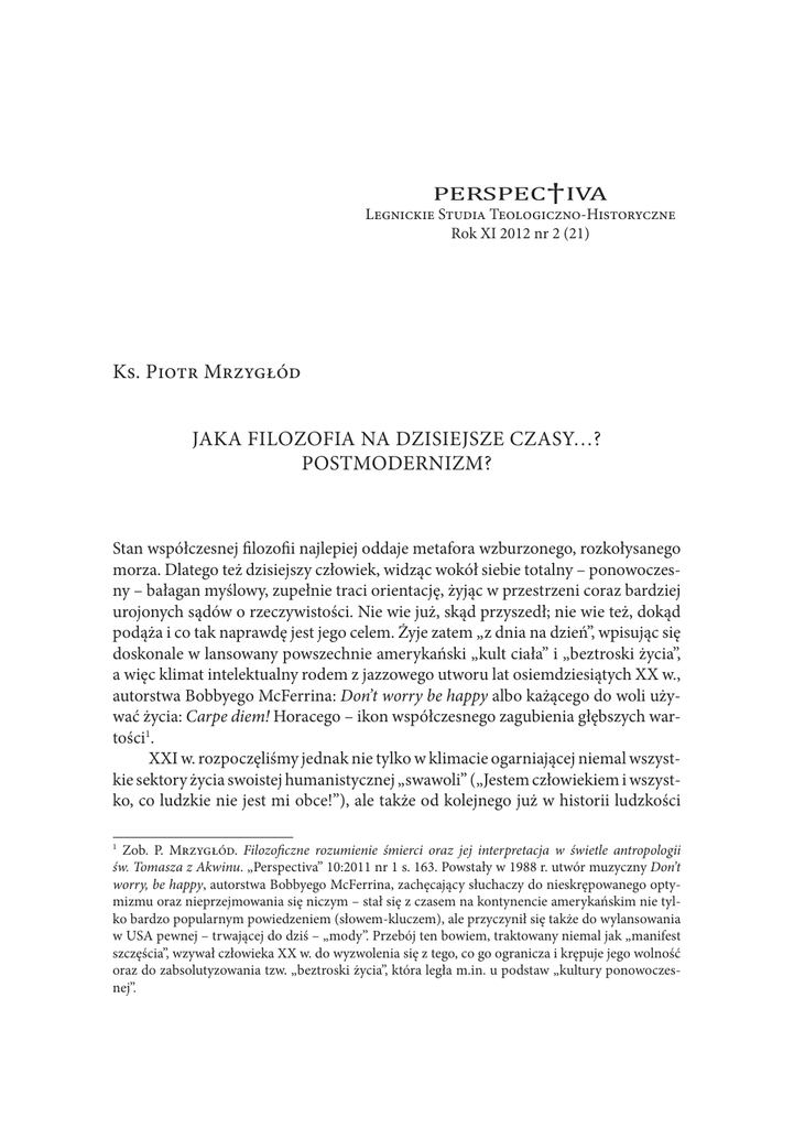 Jaka filozofia na dzisiejsze czasy...? Postmodernizm? 107 PERSPEC†IVA Legnickie Studia Teologiczno-Historyczne Rok XI 2012 nr 2 (21) Ks. Piotr Mrzygłód JAKA FILOZOFIA NA DZISIEJSZE CZASY…? POSTMODERNIZM? Stan współczesnej filozofii najlepiej oddaje metafora wzburzonego, rozkołysanego morza. Dlatego też dzisiejszy człowiek, widząc wokół siebie totalny – ponowoczesny – bałagan myślowy, zupełnie traci orientację, żyjąc w przestrzeni coraz bardziej urojonych sądów o rzeczywistości. Nie wie już, skąd przyszedł; nie wie też, dokąd podąża i co tak naprawdę jest jego celem. Żyje zatem „z dnia na dzień”, wpisując się doskonale w lansowany powszechnie amerykański „kult ciała” i „beztroski życia”, a więc klimat intelektualny rodem z jazzowego utworu lat osiemdziesiątych XX w., autorstwa Bobbyego McFerrina: Don’t worry be happy albo każącego do woli używać życia: Carpe diem! Horacego – ikon współczesnego zagubienia głębszych wartości1. XXI w. rozpoczęliśmy jednak nie tylko w klimacie ogarniającej niemal wszystkie sektory życia swoistej humanistycznej „swawoli” („Jestem człowiekiem i wszystko, co ludzkie nie jest mi obce!”), ale także od kolejnego już w historii ludzkości Zob. P. Mrzygłód. Filozoficzne rozumienie śmierci oraz jej interpretacja w świetle antropologii św. Tomasza z Akwinu. „Perspectiva” 10:2011 nr 1 s. 163. Powstały w 1988 r. utwór muzyczny Don’t worry, be happy, autorstwa Bobbyego McFerrina, zachęcający słuchaczy do nieskrępowanego optymizmu oraz nieprzejmowania się niczym – stał się z czasem na kontynencie amerykańskim nie tylko bardzo popularnym powiedzeniem (słowem-kluczem), ale przyczynił się także do wylansowania w USA pewnej – trwającej do dziś – „mody”. Przebój ten bowiem, traktowany niemal jak „manifest szczęścia”, wzywał człowieka XX w. do wyzwolenia się z tego, co go ogranicza i krępuje jego wolność oraz do zabsolutyzowania tzw. „beztroski życia”, która legła m.in. u podstaw „kultury ponowoczesnej”. 1 108 Ks. Piotr Mrzygłód ubóstwienia nauki, w postaci ataku niewiarygodnego wprost współczesnego „intelektualnego barbarzyństwa”, wyrażającego się, między innymi w pladze bezrefleksyjnej technokratyzacji życia oraz idącego z nią w parze terroryzmu. A wszystko to za sprawą najnowszych osiągnięć, wyzwolonego od jakiejkolwiek wrażliwości i ograniczeń moralnych ludzkiego umysłu oraz oderwanej od fundamentalnego kryterium prawdy nauki, objawiającej się dziś jedynie w postaci utylitarystycznych technologii. W zasadzie nie powinno to nikogo dziwić, bo gdy już starego Platona pytano niegdyś, dlaczego Grecy przewyższają barbarzyńców – odpowiedział zdecydowanie: „Ponieważ barbarzyńcy podporządkowują naukę nie prawdzie, ale temu, co jedynie praktycznie użyteczne”2. Dlatego też każdorazowe przyjęcie takiej optyki intelektualnego eksplorowania i zagospodarowywania świata, prędzej czy później, kończy się odrzuceniem najdoskonalszej perspektywy uprawiania nauki, jaką zrodziła jeszcze filozoficzna tradycja grecka oraz zaprzestaniem budowania obiektywnej, racjonalnej i wolnej od jakiejkolwiek naiwnej ezoteryki wiedzy o rzeczywistości, w modelu określanym, jako scire propter ipsum scire3. Brak zatem konieczności integralnego widzenia i traktowania rzeczywistości oraz celowe „amputowanie” z niej tych czy innych jej wymiarów (np. humanistycznych, teologicznych bądź etycznych) zrodziło dziś swoistą przepaść między nowożytnym i pozytywistycznym obrazem świata, wytworzonym przez nauki matematyczno-przyrodnicze, a obrazem świata wyrażanym przez kulturę humanistyczną; w tym przede wszystkim przez klasycznie rozumianą i uprawianą filozofię. Dla wielu bowiem współczesnych myślicieli – zgodnie z tak ukonstytuowanym paradygmatem – „nauką” stało się wyłącznie dowodzenie, obliczanie, mierzenie i liczenie, jednym słowem matematyczne traktowanie świata. Dlatego też nie inaczej brzmi niepisana metodologiczna dewiza współczesnej nauki, głosząca, aby: „Wszystko zmierzyć, co jest mierzalne”, „Wszystko uczynić mierzalnym, co jeszcze mierzalne nie jest”4! Tymczasem dla wiernych prawdzie o rzeczywistości filozofów interesująca nauka zaczyna się tam właśnie, gdzie matematyczno-przyrodnicze dowodzenie napotyka na swój kres, gdzie rodzi się helleńskie „zdziwienie” oraz autentycznie wiedzo- i naukotwórcze pytanie o istotę poszczególnych rzeczy i o sens całości – pytanie: di,a ti, – tzn.: dlaczego?; gdzie – wreszcie – szuka się ostatecznych i uniesprzeczniających wszystko, co istnieje, przyczyn oraz satysfakcjonujących naturalną ciekawość i intelektualny niepokój człowieka odpowiedzi5. A co doskonale Cyt. za: S. Wielgus. Historyczne koncepcje i paradygmaty uniwersytetu oraz jego model na dziś i na jutro. Lublin 2009 s. 38-39. 3 Zob. M.A. Krąpiec. O rozumienie filozofii. Lublin 1991 s. 303. 4 Wielgus. Historyczne koncepcje. s. 40. 5 Krąpiec. O rozumienie. s. 8 i 12-13 oraz 47-48. Zob. również: W. Dłubacz. O kulturę filozofii. Lublin 1994 s. 69. 2 Jaka filozofia na dzisiejsze czasy...? Postmodernizm? 109 już na początku XX w., ogłaszającego dumnie światu „religię rozumu”, wyraził choćby Antoine de Saint-Exupery, pisząc w jednej ze swych książek, że to, co istotne, tak naprawdę jest niewidzialne dla ludzkich oczu6. I tylko w pełni obiektywna, odkrywana we wszelkich jej możliwych i dostępnych wymiarach prawda zdolna jest zaspokoić odwieczny „głód poznawczy” ludzkości, wzbudzony dziwną i niezrozumiałą dotąd rzeczywistością7. 1. Współczesna kondycja nauki i filozofii Szeroko rozumiana „współczesność” w filozofii, przynajmniej w przestrzeni naszego kręgu kulturowego – jak zgodnie podkreślają to historycy, obejmuje na pewno swoją cezurą głośny czas przełomu wieku XIX i XX i trwa