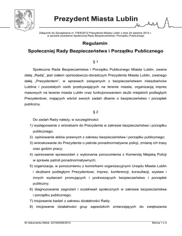 Załącznik do Zarządzenia nr 176/8/2012 Prezydenta Miasta Lublin z dnia 24 sierpnia 2012 r. w sprawie powołania Społecznej Rady Bezpieczeństwa i Porządku Publicznego Regulamin Społeczniej Rady Bezpieczeństwa i Porządku Publicznego §1 Społeczna Rada Bezpieczeństwa i Porządku Publicznego Miasta Lublin, zwana dalej „Radą”, jest ciałem opiniodawczo-doradczym Prezydenta Miasta Lublin, zwanego dalej „Prezydentem”, w sprawach związanych z bezpieczeństwem mieszkańców Lublina i pozostałych osób przebywających na terenie miasta, organizacją imprez masowych na terenie miasta Lublin oraz funkcjonowaniem służb miejskich podległych Prezydentowi, mających wśród swoich zadań dbanie o bezpieczeństwo i porządek publiczny. §2 Do zadań Rady należy, w szczególności: 1) występowanie z wnioskami do Prezydenta w zakresie bezpieczeństwa i porządku publicznego; 2) opiniowanie aktów prawnych z zakresu bezpieczeństwa i porządku publicznego; 3) wnioskowanie do Prezydenta o patrole ponadnormatywne policji, zmianę ich trasy oraz godzin pracy; 4) opiniowanie sprawozdań z wykonania porozumienia z Komendą Miejską Policji w sprawie patroli ponadnormatywnych; 5) organizacja, w porozumieniu z komórkami organizacyjnymi Urzędu Miasta Lublin i służbami podległymi Prezydentowi, imprez, konferencji, konsultacji, wystaw i innych wydarzeń promujących i podnoszących bezpieczeństwo i porządek publiczny; 6) diagnozowanie zagrożeń i oczekiwań społecznych w zakresie bezpieczeństwa i porządku publicznego; 7) inicjowanie badań z zakresu działalności Rady; 8) inicjowanie działalności grup sąsiedzkich zmierzających do zwiększenia Nr dokumentu Mdok: 221549/08/2012 Strona 1 z 4 bezpieczeństwa w najbliższej okolicy; 9) wnioskowanie o wyróżnienia i nagrody dla organizatorów najlepszych lokalnych inicjatyw w zakresie bezpieczeństwa i porządku publicznego. §3 1. Członkowie Rady są powoływani przez Prezydenta, z zastrzeżeniem ust.2, z jego inicjatywy oraz z grona osób rekomendowanych przez: 1) Rady Dzielnic lub zarządy Rad Dzielnic; 2) organizacje pozarządowe lub inne podmioty wymienione w art. 3 ust. 3 ustawy o działalności pożytku publicznego i o wolontariacie podejmujące działania w zakresie bezpieczeństwa i porządku publicznego, w tym bezpieczeństwa ruchu na drogach; 3) zrzeszenia przedsiębiorców. 2. Pierwszy skład osobowy Rady ustala Prezydent z własnej inicjatywy wraz z jej powołaniem. 3. Skład Rady, o którym mowa w ust. 2, zostanie uzupełniony zgodnie z postanowieniami § 4 niniejszego regulaminu. §4 1. Prezydent Miasta Lublin ogłasza zamiar powołania członków Rady, posiadających rekomendację podmiotów wymienionych w § 3 ust. 1, na stronie internetowej Urzędu Miasta Lublin oraz przekazuje taką informację do Rad Dzielnic w Lublinie. 2. Dzień ogłoszenia jest pierwszym dniem, w którym zainteresowane podmioty wymienione w § 3 mogą zgłaszać swoich kandydatów do Rady. 3. Termin zgłaszania kandydatów do Rady wynosi 14 dni od daty ogłoszenia zamiaru jej powołania. 4. Zgłoszenie kandydata do Rady powinno zawierać: 1) imię i nazwisko; 2) dane kontaktowe kandydata; 3) uzasadnienie kandydatury; 4) podpis kandydata; Regulamin Społeczniej Rady Bezpieczeństwa i Porządku Publicznego Załącznik do Zarządzenia nr 176/8/2012 Prezydenta Miasta Lublin z dnia 24 sierpnia 2012 r. Nr dokumentu: 221549/08/2012 Strona 2 z 4 5) podpisy osób zgłaszających bądź pieczęć i podpis osób reprezentujących podmiot zgłaszający kandydata. 5. Prezydent powołuje członków Rady w terminie 14 dni od zakończenia zgłoszeń, w drodze zarządzenia. 6. Ilość członków Rady oraz skład personalny należy do wyłącznej decyzji Prezydenta. 7. Prezydent do składu Rady może powołać także członków z własnej inicjatywy, poza trybem określonym w ust. 1 – 5. §5 1. Pracami Rady kieruje Prezydium Rady wybierane przez Radę spośród jej członków. 2. W skład Prezydium wchodzi Przewodniczący Rady, Zastępca Przewodniczącego Rady oraz Sekretarz Rady. 3. Do zadań Przewodniczącego należy: 1) reprezentowanie Rady na zewnątrz; 2) ustalanie terminów posiedzeń Rady; 3) zwoływanie posiedzeń Rady; 4) prowadzenie posiedzeń Rady; 5) ustalanie porządku obrad Rady z uwzględnieniem charakteru i rodzaju spraw przewidzianych do rozpatrzenia; 6) czuwanie nad terminowością i przebiegiem obrad Rady; 7) zapraszanie na posiedzenia Rady – na wniosek członka Rady, Prezydenta, bądź z własnej inicjatywy – ekspertów z zakresu bezpieczeństwa i porządku publicznego; 8) przedstawianie pisemnych opinii członków Rady; 9) zatwierdzanie, w porozumieniu z zastępcą, protokołów z posiedzeń Rady. 4. Do zadań Sekretarza Rady należy: 1) koordynacja obsługi administracyjnej, biurowej i prawnej Rady, w tym przygotowanie dokumentów, zatwierdzonych przez Przewodniczącego; 2) sporządzanie protokołów z posiedzeń Rady. Regulamin Społeczniej Rady Bezpieczeństwa i Porządku Publicznego Załącznik do Zarządzenia nr 176/8/2012 Prezydenta Miasta Lublin z dnia 24 sierpnia 2012 r. Nr dokumentu: 221549/08/2012 Strona 3 z 4 §6 Rada podejmuje rozstrzygnięcia zwykłą większością głosów w głosowaniu jawnym. §7 1. Rada może powoływać zespoły robocze i grupy problemowe, których celem jest rozpatrywanie konkretnej sprawy lub praca nad rozwiązaniem konkretnego problemu. 2. Rada może zapraszać na swoje spotkania gości i ekspertów zewnętrznych z głosem doradczym. §8 Obsługę administracyjno-biurową Rady zapewnia Wydział Bezpieczeństwa Mieszkańców i Zarządzania Kryzysowego Urzędu Miasta Lublin. Regulamin Społeczniej Rady Bezpieczeństwa i Porządku Publicznego Załącznik do Zarządzenia nr 176/8/2012 Prezydenta Miasta Lublin z dnia 24 sierpnia 2012 r. Nr dokumentu: 221549/08/2012 Strona 4 z 4