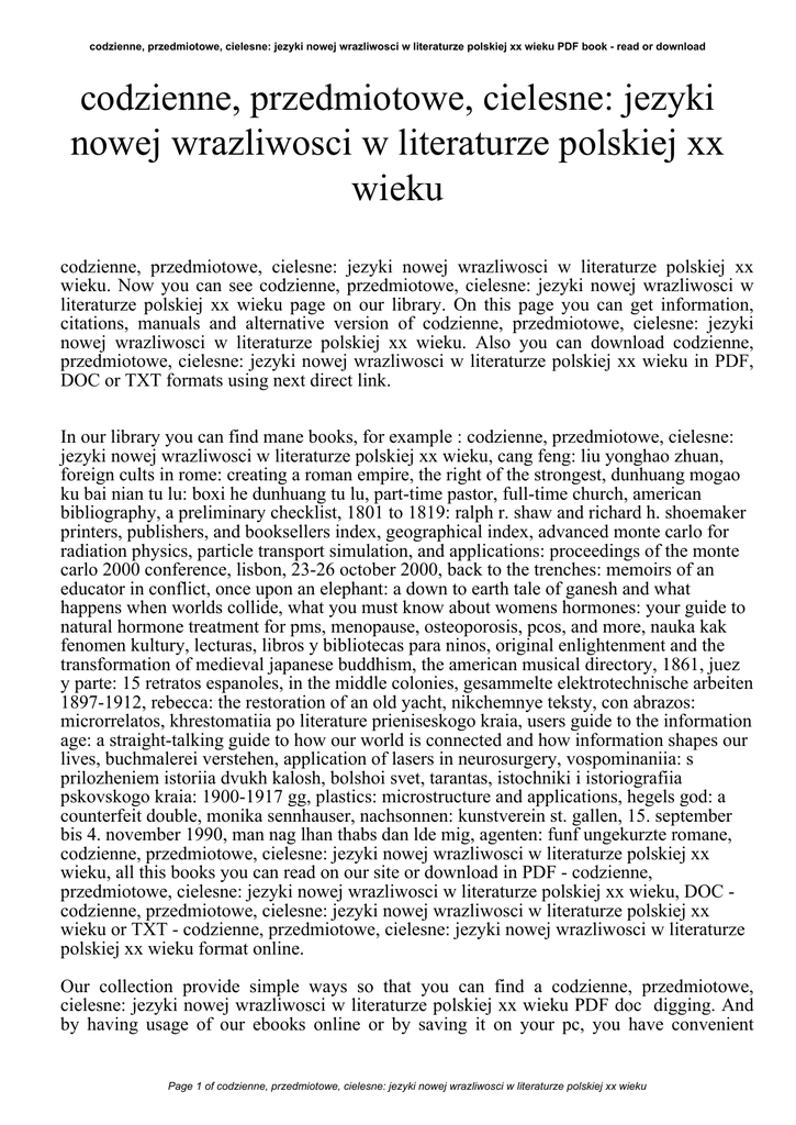 codzienne, przedmiotowe, cielesne: jezyki nowej wrazliwosci w literaturze polskiej xx wieku PDF book - read or download codzienne, przedmiotowe, cielesne: jezyki nowej wrazliwosci w literaturze polskiej xx wieku codzienne, przedmiotowe, cielesne: jezyki nowej wrazliwosci w literaturze polskiej xx wieku. Now you can see codzienne, przedmiotowe, cielesne: jezyki nowej wrazliwosci w literaturze polskiej xx wieku page on our library. On this page you can get information, citations, manuals and alternative version of codzienne, przedmiotowe, cielesne: jezyki nowej wrazliwosci w literaturze polskiej xx wieku. Also you can download codzienne, przedmiotowe, cielesne: jezyki nowej wrazliwosci w literaturze polskiej xx wieku in PDF, DOC or TXT formats using next direct link. In our library you can find mane books, for example : codzienne, przedmiotowe, cielesne: jezyki nowej wrazliwosci w literaturze polskiej xx wieku, cang feng: liu yonghao zhuan, foreign cults in rome: creating a roman empire, the right of the strongest, dunhuang mogao ku bai nian tu lu: boxi he dunhuang tu lu, part-time pastor, full-time church, american bibliography, a preliminary checklist, 1801 to 1819: ralph r. shaw and richard h. shoemaker printers, publishers, and booksellers index, geographical index, advanced monte carlo for radiation physics, particle transport simulation, and applications: proceedings of the monte carlo 2000 conference, lisbon, 23-26 october 2000, back to the trenches: memoirs of an educator in conflict, once upon an elephant: a down to earth tale of ganesh and what happens when worlds collide, what you must know about womens hormones: your guide to natural hormone treatment for pms, menopause, osteoporosis, pcos, and more, nauka kak fenomen kultury, lecturas, libros y bibliotecas para ninos, original enlightenment and the transformation of medieval japanese buddhism, the american musical directory, 1861, juez y parte: 15 retratos espanoles, in the middle colonies, gesammelte elektrotechnische arbeiten 1897-1912, rebecca: the restoration of an old yacht, nikchemnye teksty, con abrazos: microrrelatos, khrestomatiia po literature prieniseskogo kraia, users guide to the information age: a straight-talking guide to how our world is connected and how information shapes our lives, buchmalerei verstehen, application of lasers in neurosurgery, vospominaniia: s prilozheniem istoriia dvukh kalosh, bolshoi svet, tarantas, istochniki i istoriografiia pskovskogo kraia: 1900-1917 gg, plastics: microstructure and applications, hegels god: a counterfeit double, monika sennhauser, nachsonnen: kunstverein st. gallen, 15. september bis 4. november 1990, man nag lhan thabs dan lde mig, agenten: funf ungekurzte romane, codzienne, przedmiotowe, cielesne: jezyki nowej wrazliwosci w literaturze polskiej xx wieku, all this books you can read on our site or download in PDF - codzienne, przedmiotowe, cielesne: jezyki nowej wrazliwosci w literaturze polskiej xx wieku, DOC codzienne, przedmiotowe, cielesne: jezyki nowej wrazliwosci w literaturze polskiej xx wieku or TXT - codzienne, przedmiotowe, cielesne: jezyki nowej wrazliwosci w literaturze polskiej xx wieku format online. Our collection provide simple ways so that you can find a codzienne, przedmiotowe, cielesne: jezyki nowej wrazliwosci w literaturze polskiej xx wieku PDF doc digging. And by having usage of our ebooks online or by saving it on your pc, you have convenient Page 1 of codzienne, przedmiotowe, cielesne: jezyki nowej wrazliwosci w literaturze polskiej xx wieku codzienne, przedmiotowe, cielesne: jezyki nowej wrazliwosci w literaturze polskiej xx wieku PDF book - read or download answers with codzienne, przedmiotowe, cielesne: jezyki nowej wrazliwosci w literaturze polskiej xx wieku. finding codzienne, przedmiotowe, cielesne: jezyki nowej wrazliwosci w literaturze polskiej xx wieku, you are find our website that includes a comprehensive codzienne, przedmiotowe, cielesne: jezyki nowej wrazliwosci w literaturze polskiej xx wieku manuals listed. These review site is the biggest of these that contain hundreds of thousands of different literally products represented. You'll also see that we now have specific sites catered to different product types or categories, brands or niche categories related to codzienne, przedmiotowe, cielesne: jezyki nowej wrazliwosci w literaturze polskiej xx wieku. So depending on what exactly you are searching, you'll be able to choose ebooks codzienne, przedmiotowe, cielesne: jezyki nowej wrazliwosci w literaturze polskiej xx wieku to suit your own needs, codzienne, przedmiotowe, cielesne: jezyki nowej wrazliwosci w literaturze polskiej xx wieku. Page 2 of codzienne, przedmiotowe, cielesne: jezyki nowej wrazliwosci w literaturze polskiej xx wieku