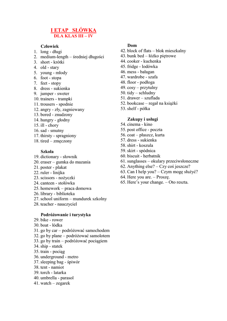 I ETAP SŁÓWKA DLA KLAS III – IV Człowiek 1. long - długi 2. medium-length – średniej długości 3. short - krótki 4. old - stary 5. young - młody 6. foot - stopa 7. feet - stopy 8. dress - sukienka 9. jumper - sweter 10. trainers - trampki 11. trousers - spodnie 12. angry - zły, zagniewany 13. bored - znudzony 14. hungry - głodny 15. ill - chory 16. sad - smutny 17. thirsty - spragniony 18. tired – zmęczony Szkoła 19. dictionary - słownik 20. eraser – gumka do mazania 21. poster - plakat 22. ruler - linijka 23. scissors - nożyczki 24. canteen - stołówka 25. homework – praca domowa 26. library - biblioteka 27. school uniform – mundurek szkolny 28. teacher - nauczyciel Podróżowanie i turystyka 29. bike - rower 30. boat - łódka 31. go by car – podróżować samochodem 32. go by plane – podróżować samolotem 33. go by train – podróżować pociągiem 34. ship - statek 35. train - pociąg 36. underground - metro 37. sleeping bag - śpiwór 38. tent - namiot 39. torch - latarka 40. umbrella - parasol 41. watch – zegarek Dom 42. block of flats – blok mieszkalny 43. bunk bed – łóżko piętrowe 44. cooker - kuchenka 45. fridge - lodówka 46. mess - bałagan 47. wardrobe - szafa 48. floor - podłoga 49. cosy – przytulny 50. tidy – schludny 51. drawer – szuflada 52. bookcase – regał na książki 53. shelf - półka Zakupy i usługi 54. cinema - kino 55. post office - poczta 56. coat – płaszcz, kurta 57. dress - sukienka 58. shirt - koszula 59. skirt - spódnica 60. biscuit - herbatnik 61. sunglasses – okulary przeciwsłoneczne 62. Anything else? – Czy coś jeszcze? 63. Can I help you? – Czym mogę służyć? 64. Here you are. – Proszę. 65. Here’s your change. – Oto reszta.