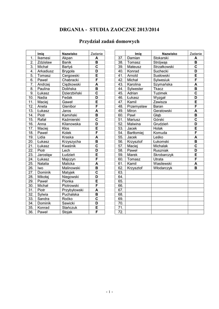 DRGANIA - STUDIA ZAOCZNE 2013/2014 Przydział zadań