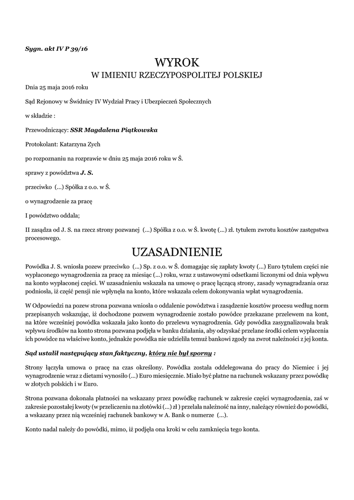 Sygn. akt IV P 39/16 WYROK W IMIENIU RZECZYPOSPOLITEJ POLSKIEJ Dnia 25 maja 2016 roku Sąd Rejonowy w Świdnicy IV Wydział Pracy i Ubezpieczeń Społecznych w składzie : Przewodniczący: SSR Magdalena Piątkowska Protokolant: Katarzyna Zych po rozpoznaniu na rozprawie w dniu 25 maja 2016 roku w Ś. sprawy z powództwa J. S. przeciwko (...) Spółka z o.o. w Ś. o wynagrodzenie za pracę I powództwo oddala; II zasądza od J. S. na rzecz strony pozwanej (...) Spółka z o.o. w Ś. kwotę (...) zł. tytułem zwrotu kosztów zastępstwa procesowego. UZASADNIENIE Powódka J. S. wniosła pozew przeciwko (...) Sp. z o.o. w Ś. domagając się zapłaty kwoty (...) Euro tytułem części nie wypłaconego wynagrodzenia za pracę za miesiąc (...) roku, wraz z ustawowymi odsetkami liczonymi od dnia wpływu na konto wypłaconej części. W uzasadnieniu wskazała na umowę o pracę łączącą strony, zasady wynagradzania oraz podniosła, iż część pensji nie wpłynęła na konto, które wskazała celem dokonywania wpłat wynagrodzenia. W Odpowiedzi na pozew strona pozwana wniosła o oddalenie powództwa i zasądzenie kosztów procesu według norm przepisanych wskazując, iż dochodzone pozwem wynagrodzenie zostało powódce przekazane przelewem na kont, na które wcześniej powódka wskazała jako konto do przelewu wynagrodzenia. Gdy powódka zasygnalizowała brak wpływu środków na konto strona pozwana podjęła w banku działania, aby odzyskać przelane środki celem wypłacenia ich powódce na właściwe konto, jednakże powódka nie udzieliła temuż bankowi zgody na zwrot należności z jej konta. Sąd ustalił następujący stan faktyczny, który nie był sporny : Strony łączyła umowa o pracę na czas określony. Powódka została oddelegowana do pracy do Niemiec i jej wynagrodzenie wraz z dietami wynosiło (...) Euro miesięcznie. Miało być płatne na rachunek wskazany przez powódkę w złotych polskich i w Euro. Strona pozwana dokonała płatności na wskazany przez powódkę rachunek w zakresie części wynagrodzenia, zaś w zakresie pozostałej kwoty (w przeliczeniu na złotówki (...) zł ) przelała należność na inny, należący również do powódki, a wskazany przez nią wcześniej rachunek bankowy w A. Bank o numerze (...). Konto nadal należy do powódki, mimo, iż podjęła ona kroki w celu zamknięcia tego konta. Po otrzymaniu od powódki informacji, iż część należności nie wpłynęła na wskazany numer konta, strona pozwana, po wyjaśnieniu sytuacji zwróciła się do A. Bank o zwrot dokonanego przelewu, jednakże z uwagi, iż został on zaksięgowany na rachunku powódki, bez jej zgody Bank nie mógł zwrócić należności; powódka zgody nie wyraziła . Przy tak ustalonym stanie faktycznym sąd zważył: Powództwo podlegało oddaleniu. Zgodnie z art. 22 § 1 kp przez nawiązanie stosunku pracy pracownik zobowiązuje się do wykonywania pracy określonego rodzaju na rzecz pracodawcy i pod jego kierownictwem oraz w miejscu i czasie wyznaczonym przez pracodawcę, a pracodawca - do zatrudniania pracownika za wynagrodzeniem. Zgodnie zaś z art. 86 § 1 kp pracodawca jest obowiązany wypłacać wynagrodzenie w miejscu, terminie i czasie określonych w regulaminie pracy lub w innych przepisach prawa pracy. Wypłaty wynagrodzenia dokonuje się w formie pieniężnej; częściowe spełnienie wynagrodzenia w innej formie niż pieniężna jest dopuszczalne tylko wówczas, gdy przewidują to ustawowe przepisy prawa pracy lub układ zbiorowy pracy.( § 2) Obowiązek wypłacenia wynagrodzenia może być spełniony w inny sposób niż do rąk pracownika, jeżeli tak stanowi układ zbiorowy pracy lub pracownik uprzednio wyrazi na to zgodę na piśmie. (§ 3) W niniejszej sprawie niesporna była wysokość miesięcznego wynagrodzenia powódki oraz fakt, iż część wynagrodzenia za pracę została przelana na inne konto, niż wskazane przez powódkę, ale takie, którego jest posiadaczem. Nic nie stoi na przeszkodzie, aby powódka podjęła z konta wynagrodzenie, a zatem nie można zarzucić pracodawcy, iż nie dokonał wypłaty wynagrodzenia w terminie. Fakt, iż powódka nie wyraziła zgody na dokonanie zwrotu przelanych jej środków z powrotem na konto pracodawcy jest jedyną przyczyną, iż nie zostały one przelane na nowe konto powódki. Trudno w tej sytuacji nakładać na pracodawcę obowiązek ponownej wypłaty kwoty (...)zł. , skoro raz została ona wypłacona i pozostaje w dyspozycji powódki. Dlatego też powództwo oddalono. O kosztach Sąd orzekł na podstawie art. 98 kpc w zw. z rozporządzeniem Ministra Sprawiedliwości z dnia 22.10.2015 roku w sprawie opłat za czynności radców prawnych.