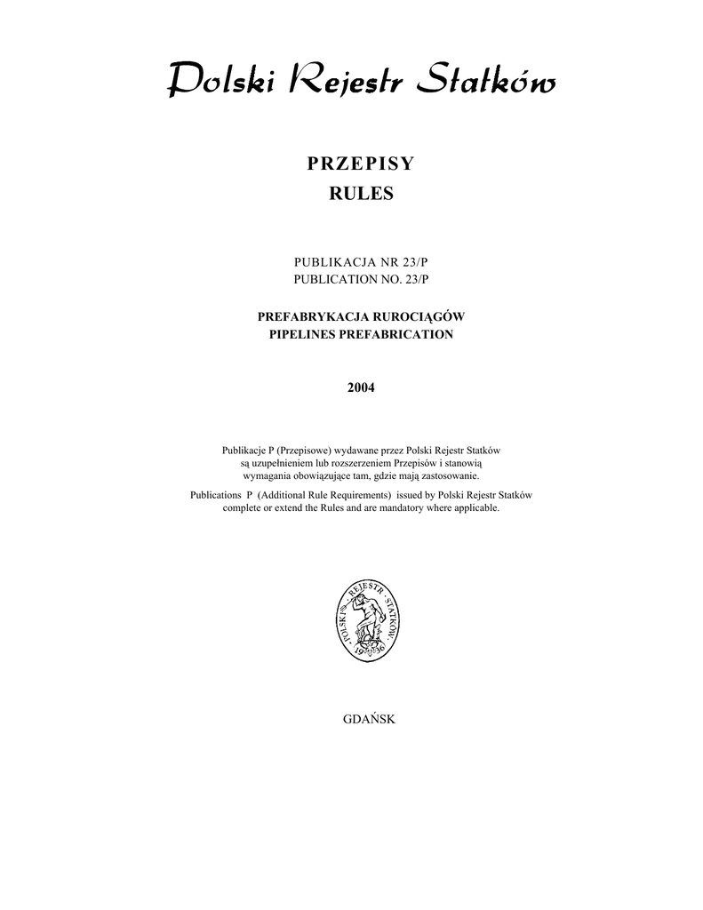 PRZEPISY RULES PUBLIKACJA NR 23/P PUBLICATION NO. 23/P PREFABRYKACJA RUROCIĄGÓW PIPELINES PREFABRICATION 2004 Publikacje P (Przepisowe) wydawane przez Polski Rejestr Statków są uzupełnieniem lub rozszerzeniem Przepisów i stanowią wymagania obowiązujące tam, gdzie mają zastosowanie. Publications P (Additional Rule Requirements) issued by Polski Rejestr Statków complete or extend the Rules and are mandatory where applicable. GDAŃSK Publikacja Nr 23/P – Prefabrykacja rurociągów (zawierająca Ujednolicone Wymagania IACS P2, wyd. Listopad 2001, rozdziały 2.5 i 2.6), stanowi rozszerzenie wymagań Przepisów klasyfikacji i budowy statków morskich. Publikacja ta została zatwierdzona przez Zarząd PRS S.A. w dniu 9 lipca 2004 i wchodzi w życie z dniem 1 sierpnia 2004. Niniejsza publikacja zastępuje Publikację Nr 23/P – Prefabrykacja rurociągów, 1997. PRS Publication No. 23/P – Pipelines Prefabrication (based on the IACS Unified Requirements P2, Rev. Nov. 2001, Chapters 2.5, 2.6), is an extension of the requirements contained in Rules for the Classification and Construction of Sea-going Ships. This publication was approved by the PRS S.A. Board on 9th of July 2004 and enters into force on 1st of August 2004. The present publication replaces Publication No. 23/P – Pipelines Prefabrication, 1997. © Copyright by Polski Rejestr Statków S.A., 2004 PRS/HW, 07/2004 ISBN 83-89895-06-4 SPIS TREŚCI str. 1 2 2.1 2.2 2.3 2.4 2.5 2.6 2.7 3 Wstęp .......................................................................................................................... 5 Spawanie ..................................................................................................................... 5 Postanowienia ogólne ...................................................................................................5 Uzgodnienie technologii spawania ...............................................................................5 Urządzenia spawalnicze i personel ...............................................................................6 Przygotowanie brzegów do spawania ...........................................................................6 Montaż rurociągu ..........................................................................................................6 Podgrzewanie wstępne ..................................................................................................7 Obróbka cieplna po zginaniu i spawaniu ......................................................................7 Badania nieniszczące i kryteria akceptacji .............................................................. 9 CONTENTS page 1 2 2.1 2.2 2.3 2.4 2.5 2.6 2.7 3 Introduction .............................................................................................................. 13 Welding ..................................................................................................................... 13 General ....................................................................................................................... 13 Agreeing of Welding Procedures ............................................................................... 13 Welding Facilities and Personnel .............................................................................. 14 Edge Preparation for Welded Joints .......................................................................... 14 Alignment and Assembling ....................................................................................... 14 Preheating .................................................................................................................. 15 Heat Treatment after Forming and Welding .............................................................. 15 Non-destructive Testing of Welds and Acceptance Criteria ................................ 17 1 WSTĘP Niniejsze wymagania mają zastosowanie do rurociągów klasy I, II i III, wykonanych ze stali węglowych, węglowo-manganowych i stopowych. 2 2.1 SPAWANIE Postanowienia ogólne Złącza spawane rurociągów klas I i II należy wykonywać zgodnie z technologią spawania uzgodnioną z PRS. Materiały dodatkowe do spawania powinny spełniać wymagania Przepisów PRS, spawacze powinni posiadać aktualne uprawnienia PRS uzyskane zgodnie z wymaganiami zawartymi w Publikacji Nr 3/P – Zasady egzaminowania spawaczy. Przygotowanie złącza, proces spawania powinny spełniać wymagania Przepisów PRS lub uznanych norm. Wymagania zawarte w niniejszej Publikacji mają zastosowanie do rurociągów klas I i II eksploatowanych w temperaturze otoczenia lub w podwyższonych temperaturach i wykonanych z następujących gatunków stali: – stali węglowych i węglowo-manganowych, których minimalna wytrzymałość na rozciąganie (Rm) wynosi 320, 360, 410, 460 i 490 MPa, – niskostopowych stali węglowo-molibdenowych, chromowo-molibdenowych, chromowo-molibdenowo-wanadowych o następującym składzie chemicznym: 0,3Mo; 1Cr-0,5Mo; 2,25Cr-1Mo; 0,5Cr-0,5Mo-0,25V. Wg uznania PRS wymagania te mogą mieć również zastosowanie do rurociągów klasy III i do robót spawalniczych przy naprawach rurociągów. Rurociągi instalacji schładzania ładunku eksploatowane w temperaturze poniżej –40 °C podlegają odrębnemu rozpatrzeniu przez PRS. 2.2 Uzgodnienie technologii spawania Technologie spawania rurociągów klas I i II podlegają uzgodnieniu z PRS. Technologia spawania powinna zawierać wszystkie dane konieczne do wykonania spoiny odpowiedniej jakości. Przed przystąpieniem do spawania zakład powinien uzyskać uznanie na podstawie przeprowadzonych prób. Próby powinny uwzględniać: – technologie spawania, – materiały podstawowe, – materiały dodatkowe, – przygotowanie brzegów, – pozycje spawania. Warunki wykonywania prób powinny być zbliżone do warunków produkcyjnych. Zakres badań nieniszczących podano w punkcie 3. 5 Z każdego połączenia należy wykonać: 