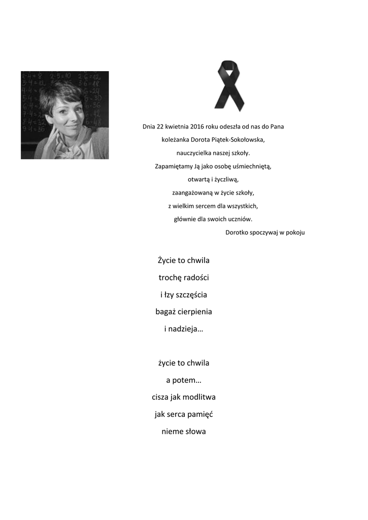 Dnia 22 kwietnia 2016 roku odeszła od nas do Pana koleżanka Dorota Piątek-Sokołowska, nauczycielka naszej szkoły. Zapamiętamy Ją jako osobę uśmiechniętą, otwartą i życzliwą, zaangażowaną w życie szkoły, z wielkim sercem dla wszystkich, głównie dla swoich uczniów. Dorotko spoczywaj w pokoju Życie to chwila trochę radości i łzy szczęścia bagaż cierpienia i nadzieja… życie to chwila a potem… cisza jak modlitwa jak serca pamięć nieme słowa