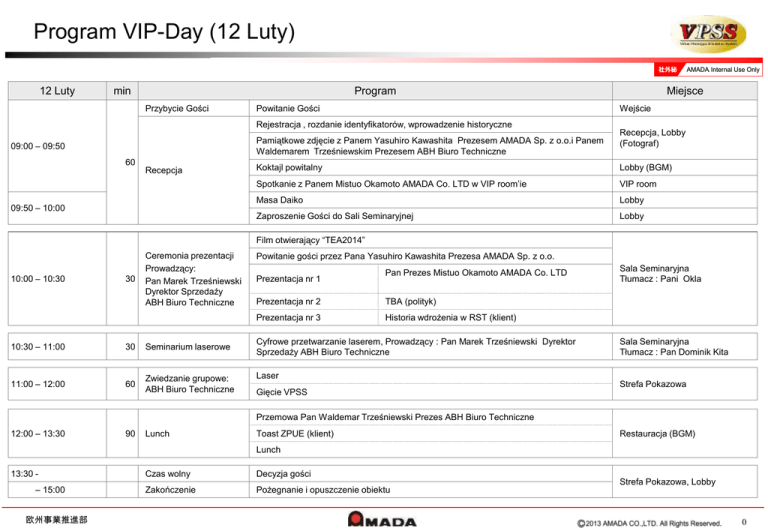 Program VIP-Day (12 Luty) 12 Luty min Program Przybycie Gości Powitanie Gości Wejście Rejestracja , rozdanie identyfikatorów, wprowadzenie historyczne Pamiątkowe zdjęcie z Panem Yasuhiro Kawashita Prezesem AMADA Sp. z o.o.i Panem Waldemarem Trześniewskim Prezesem ABH Biuro Techniczne 09:00 – 09:50 60 Recepcja 09:50 – 10:00 Miejsce Recepcja, Lobby (Fotograf) Koktajl powitalny Lobby (BGM) Spotkanie z Panem Mistuo Okamoto AMADA Co. LTD w VIP room’ie VIP room Masa Daiko Lobby Zaproszenie Gości do Sali Seminaryjnej Lobby Film otwierający “TEA2014” 10:00 – 10:30 30 Ceremonia prezentacji Prowadzący: Pan Marek Trześniewski Dyrektor Sprzedaży ABH Biuro Techniczne 10:30 – 11:00 30 Seminarium laserowe 11:00 – 12:00 60 Zwiedzanie grupowe: ABH Biuro Techniczne Powitanie gości przez Pana Yasuhiro Kawashita Prezesa AMADA Sp. z o.o. Prezentacja nr 1 Pan Prezes Mistuo Okamoto AMADA Co. LTD Prezentacja nr 2 TBA (polityk) Prezentacja nr 3 Historia wdrożenia w RST (klient) Cyfrowe przetwarzanie laserem, Prowadzący : Pan Marek Trześniewski Dyrektor Sprzedaży ABH Biuro Techniczne Laser Gięcie VPSS Sala Seminaryjna Tłumacz : Pani Okla Sala Seminaryjna Tłumacz : Pan Dominik Kita Strefa Pokazowa Przemowa Pan Waldemar Trześniewski Prezes ABH Biuro Techniczne 12:00 – 13:30 90 Lunch Toast ZPUE (klient) Restauracja (BGM) Lunch 13:30 - Czas wolny Decyzja gości 16:30 – 15:00 Zakończenie Pożegnanie i opuszczenie obiektu 欧州事業推進部 Strefa Pokazowa, Lobby 0