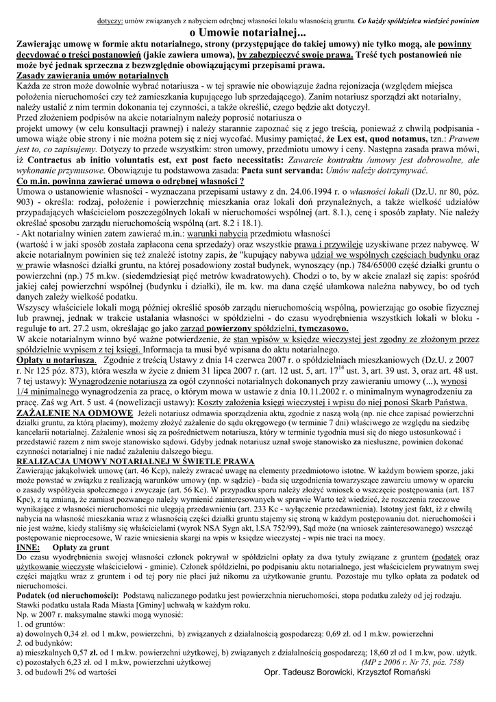 dotyczy: umów związanych z nabyciem odrębnej własności lokalu własnością gruntu. Co kaŜdy spółdzielca wiedzieć powinien o Umowie notarialnej... Zawierając umowę w formie aktu notarialnego, strony (przystępujące do takiej umowy) nie tylko mogą, ale powinny decydować o treści postanowień (jakie zawiera umowa), by zabezpieczyć swoje prawa. Treść tych postanowień nie moŜe być jednak sprzeczna z bezwzględnie obowiązującymi przepisami prawa. Zasady zawierania umów notarialnych KaŜda ze stron moŜe dowolnie wybrać notariusza - w tej sprawie nie obowiązuje Ŝadna rejonizacja (względem miejsca połoŜenia nieruchomości czy teŜ zamieszkania kupującego lub sprzedającego). Zanim notariusz sporządzi akt notarialny, naleŜy ustalić z nim termin dokonania tej czynności, a takŜe określić, czego będzie akt dotyczył. Przed złoŜeniem podpisów na akcie notarialnym naleŜy poprosić notariusza o projekt umowy (w celu konsultacji prawnej) i naleŜy starannie zapoznać się z jego treścią, poniewaŜ z chwilą podpisania umowa wiąŜe obie strony i nie moŜna potem się z niej wycofać. Musimy pamiętać, Ŝe Lex est, quod notamus, tzn.: Prawem jest to, co zapisujemy. Dotyczy to przede wszystkim: stron umowy, przedmiotu umowy i ceny. Następna zasada prawa mówi, iŜ Contractus ab initio voluntatis est, ext post facto necessitatis: Zawarcie kontraktu /umowy jest dobrowolne, ale wykonanie przymusowe. Obowiązuje tu podstawowa zasada: Pacta sunt servanda: Umów naleŜy dotrzymywać. Co m.in. powinna zawierać umowa o odrębnej własności ? Umowa o ustanowienie własności - wyznaczana przepisami ustawy z dn. 24.06.1994 r. o własności lokali (Dz.U. nr 80, póz. 903) - określa: rodzaj, połoŜenie i powierzchnię mieszkania oraz lokali doń przynaleŜnych, a takŜe wielkość udziałów przypadających właścicielom poszczególnych lokali w nieruchomości wspólnej (art. 8.1.), cenę i sposób zapłaty. Nie naleŜy określać sposobu zarządu nieruchomością wspólną (art. 8.2 i 18.1). - Akt notarialny winien zatem zawierać m.in.: warunki nabycia przedmiotu własności (wartość i w jaki sposób została zapłacona cena sprzedaŜy) oraz wszystkie prawa i przywileje uzyskiwane przez nabywcę. W akcie notarialnym powinien się teŜ znaleźć istotny zapis, Ŝe "kupujący nabywa udział we wspólnych częściach budynku oraz w prawie własności działki gruntu, na której posadowiony został budynek, wynoszący (np.) 784/65000 część działki gruntu o powierzchni (np.) 75 m.kw. (siedemdziesiąt pięć metrów kwadratowych). Chodzi o to, by w akcie znalazł się zapis: spośród jakiej całej powierzchni wspólnej (budynku i działki), ile m. kw. ma dana część ułamkowa naleŜna nabywcy, bo od tych danych zaleŜy wielkość podatku. Wszyscy właściciele lokali mogą później określić sposób zarządu nieruchomością wspólną, powierzając go osobie fizycznej lub prawnej, jednak w trakcie ustalania własności w spółdzielni - do czasu wyodrębnienia wszystkich lokali w bloku reguluje to art. 27.2 usm, określając go jako zarząd powierzony spółdzielni, tymczasowo. W akcie notarialnym winno być waŜne potwierdzenie, Ŝe stan wpisów w księdze wieczystej jest zgodny ze złoŜonym przez spółdzielnie wypisem z tej księgi. Informacja ta musi być wpisana do aktu notarialnego. Opłaty u notariusza. Zgodnie z treścią Ustawy z dnia 14 czerwca 2007 r. o spółdzielniach mieszkaniowych (Dz.U. z 2007 r. Nr 125 póz. 873), która weszła w Ŝycie z dniem 31 lipca 2007 r. (art. 12 ust. 5, art. 1714 ust. 3, art. 39 ust. 3, oraz art. 48 ust. 7 tej ustawy): Wynagrodzenie notariusza za ogół czynności notarialnych dokonanych przy zawieraniu umowy (...), wynosi 1/4 minimalnego wynagrodzenia za pracę, o którym mowa w ustawie z dnia 10.11.2002 r. o minimalnym wynagrodzeniu za pracę. Zaś wg Art. 5 ust. 4 (nowelizacji ustawy): Koszty załoŜenia księgi wieczystej i wpisu do niej ponosi Skarb Państwa. ZAśALENIE NA ODMOWĘ JeŜeli notariusz odmawia sporządzenia aktu, zgodnie z naszą wolą (np. nie chce zapisać powierzchni działki gruntu, za którą płacimy), moŜemy złoŜyć zaŜalenie do sądu okręgowego (w terminie 7 dni) właściwego ze względu na siedzibę kancelarii notarialnej. ZaŜalenie wnosi się za pośrednictwem notariusza, który w terminie tygodnia musi się do niego ustosunkować i przedstawić razem z nim swoje stanowisko sądowi. Gdyby jednak notariusz uznał swoje stanowisko za niesłuszne, powinien dokonać czynności notarialnej i nie nadać zaŜaleniu dalszego biegu. REALIZACJA UMOWY NOTARIALNEJ W ŚWIETLE PRAWA Zawierając jakąkolwiek umowę (art. 46 Kcp), naleŜy zwracać uwagę na elementy przedmiotowo istotne. W kaŜdym bowiem sporze, jaki moŜe powstać w związku z realizacją warunków umowy (np. w sądzie) - bada się uzgodnienia towarzyszące zawarciu umowy w oparciu o zasady współŜycia społecznego i zwyczaje (art. 56 Kc). W przypadku sporu naleŜy złoŜyć wniosek o wszczęcie postępowania (art. 187 Kpc), z tą zmianą, Ŝe zamiast pozwanego naleŜy wymienić zainteresowanych w sprawie Warto teŜ wiedzieć, Ŝe roszczenia rzeczowe wynikające z własności nieruchomości nie ulegają przedawnieniu (art. 233 Kc - wyłączenie przedawnienia). Istotny jest fakt, iŜ z chwilą nabycia na własność mieszkania wraz z własnością części działki gruntu stajemy się stroną w kaŜdym postępowaniu dot. nieruchomości i nie jest waŜne, kiedy staliśmy się właścicielami (wyrok NSA Sygn akt, l.SA 752/99), Sąd moŜe (na wniosek zainteresowanego) wszcząć postępowanie nieprocesowe, W razie wniesienia skargi na wpis w księdze wieczystej - wpis nie traci na mocy. INNE: Opłaty za grunt Do czasu wyodrębnienia swojej własności członek pokrywał w spółdzielni opłaty za dwa tytuły związane z gruntem (podatek oraz uŜytkowanie wieczyste właścicielowi - gminie). Członek spółdzielni, po podpisaniu aktu