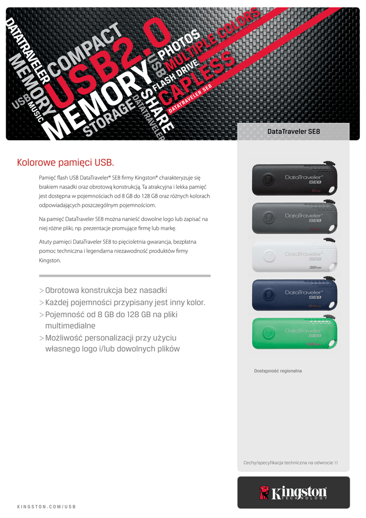 U B S 0 . 2 DA TA A TR VE L ER SE 8 DataTraveler SE8 Kolorowe pamięci USB. Pamięć flash USB DataTraveler® SE8 firmy Kingston® charakteryzuje się brakiem nasadki oraz obrotową konstrukcją. Ta atrakcyjna i lekka pamięć jest dostępna w pojemnościach od 8 GB do 128 GB oraz różnych kolorach odpowiadających poszczególnym pojemnościom. Na pamięć DataTraveler SE8 można nanieść dowolne logo lub zapisać na niej różne pliki, np. prezentacje promujące firmę lub markę. Atuty pamięci DataTraveler SE8 to pięcioletnia gwarancja, bezpłatna pomoc techniczna i legendarna niezawodność produktów firmy Kingston. >>Obrotowa konstrukcja bez nasadki >>Każdej pojemności przypisany jest inny kolor. >>Pojemność od 8 GB do 128 GB na pliki multimedialne >>Możliwość personalizacji przy użyciu własnego logo i/lub dowolnych plików Dostępność regionalna Cechy/specyfikacja techniczna na odwrocie >> KINGSTON.COM/USB US E P SHA G A Y FL OR R T O S MRAGE B H AS >>Wygoda — lekka, obrotowa obudowa bez nasadki, którą łatwo zgubić >>Atrakcyjna — każdej pojemności przypisany jest inny kolor >>Możliwość oznaczenia dowolnym logo1 — Personalizując pamięci flash USB DataTraveler firmy Kingston przez umieszczenie na nich swojego logo i/lub plików błyskawicznie zwiększysz rozpoznawalność marki swojej organizacji. Dzięki nieskomplikowanej procedurze składania zamówień w ramach programu personalizacji można, między innymi, tworzyć własne opakowania, personalizować profile i kolorystykę oraz ładować pliki >>Gwarancja – pięcioletnia gwarancja i darmowa pomoc techniczna TA B E L A Z G O D N O Ś C I System operacyjny DANE TECHNICZNE Przesyłanie plików Windows® 8.1 √ >>Pojemności – 8 GB, 16 GB, 32 GB, 64 GB, 128 GB Windows 8 √ >>Wymiary – 60,21 mm x 22,41 mm x 10 mm Windows 7 (SP1) √ >>Temperatura pracy – od 0°C do 60°C Windows Vista® (SP2) √ >>Temperatura przechowywania – od -20°C do 85°C Mac OS X v.10.7.x lub nowszy √ Linux 2.6.x lub nowszy √ Chrome OS™ √ 2 N U M E RY K ATA L O G O W E K I N G S T O N DTSE8/8GB — czarna DTSE8/16GB — szara DTSE8/32GB — biała DTSE8/64GB — granatowa DTSE8/128GB — zielona 1 W sprawie obowiązujących warunków należy skontaktować się z lokalnym przedstawicielem handlowym. 2 Część podanej pojemności pamięci flash jest używana do obsługi formatowania i innych funkcji, co powoduje jej niedostępność do przechowywania danych. Z tego względu rzeczywista pojemność dostępna do przechowywania danych jest mniejsza niż podana na produktach. Więcej informacji znaleźć można w przewodniku po urządzeniach pamięci flash firmy Kingston dostępnym pod adresem kingston.com/flashguide. NINIEJSZY DOKUMENT MOŻE ZOSTAĆ ZMIENIONY BEZ POWIADOMIENIA. ©2014 Kingston Technology Corporation. 17600 Newhope Street, Fountain Valley, CA 92708 USA. Wszelkie prawa zastrzeżone. Wszelkie znaki towarowe i zastrzeżone znaki towarowe są własnością odpowiednich właścicieli. MKD-308PL E C E C H Y/ Z A L E T Y R AR M LE VE RA TAT DA MESTO IVE R HD S FLA RYUSIC DataTraveler SE8 S TO E O R H SH LER MO ME VE RA TAT DA B S U E IV R D