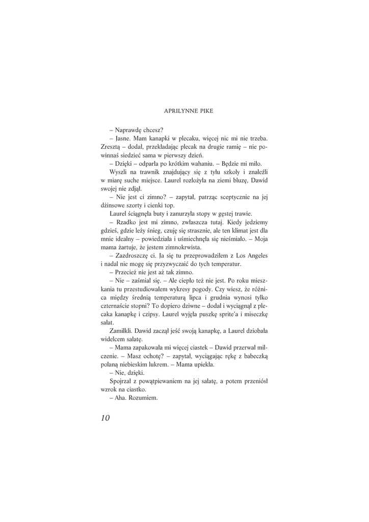 APRILYNNE PIKE – Naprawd´ chcesz? – Jasne. Mam kanapki w plecaku, wi´cej nic mi nie trzeba. Zresztà – doda∏, przek∏adajàc plecak na drugie rami´ – nie powinnaÊ siedzieç sama w pierwszy dzieƒ. – Dzi´ki – odpar∏a po krótkim wahaniu. – B´dzie mi mi∏o. Wyszli na trawnik znajdujàcy si´ z ty∏u szko∏y i znaleêli w miar´ suche miejsce. Laurel roz∏o˝y∏a na ziemi bluz´, Dawid swojej nie zdjà∏. – Nie jest ci zimno? – zapyta∏, patrzàc sceptycznie na jej d˝insowe szorty i cienki top. Laurel Êciàgn´∏a buty i zanurzy∏a stopy w g´stej trawie. – Rzadko jest mi zimno, zw∏aszcza tutaj. Kiedy jedziemy gdzieÊ, gdzie le˝y Ênieg, czuj´ si´ strasznie, ale ten klimat jest dla mnie idealny – powiedzia∏a i uÊmiechn´∏a si´ nieÊmia∏o. – Moja mama ˝artuje, ˝e jestem zimnokrwista. – Zazdroszcz´ ci. Ja si´ tu przeprowadzi∏em z Los Angeles i nadal nie mog´ si´ przyzwyczaiç do tych temperatur. – Przecie˝ nie jest a˝ tak zimno. – Nie – zaÊmia∏ si´. – Ale ciep∏o te˝ nie jest. Po roku mieszkania tu przestudiowa∏em wykresy pogody. Czy wiesz, ˝e ró˝nica mi´dzy Êrednià temperaturà lipca i grudnia wynosi tylko czternaÊcie stopni? To dopiero dziwne – doda∏ i wyciàgnà∏ z plecaka kanapk´ i czipsy. Laurel wyj´∏a puszk´ sprite’a i miseczk´ sa∏at. Zamilkli. Dawid zaczà∏ jeÊç swojà kanapk´, a Laurel dzioba∏a widelcem sa∏at´. – Mama zapakowa∏a mi wi´cej ciastek – Dawid przerwa∏ milczenie. – Masz ochot´? – zapyta∏, wyciàgajàc r´k´ z babeczkà polanà niebieskim lukrem. – Mama upiek∏a. – Nie, dzi´ki. Spojrza∏ z powàtpiewaniem na jej sa∏at´, a potem przeniós∏ wzrok na ciastko. – Aha. Rozumiem. 10