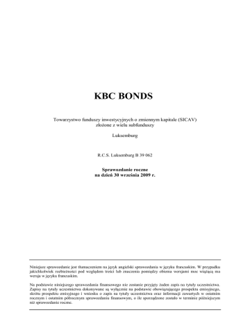 KBC BONDS Towarzystwo funduszy inwestycyjnych o zmiennym kapitale (SICAV) złożone z wielu subfunduszy Luksemburg R.C.S. Luksemburg B 39 062 Sprawozdanie roczne na dzień 30 września 2009 r. Niniejsze sprawozdanie jest tłumaczeniem na język angielski sprawozdania w języku francuskim. W przypadku jakichkolwiek rozbieżności pod względem treści lub znaczenia pomiędzy obiema wersjami moc wiążącą ma wersja w języku francuskim. Na podstawie niniejszego sprawozdania finansowego nie zostanie przyjęty żaden zapis na tytuły uczestnictwa. Zapisy na tytuły uczestnictwa dokonywane są wyłącznie na podstawie obowiązującego prospektu emisyjnego, skrótu prospektu emisyjnego i wniosku o zapis na tytuły uczestnictwa oraz informacji zawartych w ostatnim rocznym i ostatnim półrocznym sprawozdaniu finansowym, o ile sporządzone zostało w terminie późniejszym niż sprawozdanie roczne. KBC BONDS SPIS TREŚCI ORGANIZACJA............................................................................................................................................. 3 INFORMACJE DODATKOWE DLA INWESTORÓW W NIEMCZECH I AUSTRII .............................. 7 OTOCZENIE FINANSOWE ......................................................................................................................... 8 SPRAWOZDANIE NIEZALEŻNEGO BIEGŁEGO REWIDENTA.......................................................... 13 SKONSOLIDOWANA SYTUACJA MAJĄTKOWA ................................................................................. 15 SKONSOLIDOWANY STAN OPERACJI ORAZ INNYCH ZMIAN AKTYWÓW NETTO ................... 16 KBC BONDS INCOME FUND .................................................................................................................... 17 POLITYKA INWESTYCYJNA I PERSPEKTYWY ................................................................................... 17 SYTUACJA MAJĄTKOWA ...................................................................................................................... 18 STAN OPERACJI ORAZ INNYCH ZMIAN AKTYWÓW NETTO ........................................................... 19 DANE STATYSTYCZNE .......................................................................................................................... 20 STAN INWESTYCJI ORAZ INNYCH AKTYWÓW NETTO .................................................................... 21 KBC BONDS CAPITAL FUND ................................................................................................................... 23 POLITYKA INWESTYCYJNA I PERSPEKTYWY ................................................................................... 23 SYTUACJA MAJĄTKOWA ...................................................................................................................... 24 STAN OPERACJI ORAZ INNYCH ZMIAN AKTYWÓW NETTO ........................................................... 25 DANE STATYSTYCZNE .......................................................................................................................... 26 STAN INWESTYCJI ORAZ INNYCH AKTYWÓW NETTO .................................................................... 27 KBC BONDS HIGH INTEREST ................................................................................................................. 29 POLITYKA INWESTYCYJNA I PERSPEKTYWY ................................................................................... 29 SYTUACJA MAJĄTKOWA ...................................................................................................................... 30 STAN OPERACJI ORAZ INNYCH ZMIAN AKTYWÓW NETTO ........................................................... 31 DANE STATYSTYCZNE .......................................................................................................................... 32 STAN INWESTYCJI ORAZ INNYCH AKTYWÓW NETTO .................................................................... 35 KBC BONDS EMERGING MARKETS...................................................................................................... 39 POLITYKA INWESTYCYJNA I PERSPEKTYWY ................................................................................... 39 SYTUACJA MAJĄTKOWA ...................................................................................................................... 40 STAN OPERACJI ORAZ INNYCH ZMIAN AKTYWÓW NETTO ........................................................... 41 DANE STATYSTYCZNE .......................................................................................................................... 42 STAN INWESTYCJI ORAZ INNYCH AKTYWÓW NETTO .................................................................... 43 KBC BONDS CORPORATES EURO ......................................................................................................... 45 POLITYKA INWESTYCYJNA I PERSPEKTYWY ................................................................................... 45 SYTUACJA MAJĄTKOWA ...................................................................................................................... 46 STAN OPERACJI ORAZ INNYCH ZMIAN AKTYWÓW NETTO ........................................................... 47 DANE STATYSTYCZNE .......................................................................................................................... 48 STAN INWESTYCJI ORAZ INNYCH AKTYWÓW NETTO .................................................................... 50 KBC BONDS EURO CANDIDATES........................................................................................................... 55 POLITYKA INWESTYCYJNA I PERSPEKTYWY ................................................................................... 55 SYTUACJA MAJĄTKOWA ...................................................................................................................... 56 STAN OPERACJI ORAZ INNYCH ZMIAN AKTYWÓW NETTO .........................................................