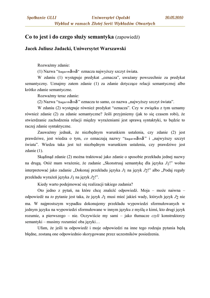 Spotkanie GLLI Uniwersytet Opolski Wykład w ramach Złotej Serii Wykładów Otwartych 20.05.2010 Co to jest i do czego służy semantyka (zapowiedź) Jacek Juliusz Jadacki, Uniwersytet Warszawski Rozważmy zdanie: (1) Nazwa “Sagar m ā th ā ” oznacza najwyższy szczyt świata. W zdaniu (1) występuje predykat „oznacza”, uważany powszechnie za predykat semantyczny. Uznajmy zatem zdanie (1) za zdanie dotyczące relacji semantycznej albo krótko zdanie semantyczne. Rozważmy teraz zdanie: (2) Nazwa “Sagar m ā th ā ” oznacza to samo, co nazwa „najwyższy szczyt świata”. W zdaniu (2) występuje również predykat “oznacza”. Czy w związku z tym uznamy również zdanie (2) za zdanie semantyczne? Jeśli przyjmiemy (jak to się czasem robi), że stwierdzanie zachodzenia relacji między wyrażeniami jest sprawą syntaktyki, to będzie to raczej zdanie syntaktyczne. Zauważmy jednak, że niezbędnym warunkiem ustalenia, czy zdanie (2) jest prawdziwe, jest wiedza o tym, co oznaczają nazwy “Sagar m ā th ā ” i „najwyższy szczyt świata”. Wiedza taka jest też niezbędnym warunkiem ustalenia, czy prawdziwe jest zdanie (1). Skądinąd zdanie (2) można traktować jako zdanie o sposobie przekładu jednej nazwy na drugą. Otóż mam wrażenie, że zadanie „Skonstruuj semantykę dla języka J1!” wolno interpretować jako zadanie „Dokonaj przekładu języka J1 na język J2!” albo „Podaj reguły przekładu wyrażeń języka J1 na język J2!”. Kiedy warto podejmować się realizacji takiego zadania? Oto jedno z pytań, na które chcę znaleźć odpowiedź. Moja – może naiwna – odpowiedź na to pytanie jest taka, że język J1 musi mieć jakieś wady, których język J2 nie ma. W najprostszym wypadku dokonujemy przekładu wypowiedzi sformułowanych w jednym języku na wypowiedzi sformułowane w innym języku z myślą o kimś, kto drugi język rozumie, a pierwszego – nie. Oczywiście my sami – jako tłumacze czyli konstruktorzy semantyki – musimy rozumieć oba języki… Ufam, że jeśli ta odpowiedź i moje odpowiedzi na inne tego rodzaju pytania będą błędne, zostaną one odpowiednio skorygowane przez uczestników posiedzenia.