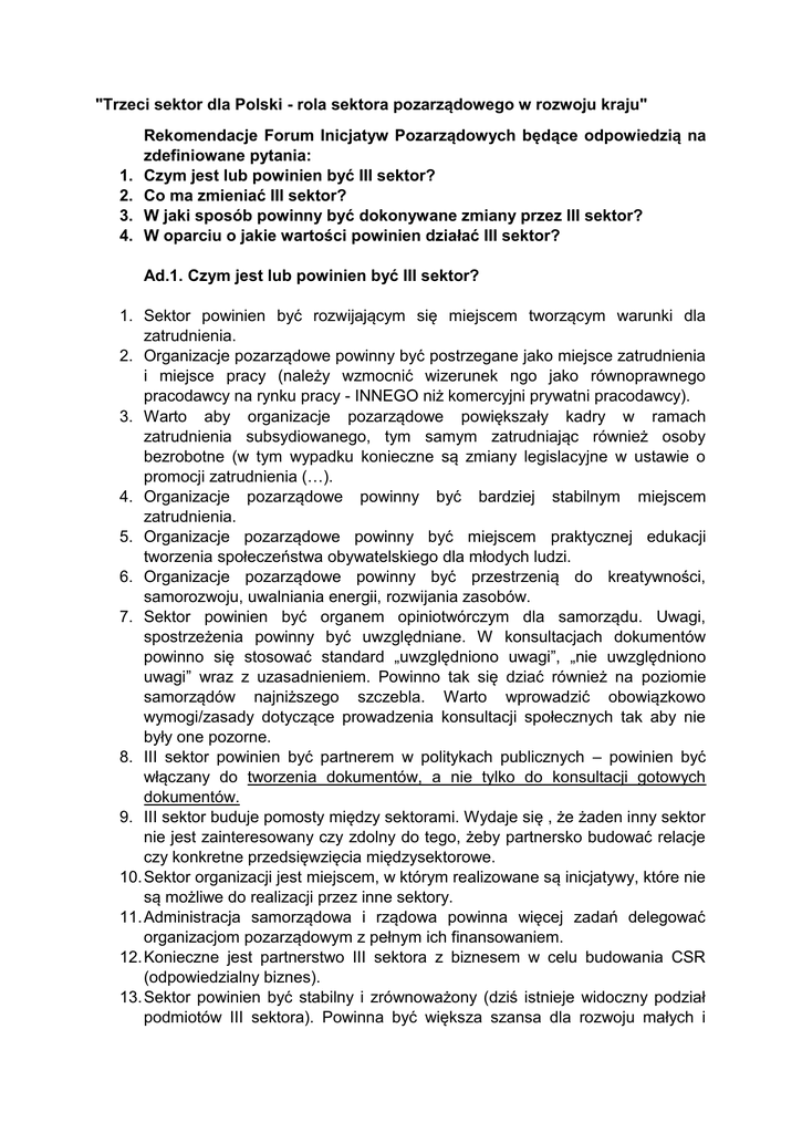 "Trzeci sektor dla Polski - rola sektora pozarządowego w rozwoju kraju" 1. 2. 3. 4. Rekomendacje Forum Inicjatyw Pozarządowych będące odpowiedzią na zdefiniowane pytania: Czym jest lub powinien być III sektor? Co ma zmieniać III sektor? W jaki sposób powinny być dokonywane zmiany przez III sektor? W oparciu o jakie wartości powinien działać III sektor? Ad.1. Czym jest lub powinien być III sektor? 1. Sektor powinien być rozwijającym się miejscem tworzącym warunki dla zatrudnienia. 2. Organizacje pozarządowe powinny być postrzegane jako miejsce zatrudnienia i miejsce pracy (należy wzmocnić wizerunek ngo jako równoprawnego pracodawcy na rynku pracy - INNEGO niż komercyjni prywatni pracodawcy). 3. Warto aby organizacje pozarządowe powiększały kadry w ramach zatrudnienia subsydiowanego, tym samym zatrudniając również osoby bezrobotne (w tym wypadku konieczne są zmiany legislacyjne w ustawie o promocji zatrudnienia (…). 4. Organizacje pozarządowe powinny być bardziej stabilnym miejscem zatrudnienia. 5. Organizacje pozarządowe powinny być miejscem praktycznej edukacji tworzenia społeczeństwa obywatelskiego dla młodych ludzi. 6. Organizacje pozarządowe powinny być przestrzenią do kreatywności, samorozwoju, uwalniania energii, rozwijania zasobów. 7. Sektor powinien być organem opiniotwórczym dla samorządu. Uwagi, spostrzeżenia powinny być uwzględniane. W konsultacjach dokumentów powinno się stosować standard „uwzględniono uwagi”, „nie uwzględniono uwagi” wraz z uzasadnieniem. Powinno tak się dziać również na poziomie samorządów najniższego szczebla. Warto wprowadzić obowiązkowo wymogi/zasady dotyczące prowadzenia konsultacji społecznych tak aby nie były one pozorne. 8. III sektor powinien być partnerem w politykach publicznych – powinien być włączany do tworzenia dokumentów, a nie tylko do konsultacji gotowych dokumentów. 9. III sektor buduje pomosty między sektorami. Wydaje się , że żaden inny sektor nie jest zainteresowany czy zdolny do tego, żeby partnersko budować relacje czy konkretne przedsięwzięcia międzysektorowe. 10. Sektor organizacji jest miejscem, w którym realizowane są inicjatywy, które nie są możliwe do realizacji przez inne sektory. 11. Administracja samorządowa i rządowa powinna więcej zadań delegować organizacjom pozarządowym z pełnym ich finansowaniem. 12. Konieczne jest partnerstwo III sektora z biznesem w celu budowania CSR (odpowiedzialny biznes). 13. Sektor powinien być stabilny i zrównoważony (dziś istnieje widoczny podział podmiotów III sektora). Powinna być większa szansa dla rozwoju małych i młodych organizacji. Konieczne jest wprowadzenie mechanizmów zapewnienia równości i możliwości pozyskiwania środków dla małych organizacji (to już częściowo działa przez regranting PAWF i w tym roku FIO), Ad. 2 Co ma zmieniać III sektor? Sektor pozarządowy powinien: 1. rozwijać edukację obywatelską – kreować aktywne wspólnoty lokalne w praktyce; 2. zdecydowanie mocniej współpracować ze szkołami (potrzebne jest wprowadzenie do szkół podstawowych programów budujących współpracę); 3. uczyć pracy zespołowej poprzez praktyczne działanie; 4. przestawiać sposób myślenia Polaków z „jest źle na jest dobrze”; 5. uczyć odpowiedzialności; 6. budować więzi, relacje, poczucie wspólnoty – patriotyzm lokalny; 7. uczyć tolerancji, szacunku i zrozumienia; 8. brać udział (realny) w ustanawianiu prawa. Ważne aby w procesie jego stanowienia brały udział różne organizacje (różne stażem czy wielkością). 9. być recenzentem władz samorządowych. Organizacje powinny monitorować działania i skuteczność administracji publicznej. 10. kreować rozwiązania dotyczące polityki publicznej (strategie, decyzje bieżące, plany). 11. kreować nową jakość. Sektor powinien ją definiować i promować. 12. koniecznie prowadzić edukację obywatelską w praktyce (praktyki, staże, ale również wolontariat, szkolenia i wszelkie formy współpracy np. ze szkołami w zakresie edukacji obywatelskiej) Ad.3. W jaki sposób powinny być dokonywane zmiany przez III sektor? 1. Sektor powinien znacznie aktywniej zbierać potrzeby i pomysły od swoich beneficjentów, celem ich przedstawiania Jednostkom Samorządu Terytorialnego. Dziś nierzadko ów kontakt kończy się na etapie tworzenia organizacji. 2. Należy aktywnie zmieniać myślenie z MY – „III sektor” i ONI „sektor administracji” – na rzecz wspólnej odpowiedzialności za odbiorców i przestrzeń aktywności. 3. Wyzwaniem jest prowadzenie rzeczywistego dialogu obywatelskiego – celem rozwiązywania problemów, a nie prowadzenia rozmowy dla samej rozmowy między sektorowej. 4. Konieczna jest większa i systemowa współpraca samego środowiska NGO na rzecz rozwiązywania lokalnych problemów. 5. Należy mocniej zadbać o włączanie osób aktywnych do istniejących organizacji. 6. Istnieje potrzeba jednoczenia się do realizacji konkretnych zadań środowisk lokalnych NGO z mieszkańcami i instytucjami. 7. Organizację muszą mocniej dbać o działalność misyjną oraz o swój zespół (organizacja to nie tylko lider!). 8. Istnieje konieczność tworzenia warunków dla rozwoju grup nieformalnych (niekoniecznie ich aktywność musi się wiązać z rejestracją w Krajowym Rejestrze Sądowym). 9. Należy w większym stopniu wykorzystywać aktualnie dostępne narzędzia do prowadzenia działań i realizacji celów. 10. Warto rozważyć użyczanie tożsamości przez zarejestrowane organizacje dla nieformalnych grup. 11. Organizacje powinny mieć większy wpływ systemowy na działania realizowane we współpracy z państwem i samorządami. 12. Konieczne jest ułatwienie finansowania dla podmiotów (min. zmiana 1% tak, aby nie był konsumowany jedynie przez duże czy korporacyjne organizacje). Ad.4 W oparciu o jakie wartości powinien działać III sektor? Wartości obywatelskie (k