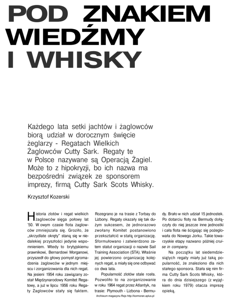 POD ZNAKIEM WIEDŹMY l WHISKY Każdego lata setki jachtów i żaglowców biorą udział w dorocznym święcie żeglarzy - Regatach Wielkich Żaglowców Cutty Sark. Regaty te w Polsce nazywane są Operacją Żagiel. Może to z hipokryzji, bo ich nazwa ma bezpośredni związek ze sponsorem imprezy, firmą Cutty Sark Scots Whisky. Krzysztof Kozerski istoria zlotów i regat wielkich żaglowców sięga połowy lat '50. W owym czasie flota żaglowców zmniejszała się. Groziło, że „skrzydlate okręty" staną się w niedalekiej przyszłości jedynie wspomnieniem. Wtedy to brytyjskiemu prawnikowi, Bernardowi Morganowi, przyszedł do głowy pomysł zgromadzenia żaglowców w jednym miejscu i zorganizowania dla nich regat. Na jesieni 1954 roku zawiązany został Międzynarodowy Komitet Regatowy, a już w lipcu 1956 roku Regaty Żaglowców stały się faktem. H Rozegrano je na trasie z Torbay do Lizbony. Regaty okazały się tak dużym sukcesem, że jednorazowo zwołany Komitet postanowiono przekształcić w stałą organizację. Sformułowano i zatwierdzono zatem statut organizacji o nazwie Sail Training Association (STA). Właśnie jej powierzono organizację kolejnych regat, a miały się one odbywać co dwa lata. Popularność zlotów stale rosła. Pozwoliło to na zorganizowanie w roku 1964 regat przez Atlantyk, na trasie: Plymouth - Lizbona - BermuArchiwum magazynu Rejs http://kormoran.aplus.pl dy. Brało w nich udział 15 jednostek. Po dotarciu floty na Bermudy dołączyły do niej jeszcze inne jednostki i cała flota nie ścigając się pożeglowała do Nowego Jorku. Takie towarzyskie etapy nazwano później cruise in company. Na początku lat siedemdziesiątych regaty miały już taką popularność, że znaleziono dla nich stałego sponsora. Stała się nim firma Cutty Sark Scots Whisky, która do dnia dzisiejszego (z wyjątkiem roku 1979) otacza imprezę opieką. Pamiętne lata Rok 1972 to nie tylko pierwszy rok organizacji imprezy z udziałem sponsora. To także pierwszy rok, kiedy miała miejsce wymiana załóg między żaglowcami z różnych krajów. Podobnie jak to dzieje się do dzisiaj, wyścigi rozdzielono wtedy etapem towarzyskim - cruise in company, podczas którego żaglowce nie ścigały się. Dla nas rok ten był szczególny, gdyż po raz pierwszy w imprezie wziął udział polski żaglowiec (w ogóle pierwszy żaglowiec z „bloku wschodniego"), wy- grywając od razu regaty na trasie Solent-Skaw. Była nim „Biała Fregata", czyli DAR POMORZA. W 1973 roku zaniechano wcześniejszej zasady organizowania regat wyłącznie w lata parzyste. Wprowadzono wówczas regaty mniejszej rangi (minor-regatta). Główne regaty (major-regatta) miały być organizowane nadal w lata parzyste, a przeplatane minor-regatta w lata nieparzyste. Przyczyniło się to do wzrostu popularności imprezy. W roku 1976 Amerykanie świętowali 200-lecie swojego kraju. STA Archiwum magazynu Rejs http://kormoran.aplus.pl postanowiła zatem wysłać flotę żaglowców do Stanów Zjednoczonych, aby uświetniła rocznicę uchwalenia Deklaracji Niepodległości. Miało to ogromne znaczenie dla przyszłości regat, gdyż po raz pierwszy w ich obsługę włączyły się amerykańskie media. Dość powiedzieć, że paradę żaglowców na rzece Hudson w Nowym Jorku oglądało około pięciu milionów osób. Kolejne lata przyniosły dalszy wzrost prestiżu i popularności imprezy. Sukces z roku 1976 uczynił z niej wydarzenie międzynarodo- Trasa tegorocznych regat Sponsor niezupełnie niepoetyczny irma Cutty Sark Scots Whisky jest producentem szkockiej whisky. Wzięła swoją nazwę od legendarnej trzymasztowej fregaty CUTTY SARK. zbudowanej w 1869 roku. Statek ten był jednym z najszybszych żaglowców końca XIX wieku. Jest jedynym zachowanym do dziś kliprem herbacianym. Stoi w suchym doku w Greenwich jako statek-muzeum. W roku 1923 zajmująca się handlem winem i spirytualiami firma Berry Bros & Rudd planowała przeprowadzenie kampanii reklamowej swojego nowego produktu - przeznaczonej na eksport whisky. Do współpracy zwerbowano znanego plastyka, który zaproponował nazwę „Cutty Sark" i narysował sylwetkę klipra pod pełnymi żaglami, będącą do dzisiaj znakiem firmowym tego trunku. Z kolei kliper swoje imię zawdzięczał wiedźmie z poematu „Tam O'Shanter", napisanego w 1790 roku przez Roberta Burnsa. Jest to bezspornie niesamowita historia farmera Tama, który pewnej ciemnej nocy wracając konno do domu natknął się na sabat czarownic. Jedna z nich zwróciła uwagę Tama. Była to nader powabna młoda kobieta ubrana jedynie w „cutty sark", co w języku staroszkockim oznacza krótką koszulkę. Spostrzegłszy obserwującego ją Tama, wiedźma rzuciła się za nim w pogoń. Nie mogąc go pochwycić, uczepiła się ogona jego konia. Jako że wiedźmy nie mogą przekraczać płynącej wody, Tam uratował życie rzucając się do rzeki. Tyle poemat. Słynny CUTTY SARK łączyła z jego imienniczką piękna sylwetka, a dzieliło upodobanie do wody. Kliper dokonał wielu rekordowo szybkich przejść na szlaku herbacianym, a później wełnianym. Galionem statku jest oczywiście figura wspomnianej wiedźmy. Po każdym udanym rejsie załoga wkładała w jej ręce kawałek liny - symbol końskiego ogona. F Archiwum magazynu Rejs http://kormoran.aplus.pl we, a miasta portowe zabiegające o prawo goszczenia floty żaglowców musiały oczekiwać w coraz dłuższej kolejce. Kolejne regaty transatlantyckie zorganizowane zostały w roku 1984. Okazją była tym razem 450 rocznica podróży Jacquesa Cartiera, jednego z pierwszych nawigatorów, którzy dotarli do Kanady. Tym razem przy organizacji regat współpracowały brytyjska oraz amerykańska STA. Tę ostatnią zatożył kapitan i właściciel niewielkiej brygantyny BLACK PEARL. który w roku 1972 przepłynął na niej Atlantyk, by wziąć udział w regatach. Tak bardzo zafascynowały go cele i ideały STA, że po powrocie do kraju założył jej amery