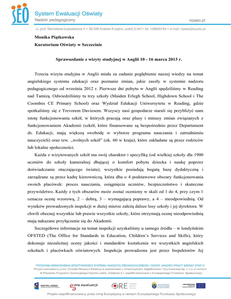 Monika Piątkowska Kuratorium Oświaty w Szczecinie Sprawozdanie z wizyty studyjnej w Anglii 10 - 16 marca 2013 r. Trzecia wizyta studyjna w Anglii miała za zadanie pogłębienie naszej wiedzy na temat angielskiego systemu edukacji oraz poznanie zmian, jakie zaszły w systemie nadzoru pedagogicznego od września 2012 r. Pierwsze dni pobytu w Anglii spędziliśmy w Reading nad Tamizą. Odwiedziliśmy tu trzy szkoły (Maiden Erlegh School, Highdown School i The Coombes CE Primary School) oraz Wydział Edukacji Uniwersytetu w Reading, gdzie spotkaliśmy się z Trevorem Daviesem. Wszyscy nasi gospodarze starali się przybliżyć nam istotę funkcjonowania szkół, w których pracują oraz plusy i minusy zmian związanych z funkcjonowaniem Akademii (szkół, które finansowane są bezpośrednio przez Departament ds. Edukacji, mają większą swobodę w wyborze programu nauczania i zatrudnieniu nauczycieli) oraz tzw. „wolnych szkół” (ok. 60 w kraju), które zakładane są przez rodziców lub lokalne społeczności. Każda z wizytowanych szkół ma swój charakter i specyfikę (od wielkiej szkoły dla 1900 uczniów do szkoły kameralnej dbającej o komfort pobytu dziecka i naukę poprzez doświadczanie otaczającego świata); wszystkie posiadają bogatą bazę dydaktyczną i zarządzane są przez kadrę kierowniczą, która dba o 4 podstawowe obszary funkcjonowania swoich placówek: proces nauczania, osiągnięcia uczniów, bezpieczeństwo i skuteczne przywództwo. Każdy z tych obszarów może zostać oceniony w skali od 1 do 4, przy czym 1 oznacza ocenę wzorową, 2 – dobrą, 3 – wymagającą poprawy, a 4 – nieodpowiednią. Od wyników prowadzonych inspekcji w dużej mierze zależą dalsze losy szkoły i jej dyrektora. W chwili obecnej wszystkie lub prawie wszystkie szkoły, które otrzymują ocenę nieodpowiednią mają nakazane przyłączenie się do Akademii. Szczegółowe informacje na temat inspekcji uzyskaliśmy u samego źródła – w londyńskim OFSTED (The Office for Standards in Education, Children’s Services and Skills), który dokonuje niezależnej oceny jakości i standardów kształcenia we wszystkich angielskich szkołach i placówkach oświatowych. Inspekcja prowadzona jest przez Inspektorów Jej Królewskiej Mości (120 osób nominowanych przez Królową do pracy w OFSTED) oraz „asystentów” inspektorów - 3 tys. przeszkolonych nauczycieli (czynnych lub emerytowanych), dyrektorów i doradców ds. edukacji - wyłanianych w toku konkursu, do którego stają 3 firmy zewnętrzne. Do września 2012 r. każda szkoła w Anglii, niezależnie od osiąganych wyników, podlegała inspekcji raz na 3 lata. Obecnie szkoły, które zostały uznane za wzorowe podczas ostatniej inspekcji (za wyjątkiem np. szkół specjalnych i przedszkoli) są zwalniane z kontroli rutynowej, natomiast podlegają dalszej ocenie wyników kształcenia, w celu ustalenia, czy kolejna inspekcja jest konieczna. Szkoły ocenione jako „dobre” są zazwyczaj kontrolowane po pięciu latach szkolnych; a szkoły ocenione jako „wymagające poprawy” w ciągu dwóch lat. Jeśli w kolejnej inspekcji szkoła jest nadal oceniana jako „wymagająca poprawy”, podlega monitorowaniu i dalszej kontroli, a w ostateczności może być oceniona jako „nieodpowiednia” i zaliczona do jednej z dwóch kategorii: „szkoła wymagająca specjalnych środków”, co oznacza, że nie zapewnia ona swoim uczniom odpowiedniego poziomu kształcenia i nie wykazuje zdolności do poprawy lub „szkoła z poważnymi uchybieniami” - jeden lub więcej z kluczowych obszarów działania szkoły wymaga znaczącej poprawy, ale przywódcy i menedżerowie wykazują zdolność do poprawy. Szkoły te podlegają regularnym wizytom inspektorów, dopóki nie zostaną usunięte z tej kategorii. Związane jest to również ze zmianą osoby na stanowisku dyrektora szkoły, a w skrajnych przypadkach z zamknięciem placówki. Inspekcja prowadzona w angielskich szkołach różni się w pewnych obszarach od ewaluacji zewnętrznej prowadzonej w Polsce, np.: - dyrektorzy szkół w Anglii oraz rodzice badanej szkoły otrzymują zawiadomienie o inspekcji na dzień przed jej rozpoczęciem (w Polsce z miesięcznym wyprzedzeniem), przy czym OFSTED może zbadać każdą szkołę bez zawiadomienia, jeżeli uznano, że jest to właściwe; - ewaluacja trwa zazwyczaj dwa dni, a liczba inspektorów zespołu dostosowana jest do wielkości i rodzaju szkoły (w odwiedzanych szkołach inspekcji dokonywały zespoły 5-6 osobowe); - angielscy inspektorzy większość czasu spędzają na obserwowanych lekcjach (harmonogram obserwacji znany jest tylko grupie inspektorów, a poszczególne obserwacje trwają od 20 do 30 minut) oraz na rozmowach z kadrą zarządzającą, uczniami i nauczycielami; - z zebranych danych formułowany jest raport ustny, który przedstawiany tylko kadrze zarządzającej; - raport pisemny (ok. 6 stron) publikowany jest na stronie OFSED do wglądu dla szkoły, rodziców i szerszej społeczności; zawiera on informacje na temat skuteczności pracy szkoły, ocenę poszczególnych obszarów i ogólną ocenę placówki oraz zalecenia. Podczas pobytu w Londynie odwiedziliśmy również Lark Hall Primary School, szkołę, która bardzo dużą uwagę zwraca na właściwe zarządzanie rozwojem zawodowym nauczycieli. Z informacji uzyskanych od wszystkich osób, które dzieliły się z nami swoim doświadczeniem wynika, że szkoły angielskie kładą szczególny nacisk na współdziałanie nauczycieli oraz odpowiedzialność zawodową kadry pedagogicznej - jeżeli praca choć jednego nauczyciela zostanie oceniona jako nieodpowiednia, to cała szkoła nie może otrzymać oceny wzorowej. Warto taką odpowiedzialność zaszczepić też w naszych szkołach.