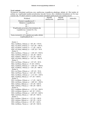 Badanie równowagi płaskiego układu sił 1 Treść zadania Wyznaczyć metodami graficzną oraz analityczną wypadkową płaskiego układu sił. Dla każdej sił podane są: współrzędne punktu przyłożenia, kąt jaki tworzy siła z dodatnim kierunkiem osi Ox oraz wartość siły. W tabeli zestawić wyniki otrzymane metodami graficznymi oraz analitycznymi: Metoda Metoda Wielkość Jednostka analityczna graficzna Wartość wypadkowej R = Składowe wypadkowej Rx = Ry = Współrzędne przecięcia linii działania siły wypadkowej z osiami Ox i Oy: a= b= Suma momentów sił względem początku układu współrzędnych Mo = Zestaw 1. P[1]: A(280cm, 330cm); = 58o; |P| = 570 N. P[2]: A(130cm, 470cm); = 153o; |P| = 700 N. P[3]: A(320cm, 310cm); = -1o; |P| = 320 N. P[4]: A(110cm, 400cm); = -128o; |P| = 70 N. Zestaw 2. P[1]: A(220cm, 170cm); = -158o; |P| = 930 N. P[2]: A(430cm, 420cm); = 18o; |P| = 560 N. P[3]: A(60cm, 300cm); = -22o; |P| = 820 N. P[4]: A(210cm, 200cm); = -69o; |P| = 380 N. Zestaw 3. P[1]: A(330cm, 150cm); = -52o; |P| = 30 N. P[2]: A(250cm, 40cm); = 4o; |P| = 870 N. P[3]: A(420cm, 450cm); = -158o; |P| = 790 N. P[4]: A(300cm, 140cm); = 156o; |P| = 800 N. Zestaw 4. P[1]: A(370cm, 250cm); = -29o; |P| = 70 N. P[2]: A(470cm, 70cm); = 161o; |P| = 750 N. P[3]: A(180cm, 120cm); = -111o; |P| = 140 N. P[4]: A(240cm, 80cm); = 57o; |P| = 450 N. Zestaw 5. P[1]: A(360cm, 250cm); = -1o; |P| = 360 N. P[2]: A(250cm, 160cm); = -108o; |P| = 290 N. P[3]: A(50cm, 280cm); = -18o; |P| = 820 N. P[4]: A(80cm, 370cm); = -96o; |P| = 840 N. Zestaw 6. P[1]: A(400cm, 400cm); = -172o; |P| = 260 N. P[2]: A(360cm, 20cm); = 46o; |P| = 470 N. P[3]: A(490cm, 250cm); = -164o; |P| = 840 N. P[4]: A(410cm, 40cm); = -60o; |P| = 920 N. Zestaw 7. P[1]: A(30cm, 130cm); = -23o; |P| = 140 N. P[2]: A(60cm, 200cm); = -26o; |P| = 130 N. P[3]: A(90cm, 410cm); = 35o; |P| = 140 N. P[4]: A(200cm, 70cm); = -46o; |P| = 920 N. Badanie równowagi płaskiego układu sił Zestaw 8. P[1]: A(100cm, 310cm); = 178o; |P| = 260 N. P[2]: A(390cm, 280cm); = -24o; |P| = 890 N. P[3]: A(390cm, 410cm); = 161o; |P| = 530 N. P[4]: A(170cm, 70cm); = -68o; |P| = 320 N. Zestaw 9. P[1]: A(50cm, 450cm); = 29o; |P| = 750 N. P[2]: A(50cm, 100cm); = 157o; |P| = 100 N. P[3]: A(230cm, 410cm); = 171o; |P| = 710 N. P[4]: A(100cm, 40cm); = -10o; |P| = 800 N. Zestaw 10. P[1]: A(310cm, 390cm); = 5o; |P| = 550 N. P[2]: A(230cm, 460cm); = -1o; |P| = 740 N. P[3]: A(80cm, 270cm); = -36o; |P| = 100 N. P[4]: A(170cm, 20cm); = -51o; |P| = 160 N. Zestaw 11. P[1]: A(140cm, 80cm); = -45o; |P| = 320 N. P[2]: A(470cm, 370cm); = 92o; |P| = 400 N. P[3]: A(420cm, 290cm); = 39o; |P| = 820 N. P[4]: A(340cm, 400cm); = -16o; |P| = 260 N. Zestaw 12. P[1]: A(430cm, 230cm); = 108o; |P| = 410 N. P[2]: A(490cm, 240cm); = -91o; |P| = 220 N. P[3]: A(50cm, 420cm); = -18o; |P| = 670 N. P[4]: A(180cm, 50cm); = -163o; |P| = 960 N. Zestaw 13. P[1]: A(80cm, 80cm); = -66o; |P| = 750 N. P[2]: A(10cm, 100cm); = -103o; |P| = 770 N. P[3]: A(430cm, 0cm); = -156o; |P| = 990 N. P[4]: A(200cm, 100cm); = -168o; |P| = 80 N. Zestaw 14. P[1]: A(360cm, 110cm); = -134o; |P| = 850 N. P[2]: A(160cm, 340cm); = -31o; |P| = 70 N. P[3]: A(50cm, 430cm); = 69o; |P| = 670 N. P[4]: A(180cm, 120cm); = 86o; |P| = 290 N. Zestaw 15. P[1]: A(200cm, 220cm); = 161o; |P| = 690 N. P[2]: A(250cm, 420cm); = 158o; |P| = 440 N. P[3]: A(280cm, 440cm); = -11o; |P| = 20 N. P[4]: A(70cm, 390cm); = 80o; |P| = 90 N. Zestaw 16. P[1]: A(70cm, 10cm); = 110o; |P| = 680 N. P[2]: A(170cm, 80cm); = -172o; |P| = 520 N. P[3]: A(170cm, 290cm); = -85o; |P| = 750 N. P[4]: A(270cm, 40cm); = 35o; |P| = 700 N. Zestaw 17. P[1]: A(330cm, 440cm); = 129o; |P| = 570 N. P[2]: A(200cm, 70cm); = 127o; |P| = 170 N. P[3]: A(320cm, 470cm); = -9o; |P| = 930 N. P[4]: A(40cm, 350cm); = 120o; |P| = 90 N. Zestaw 18. P[1]: A(50cm, 100cm); = -107o; |P| = 450 N. 2 Badanie równowagi płaskiego układu sił P[2]: A(370cm, 350cm); = -39o; |P| = 370 N. P[3]: A(240cm, 450cm); = 127o; |P| = 870 N. P[4]: A(260cm, 420cm); = 28o; |P| = 790 N. Zestaw 19. P[1]: A(370cm, 400cm); = 67o; |P| = 600 N. P[2]: A(290cm, 330cm); = -115o; |P| = 230 N. P[3]: A(170cm, 370cm); = -72o; |P| = 90 N. P[4]: A(350cm, 400cm); = -11o; |P| = 930 N. Zestaw 20. P[1]: A(340cm, 270cm); = 81o; |P| = 490 N. P[2]: A(10cm, 80cm); = -127o; |P| = 880 N. P[3]: A(410cm, 290cm); = 70o; |P| = 240 N. P[4]: A(80cm, 200cm); = -21o; |P| = 150 N. Zestaw 21. P[1]: A(260cm, 430cm); = -140o; |P| = 720 N. P[2]: A(340cm, 50cm); = -24o; |P| = 420 N. P[3]: A(230cm, 370cm); = 71o; |P| = 60 N. P[4]: A(410cm, 240cm); = 14o; |P| = 480 N. Zestaw 22. P[1]: A(20cm, 70cm); = 118o; |P| = 900 N. P[2]: A(240cm, 300cm); = -109o; |P| = 850 N. P[3]: A(110cm, 150cm); = 24o; |P| = 310 N. P[4]: A(350cm, 140cm); = 85o; |P| = 390 N. Zestaw 23. P[1]: A(450cm, 80cm); = 132o; |P| = 660 N. P[2]: A(110cm, 190cm); = -25o; |P| = 40 N. P[3]: A(200cm, 170cm); = 170o; |P| = 690 N. P[4]: A(290cm, 430cm); = 87o; |P| = 600 N. Zestaw 24. P[1]: A(190cm, 270cm); = -172o; |P| = 530 N. P[2]: A(160cm, 110cm); = 94o; |P| = 600 N. P[3]: A(60cm, 310cm); = 109o; |P| = 810 N. P[4]: A(350cm, 300cm); = 113o; |P| = 140 N. Zestaw 25. P[1]: A(480cm, 90cm); = 81o; |P| = 900 N. P[2]: A(260cm, 220cm); = -80o; |P| = 890 N. P[3]: A(80cm, 390cm); = 172o; |P| = 110 N. P[4]: A(230cm, 320cm); = 26o; |P| = 180 N. Zestaw 26. P[1]: A(30cm, 330cm); = 126o; |P| = 990 N. P[2]: A(260cm, 160cm); = -57o; |P| = 940 N. P[3]: A(260cm, 490cm); = -82o; |P| = 770 N. P[4]: A(20cm, 100cm); = 114o; |P| = 40 N. Zestaw 27. P[1]: A(370cm, 370cm); = 6o; |P| = 720 N. P[2]: A(370cm, 240cm); = -40o; |P| = 340 N. P[3]: A(130cm, 100cm); = -140o; |P| = 700 N. P[4]: A(110cm, 100cm); = -61o; |P| = 110 N. Zestaw 28. P[1]: A(210cm, 390cm); = 149o; |P| = 700 N. P[2]: A(450cm, 190cm); = 90o; |P| = 240 N. P[3]: A(20cm, 370cm); = -37o; |P| = 450 N. 3 Badanie równowagi płaskiego układu sił P[4]: A(470cm, 250cm); = 70o; |P| = 750 N. Zestaw 29. P[1]: A(230cm, 70cm); = -141o; |P| = 130 N. P[2]: A(420cm, 370cm); = -13o;