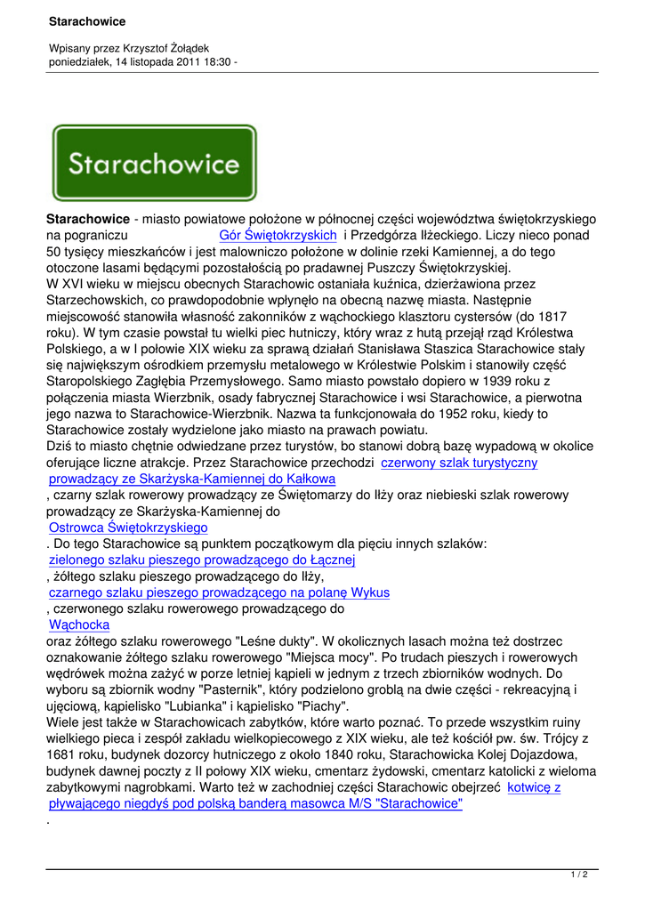 Starachowice Wpisany przez Krzysztof Żołądek poniedziałek, 14 listopada 2011 18:30 - Starachowice - miasto powiatowe położone w północnej części województwa świętokrzyskiego na pograniczu Gór Świętokrzyskich i Przedgórza Iłżeckiego. Liczy nieco ponad 50 tysięcy mieszkańców i jest malowniczo położone w dolinie rzeki Kamiennej, a do tego otoczone lasami będącymi pozostałością po pradawnej Puszczy Świętokrzyskiej. W XVI wieku w miejscu obecnych Starachowic ostaniała kuźnica, dzierżawiona przez Starzechowskich, co prawdopodobnie wpłynęło na obecną nazwę miasta. Następnie miejscowość stanowiła własność zakonników z wąchockiego klasztoru cystersów (do 1817 roku). W tym czasie powstał tu wielki piec hutniczy, który wraz z hutą przejął rząd Królestwa Polskiego, a w I połowie XIX wieku za sprawą działań Stanisława Staszica Starachowice stały się największym ośrodkiem przemysłu metalowego w Królestwie Polskim i stanowiły część Staropolskiego Zagłębia Przemysłowego. Samo miasto powstało dopiero w 1939 roku z połączenia miasta Wierzbnik, osady fabrycznej Starachowice i wsi Starachowice, a pierwotna jego nazwa to Starachowice-Wierzbnik. Nazwa ta funkcjonowała do 1952 roku, kiedy to Starachowice zostały wydzielone jako miasto na prawach powiatu. Dziś to miasto chętnie odwiedzane przez turystów, bo stanowi dobrą bazę wypadową w okolice oferujące liczne atrakcje. Przez Starachowice przechodzi czerwony szlak turystyczny prowadzący ze Skarżyska-Kamiennej do Kałkowa , czarny szlak rowerowy prowadzący ze Świętomarzy do Iłży oraz niebieski szlak rowerowy prowadzący ze Skarżyska-Kamiennej do Ostrowca Świętokrzyskiego . Do tego Starachowice są punktem początkowym dla pięciu innych szlaków: zielonego szlaku pieszego prowadzącego do Łącznej , żółtego szlaku pieszego prowadzącego do Iłży, czarnego szlaku pieszego prowadzącego na polanę Wykus , czerwonego szlaku rowerowego prowadzącego do Wąchocka oraz żółtego szlaku rowerowego "Leśne dukty". W okolicznych lasach można też dostrzec oznakowanie żółtego szlaku rowerowego "Miejsca mocy". Po trudach pieszych i rowerowych wędrówek można zażyć w porze letniej kąpieli w jednym z trzech zbiorników wodnych. Do wyboru są zbiornik wodny "Pasternik", który podzielono groblą na dwie części - rekreacyjną i ujęciową, kąpielisko "Lubianka" i kąpielisko "Piachy". Wiele jest także w Starachowicach zabytków, które warto poznać. To przede wszystkim ruiny wielkiego pieca i zespół zakładu wielkopiecowego z XIX wieku, ale też kościół pw. św. Trójcy z 1681 roku, budynek dozorcy hutniczego z około 1840 roku, Starachowicka Kolej Dojazdowa, budynek dawnej poczty z II połowy XIX wieku, cmentarz żydowski, cmentarz katolicki z wieloma zabytkowymi nagrobkami. Warto też w zachodniej części Starachowic obejrzeć kotwicę z pływającego niegdyś pod polską banderą masowca M/S "Starachowice" . 1/2 Starachowice Wpisany przez Krzysztof Żołądek poniedziałek, 14 listopada 2011 18:30 - W niedalekiej odległości od Starachowic można podziwiać zespół klasztorny oo. Cystersów w Wąchocku , Współczesne Sanktuarium Matki Boskiej Bolesnej, Królowej Polski, Ziemi Świętokrzyskiej w Kałkowie-Godowie , klasztor oo. Benedyktynów na Świętym Krzyżu , rezerwat "Wykus" z polaną, na której stacjonowali partyzanci zgrupowań Ponurego, gotycki kościół pw. św. Małgorzaty w Chybicach, pochodzący z XIV wieku gotycki kościół pw. Matki Bożej Wniebowziętej w Świętomarzy i Tarczek z romańskim kościołem z XIII wieku i drewnianą dzwonnicą z XIX wieku oraz rezerwat "Góra Sieradowska" . Starachowice słyną z produkcji ciężarówek Star, które produkowano w tutejszej Fabryce Samochodów Ciężarowych - powstałych w 1948 roku na bazie Zakładów Mechanicznych w Starachowicach. W kolejnych latach zmieniali się właściciele - od 1991 roku zakłady przekształcono w spółkę o nazwie Zakłady Starachowickie STAR S.A., kilka lat później formę przejęła spółka Sobiesława Zasady, a pod koniec 1999 roku udziałowcem została niemiecka grupa MAN AG. Dziś produkowane są już nie ciężarówki (ich produkcja zakończyła się w 2006 roku), a szkielety autobusów m.in. Neoplan oraz podzespoły autobusów i ciężaróek produkowanych przez grupę MAN. Wśród znanych osób urodzonych w Starachowicach warto wymienić Krystynę Jandę - polską aktorkę, Jadwigę Kaczyńską - filologa, matkę Jarosława i Lecha Kaczyńskich czy Janusza Radka - wokalistę i aktora. Google Map // 2/2