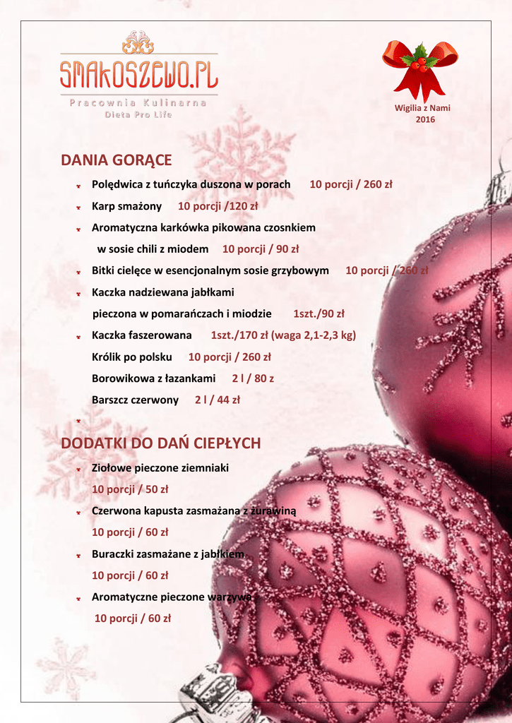Wigilia z Nami 2016 DANIA GORĄCE Polędwica z tuńczyka duszona w porach Karp smażony 10 porcji / 260 zł 10 porcji /120 zł Aromatyczna karkówka pikowana czosnkiem w sosie chili z miodem 10 porcji / 90 zł Bitki cielęce w esencjonalnym sosie grzybowym 10 porcji / 260 zł Kaczka nadziewana jabłkami pieczona w pomarańczach i miodzie Kaczka faszerowana Królik po polsku 1szt./170 zł (waga 2,1-2,3 kg) 10 porcji / 260 zł Borowikowa z łazankami Barszcz czerwony 1szt./90 zł 2 l / 80 z 2 l / 44 zł DODATKI DO DAŃ CIEPŁYCH Ziołowe pieczone ziemniaki 10 porcji / 50 zł Czerwona kapusta zasmażana z żurawiną 10 porcji / 60 zł Buraczki zasmażane z jabłkiem 10 porcji / 60 zł Aromatyczne pieczone warzywa 10 porcji / 60 zł SPECJAŁY NA ZIMNO Kutia z orkiszu 10 porcji / 60 zł Schab nadziewany morelami i śliwkami 10 porcji / 100 zł Rolada z boczku 10 porcji / 100 zł Ryba po grecku 10 porcji / 130 zł W GALARECIE Łosoś w galarecie 10 porcji / 150 zł Pstrąg w galarecie 10 porcji / 130 zł Tymbaliki z kurczaka 1 szt. / 6,50 zł DANIA MĄCZNE Pierogi z kapustą i grzybami, szpinakiem, uszka z kurkami 27 zł/kg WSZYSTKIE ZAMÓWIENIA PRZYJMUJEMY DO 10 GRUDNIA [email protected] 790-389-569
