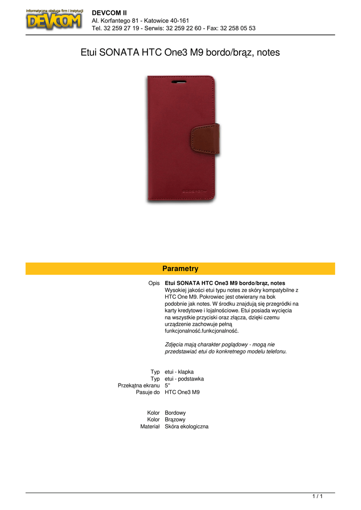 DEVCOM II Al. Korfantego 81 - Katowice 40-161 Tel. 32 259 27 19 - Serwis: 32 259 22 60 - Fax: 32 258 05 53 Etui SONATA HTC One3 M9 bordo/brąz, notes Parametry Opis Etui SONATA HTC One3 M9 bordo/brąz, notes Wysokiej jakości etui typu notes ze skóry kompatybilne z HTC One M9. Pokrowiec jest otwierany na bok podobnie jak notes. W środku znajdują się przegródki na karty kredytowe i lojalnościowe. Etui posiada wycięcia na wszystkie przyciski oraz złącza, dzięki czemu urządzenie zachowuje pełną funkcjonalność.funkcjonalność. Zdjęcia mają charakter poglądowy - mogą nie przedstawiać etui do konkretnego modelu telefonu. Typ Typ Przekątna ekranu Pasuje do etui - klapka etui - podstawka 5'' HTC One3 M9 Kolor Bordowy Kolor Brązowy Materiał Skóra ekologiczna 1/1 Powered by TCPDF (www.tcpdf.org)