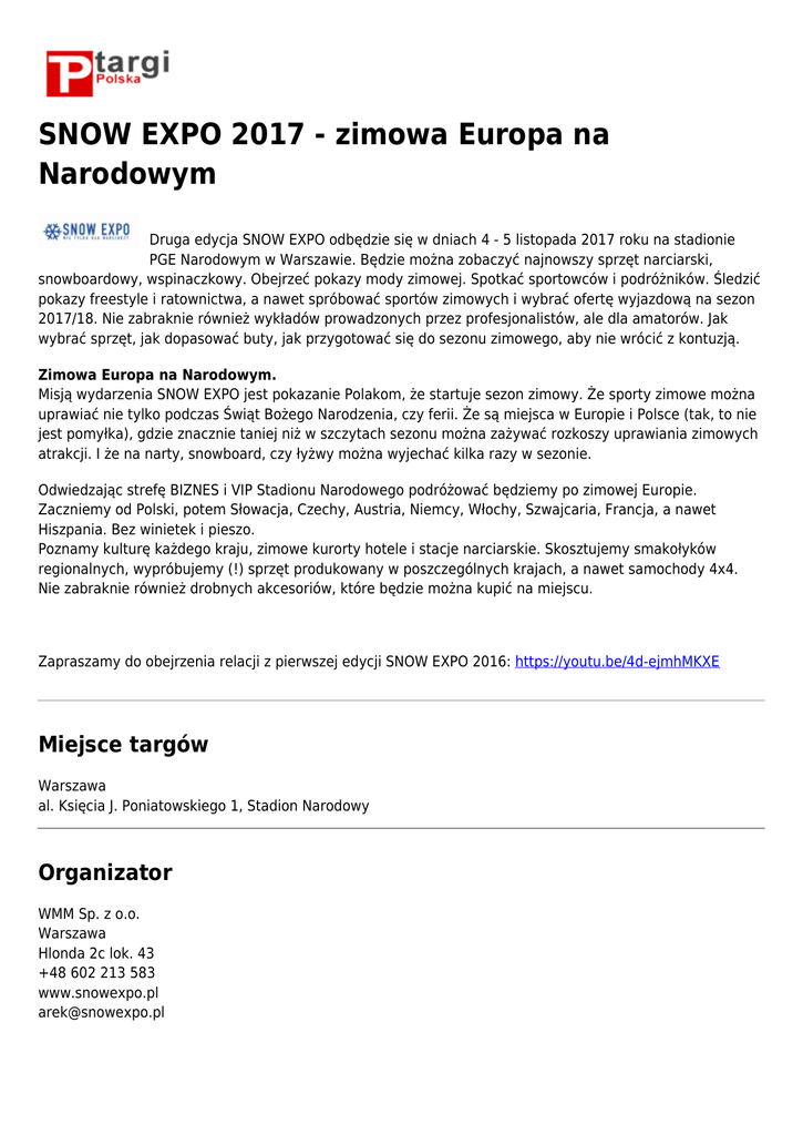 SNOW EXPO 2017 - zimowa Europa na Narodowym Druga edycja SNOW EXPO odbędzie się w dniach 4 - 5 listopada 2017 roku na stadionie PGE Narodowym w Warszawie. Będzie można zobaczyć najnowszy sprzęt narciarski, snowboardowy, wspinaczkowy. Obejrzeć pokazy mody zimowej. Spotkać sportowców i podróżników. Śledzić pokazy freestyle i ratownictwa, a nawet spróbować sportów zimowych i wybrać ofertę wyjazdową na sezon 2017/18. Nie zabraknie również wykładów prowadzonych przez profesjonalistów, ale dla amatorów. Jak wybrać sprzęt, jak dopasować buty, jak przygotować się do sezonu zimowego, aby nie wrócić z kontuzją. Zimowa Europa na Narodowym. Misją wydarzenia SNOW EXPO jest pokazanie Polakom, że startuje sezon zimowy. Że sporty zimowe można uprawiać nie tylko podczas Świąt Bożego Narodzenia, czy ferii. Że są miejsca w Europie i Polsce (tak, to nie jest pomyłka), gdzie znacznie taniej niż w szczytach sezonu można zażywać rozkoszy uprawiania zimowych atrakcji. I że na narty, snowboard, czy łyżwy można wyjechać kilka razy w sezonie. Odwiedzając strefę BIZNES i VIP Stadionu Narodowego podróżować będziemy po zimowej Europie. Zaczniemy od Polski, potem Słowacja, Czechy, Austria, Niemcy, Włochy, Szwajcaria, Francja, a nawet Hiszpania. Bez winietek i pieszo. Poznamy kulturę każdego kraju, zimowe kurorty hotele i stacje narciarskie. Skosztujemy smakołyków regionalnych, wypróbujemy (!) sprzęt produkowany w poszczególnych krajach, a nawet samochody 4x4. Nie zabraknie również drobnych akcesoriów, które będzie można kupić na miejscu. Zapraszamy do obejrzenia relacji z pierwszej edycji SNOW EXPO 2016: https://youtu.be/4d-ejmhMKXE Miejsce targów Warszawa al. Księcia J. Poniatowskiego 1, Stadion Narodowy Organizator WMM Sp. z o.o. Warszawa Hlonda 2c lok. 43 +48 602 213 583 www.snowexpo.pl [email protected]