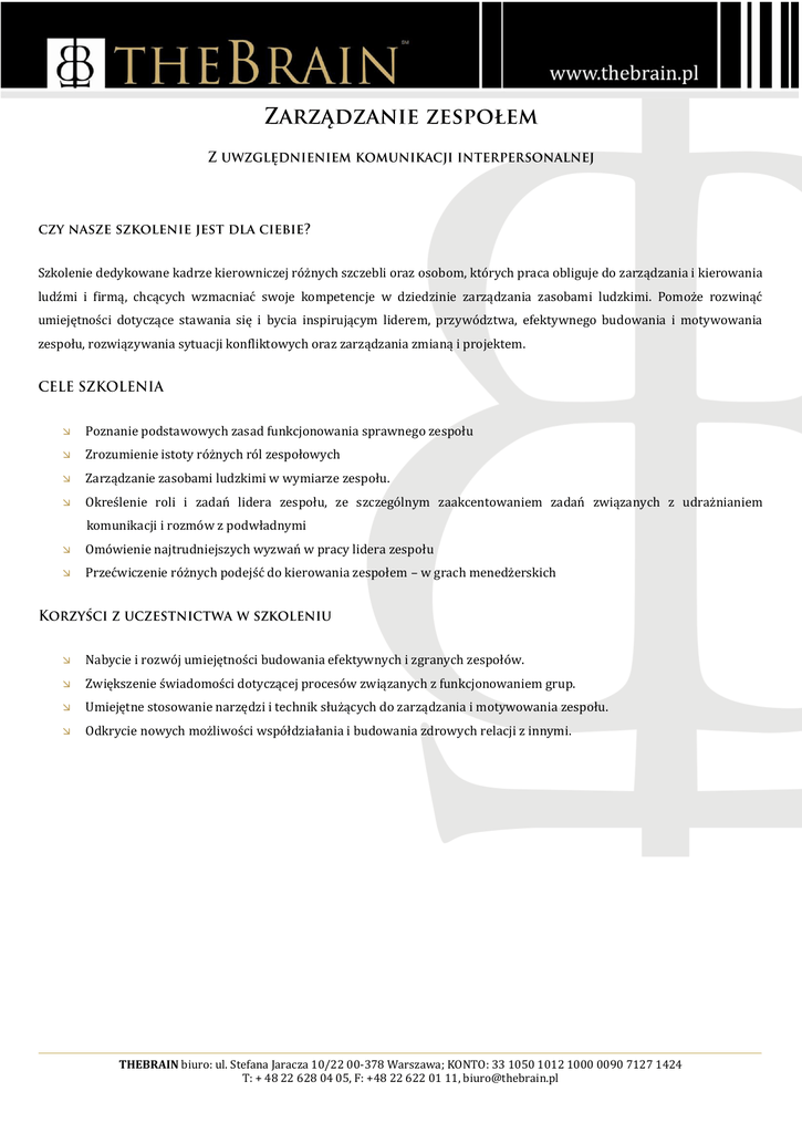 Szkolenie dedykowane kadrze kierowniczej różnych szczebli oraz osobom, których praca obliguje do zarządzania i kierowania ludźmi i firmą, chcących wzmacniać swoje kompetencje w dziedzinie zarządzania zasobami ludzkimi. Pomoże rozwinąć umiejętności dotyczące stawania się i bycia inspirującym liderem, przywództwa, efektywnego budowania i motywowania zespołu, rozwiązywania sytuacji konfliktowych oraz zarządzania zmianą i projektem. Poznanie podstawowych zasad funkcjonowania sprawnego zespołu Zrozumienie istoty różnych ról zespołowych Zarządzanie zasobami ludzkimi w wymiarze zespołu. Określenie roli i zadań lidera zespołu, ze szczególnym zaakcentowaniem zadań związanych z udrażnianiem komunikacji i rozmów z podwładnymi Omówienie najtrudniejszych wyzwań w pracy lidera zespołu Przećwiczenie różnych podejść do kierowania zespołem – w grach menedżerskich Nabycie i rozwój umiejętności budowania efektywnych i zgranych zespołów. Zwiększenie świadomości dotyczącej procesów związanych z funkcjonowaniem grup. Umiejętne stosowanie narzędzi i technik służących do zarządzania i motywowania zespołu. Odkrycie nowych możliwości współdziałania i budowania zdrowych relacji z innymi. THEBRAIN biuro: ul. Stefana Jaracza 10/22 00-378 Warszawa; KONTO: 33 1050 1012 1000 0090 7127 1424 T: + 48 22 628 04 05, F: +48 22 622 01 11, [email protected] Szef zespołu Omówienie roli szefa w zespole, przejęcia odpowiedzialności, podejmowania decyzji, konfrontacji nie tylko z przyjemnymi kwestiami, atmosfery jaka panuje i jaką chcielibyśmy stworzyć, problemów, którym należy stawić czoła i towarzyszącym często wątpliwościach. Moja rola jako szefa zespołu. – Dyskusja nt. tego, co konkretnie mogę poprawić w swoim zespole. Zaproszenie do wypisania trzech mocnych stron, które można wykorzystywać na co dzień w stosunku do podległych pracowników. Wspólne omówienie. Style zarządzania Który styl pasuje do mnie? Jak wybrać optymalny dla siebie styl zarządzania? Omówienie stylów przywódczych przez trenera. Kto jest w moim zespole? Role moich pracowników, ich wiedza, zaangażowanie i diagnoza potencjału. Poznanie struktury charakteru pracowników na podstawie najnowszej klasyfikacji osobowości wg Johna M. Oldhama i Lois B. Morris. Zaprezentowanie struktury charakterów jako narzędzia analizy indywidualnych i zespołowych wzorców funkcjonowania umożliwiających rozumienie procesów związanych z relacjami, komunikacją oraz zachowaniami w kontekście funkcjonowania zespołu. Prezentacja fragmentów filmów. Omówienie i wyciągnięcie wniosków. Przydzielanie zadań - kogo i w jaki sposób wykorzystać, by mój zespół był efektywny? Komunikacja z zespołem - styl komunikacji menedżera Analiza Transakcyjna jako narzędzie do określenia głównych tendencji panujących w zespole w zakresie stylu pracy, tworzenia relacji interpersonalnych i motywowania. Mini-wykład nt. Analizy Transakcyjnej. Prezentacja wzorców związanych z działaniem nakazów: Bądź Doskonały, Bądź Silny, Sprawiaj Przyjemność, Wysilaj się, Śpiesz się oraz ich konsekwencja dla realizowanego stylu pracy i zarządzania. Jak mogę wykorzystać ją w komunikacji z zespołem. - Refleksja indywidualna oraz możliwość postawienia wspólnych hipotez na temat wzorców panujących w zespole, w którym są zatrudnieni uczestnicy szkolenia. Trening praktycznych sposobów używania Analizy Transakcyjnej w komunikacji z pracownikami. - Jak mogę udoskonalić obieg informacji w zespole? THEBRAIN biuro: ul. Stefana Jaracza 10/22 00-378 Warszawa; KONTO: 33 1050 1012 1000 0090 7127 1424 T: + 48 22 628 04 05, F: +48 22 622 01 11, [email protected] 5 fundamentów pracy zespołowej. Cechy dobrego zespołu Mini-wykład nt.: 1. Wspólnota celów. 2. Skuteczne kierowanie - lider zespołu. 3. System komunikacji. 4. Efektywny podział zadań. 5. Jasna strategia. Dyskusja + komentarz trenera. Komunikacja na co dzień, czyli win-win situation Złote zasady komunikowania i dawania informacji zwrotnej sprzyjające budowaniu autorytetu szefa. Jak komunikować się jednoznacznie i z szacunkiem? Jak krytykować bez zranień? Zasady krytyki i nagany. Co zrobić, gdy…? Eliminacja zakłóceń we współpracy. Wykonanie ćwiczenia: „Bliźniacze wieże” uczącego w jaki sposób precyzyjnie przekazywać komunikaty i polecenia. Pozwala każdemu z uczestników „sprawdzić się” w roli nadawcy informacji, ocenić zwięzłość, jasność i precyzję własnych komunikatów. Praktyczne techniki komunikowania ułatwiające zarządzanie zespołem Mini-wykład + dyskusja Motywowanie przez pochwałę i uznanie. Kiedy w jakim celu stosować i w jaki sposób pochwalić? Jakie przynosi korzyści? Komunikowanie decyzji pracownikom Odmawianie pracownikom. Trudne sytuacje komunikacyjne w zawodzie menedżera. Listing najważniejszych trudnych sytuacji z pracownikami. Dyskusja i wspólne ułożenie „listy”. Ćwiczenie: „Prowadzenie rozmów z podwładnymi” dotyczące rozwiązywania trudnych sytuacji z pracownikami. Uczestnicy wcielają się w role szefów HR i podwładnych (dwie osoby). Każda para ma za zadanie przeprowadzić trudną rozmowę z podwładnym: dyscyplinująca, rozwojową oraz rozwiązującą istotny problem. Rolą menedżera HR jest takie przeprowadzenie rozmowy, by osiągnąć trudny i sporny cel, ale jednocześnie utrzymać dobrą relację z podwładnym i podnieść poziom jego motywacji. Scenki są wspólnie analizowane i omawianie. Expose szefa i struktura w kontekście analizy transakcyjnej- ćwiczenia w formułowaniu i wygłaszaniu expose odniesionego do realiów zespołu. THEBRAIN biuro: ul. Stefana Jaracza 10/22 00-378 Warszawa; KONTO: 33 1050 1012 1000 0090 7127 1424 T: + 48 22 628 04 05, F: +48 22 622 01 11, [email protected] Bo delegowania można się nauczyć Krótka pogadanka nt.: Jednoznacznego delegowania zadań. Delegowania zadań tak, aby nie powstaw