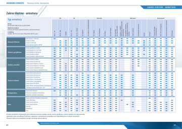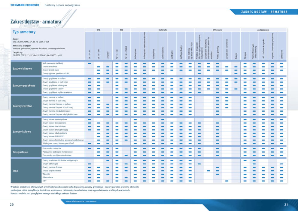 Dostawy, serwis, rozwiązania. Z A K R E S D O S TA W - A R M AT U R A Zakres dostaw - armatura Elektrownie Inżynieria chemiczna i procesowa LNG / LPG oraz kriogenika Przemysł rafineryjny i petrochemiczny Oil & gaz By-pass Zastosowanie Uszczelnienie ciśnieniowe Płaszcz grzewczy Uszczelnienie mieszkowe; certyfikowana szczelność do atmosfery Armatura z napędem (elektrycznym, pneumatycznym, hydraulicznym) Inne materiały (np. stopy niklu, brąz) Stal Super Duplex Wykonanie Stal Duplex Stal węglowa PN 100 – PN 640 PN 10 – 100 Certyfikaty: ISO 9001, PED 97 / 23 / EC, Gost R, RTN, API 6FA, BS6755 część 2 > DN 600 DN 15 – 50 Wykonania przyłączy: Kołnierze, gwintowane, spawane doczołowo, spawane pachwinowo DN 50 – 600 Normy: DIN, AD 2000, ASME, API, BS, JIS, GOST, AFNOR Stal nierdzewna Materiały Stal stopowa PN Stal węglowa niskotemperaturowa DN Typ armatury Małe zasuwy ze stali kutej Zasuwy klinowe Zasuwy ze staliwa Zasuwy ze stali kutej Zasuwy płytowe zgodnie z API 6D Zawory grzybkowe ze staliwa Zawory grzybkowe ze stali kutej Zawory grzybkowe Zawory grzybkowe trójdrogowe Zawory grzybkowe kątowe Zawory grzybkowe szybkozamykające Zawory zwrotne ze staliwa Zawory zwrotne ze stali kutej Zawory zwrotne Zawory zwrotne klapowe ze staliwa Zawory zwrotne klapowe ze stali kutej Zawory zwrotne międzykołnierzowe Zawory zwrotne klapowe międzykołnierzowe Zawory kulowe jednoczęściowe Zawory kulowe dwuczęściowe Zawory kulowe trzyczęściowe Zawory kulowe Zawory kulowe z kulą pływającą Zawory kulowe z kulą podpartą Zawory kulowe TOP ENTRY Zawory kulowe, konstrukcja spawana, bezobsługowe Trójdrogowe zawory kulowe, port L lub T Przepustnice centryczne Przepustnice Przepustnice podwójnie mimośrodowe Przepustnice potrójnie mimośrodowe Zawory przelotowe dla tłoków inteligentnych Zawory odmulające Zawory zwrotne dyszowe Inne Zawory bezpieczeństwa Wzierniki Odwadniacze Filtry W zakres produktów oferowanych przez Siekmann Econosto wchodzą zasuwy, zawory grzybkowe i zawory zwrotne oraz inne elementy spełniające różne specyfikacje techniczne, wykonane z różnorodnych materiałów oraz wyprodukowane w różnych wariantach. Powyższa tabela jest przeglądem naszego szerokiego zakresu dostaw. www.siekmann-econosto.com 20 21