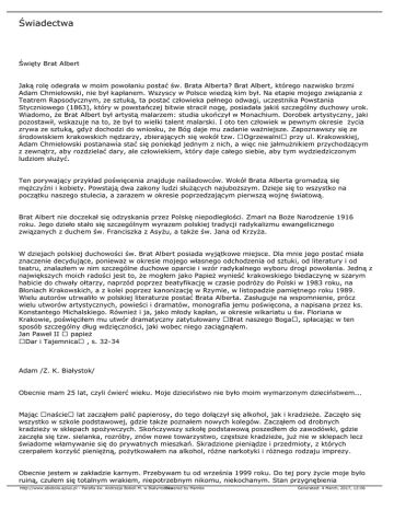 Świadectwa Święty Brat Albert Jaką rolę odegrała w moim powołaniu postać św. Brata Alberta? Brat Albert, którego nazwisko brzmi Adam Chmielowski, nie był kapłanem. Wszyscy w Polsce wiedzą kim był. Na etapie mojego związania z Teatrem Rapsodycznym, ze sztuką, ta postać człowieka pełnego odwagi, uczestnika Powstania Styczniowego (1863), który w powstańczej bitwie stracił nogę, posiadała jakiś szczególny duchowy urok. Wiadomo, że Brat Albert był artystą malarzem: studia ukończył w Monachium. Dorobek artystyczny, jaki pozostawił, wskazuje na to, że był to wielki talent malarski. I oto ten człowiek w pewnym okresie życia zrywa ze sztuką, gdyż dochodzi do wniosku, że Bóg daje mu zadanie ważniejsze. Zapoznawszy się ze środowiskiem krakowskich nędzarzy, zbierających się wokół tzw. Ogrzewalni przy ul. Krakowskiej, Adam Chmielowski postanawia stać się poniekąd jednym z nich, a więc nie jałmużnikiem przychodzącym z zewnątrz, aby rozdzielać dary, ale człowiekiem, który daje całego siebie, aby tym wydziedziczonym ludziom służyć. Ten porywający przykład poświęcenia znajduje naśladowców. Wokół Brata Alberta gromadzą się mężczyźni i kobiety. Powstają dwa zakony ludzi służących najuboższym. Dzieje się to wszystko na początku naszego stulecia, a zarazem w okresie poprzedzającym pierwszą wojnę światową. Brat Albert nie doczekał się odzyskania przez Polskę niepodległości. Zmarł na Boże Narodzenie 1916 roku. Jego dzieło stało się szczególnym wyrazem polskiej tradycji radykalizmu ewangelicznego związanych z duchem św. Franciszka z Asyżu, a także św. Jana od Krzyża. W dziejach polskiej duchowości św. Brat Albert posiada wyjątkowe miejsce. Dla mnie jego postać miała znaczenie decydujące, ponieważ w okresie mojego własnego odchodzenia od sztuki, od literatury i od teatru, znalazłem w nim szczególne duchowe oparcie i wzór radykalnego wyboru drogi powołania. Jedną z największych moich radości jest to, że mogłem jako Papież wynieść krakowskiego biedaczynę w szarym habicie do chwały ołtarzy, naprzód poprzez beatyfikację w czasie podróży do Polski w 1983 roku, na Błoniach Krakowskich, a z kolei poprzez kanonizację w Rzymie, w listopadzie pamiętnego roku 1989. Wielu autorów utrwaliło w polskiej literaturze postać Brata Alberta. Zasługuje na wspomnienie, prócz wielu utworów artystycznych, powieści i dramatów, monografia jemu poświęcona, a napisana przez ks. Konstantego Michalskiego. Również i ja, jako młody kapłan, w okresie wikariatu u św. Floriana w Krakowie, poświęciłem mu utwór dramatyczny zatytułowany Brat naszego Boga, spłacając w ten sposób szczególny dług wdzięczności, jaki wobec niego zaciągnąłem. Jan Paweł II papież Dar i Tajemnica , s. 32-34 Adam /Z. K. Białystok/ Obecnie mam 25 lat, czyli ćwierć wieku. Moje dzieciństwo nie było moim wymarzonym dzieciństwem... Mając naście lat zacząłem palić papierosy, do tego dołączył się alkohol, jak i kradzieże. Zaczęło się wszystko w szkole podstawowej, gdzie także poznałem nowych kolegów. Zacząłem od drobnych kradzieży w sklepach spożywczych. Skończywszy szkołę podstawową poszedłem do zawodówki, gdzie zaczęła się tzw. sielanka, rozróby, znów nowe towarzystwo, częstsze kradzieże, już nie w sklepach lecz świadome włamywanie się do prywatnych mieszkań. Skradzione pieniądze i przedmioty, z których czerpałem korzyść pieniężną, pożytkowałem na alkohol, różne narkotyki i różnego rodzaju imprezy. Obecnie jestem w zakładzie karnym. Przebywam tu od września 1999 roku. Do tej pory życie moje było ruiną, czułem się totalnym wrakiem, niepotrzebnym nikomu, niekochanym. Stan przygnębienia http://www.abobola.aplus.pl - Parafia św. Andrzeja Boboli M. w Białymstoku Powered by Mambo Generated: 4 March, 2017, 12:06 towarzyszył mi praktycznie przez cały dzień, tylko niekiedy stawał się mniejszy, ale gdy się nasilał pojawiały się myśli samobójcze... doszło do tego, że przypisałem sobie chorobę psychiczną. Któregoś dnia kładąc się spać, łkałem jak małe dziecko szukające w tłumie matki. Nagle z całych sił powiedziałem dosłownie to, ci teraz piszę: Jezu błagam Cię z całego serca, dopomóż mi. Powtórzyłem to kolka razy i nie wiem jak to się stało, że przestałem płakać i poczułem ciepło w sercu... Zdecydowałem, że pójdę do kościoła i tak się stało. Nabożeństwo się jednak skończyło i był czas, że trzeba było opuścić to miejsce. Musiałem czekać cały tydzień, aby znów móc pójść i przygotować się do czynnego udziału we Mszy św. Postanowiłem iść do spowiedzi ... przyszła kolej na moją spowiedź. Momentalnie znalazłem się na klęczniku, bojąc się nawet uczynić znak krzyża, nie mówiąc już o patrzeniu przez kratę na księdza. To jest coś strasznego bać się swoich grzechów. Ale z Bożą pomocą udało mi się wyznać większość grzechów, przez które wyrządziłem krzywdę sobie, ale i rodzinie i innym bezbronnym ludziom. Przyjąłem Komunię św. i chciałem tam pozostać na wieki. Ogarnął mnie taki spokój, że nie potrafiłem tego zrozumieć... Później zacząłem czytać Pismo św., co na początku było ciężkim orzechem do zgryzienia. Denerwowało mnie ale i fascynowało ... zacząłem go praktykować. Obecnie siedzę w Białymstoku, mieście, gdzie również mieszkają moi rodzice. Uczęszczam codziennie na poranną Mszę św., czytam w czasie Mszy św. fragmenty z Pisma św., regularnie przystępuję do spowiedzi i oczywiście Komunii św. ... KIEDYŚ POJECHAŁEM DO LASU, GDZIE BYŁY DWIE DROGI WYBRAŁEM TĘ NAJMNIEJ UCZĘSZCZANĄ, A RESZTA WZIĘŁA SIĘ Z TEGO, ŻE JĄ WYBRAŁEM. Już niebawem wychodzę, mam nadzieję, że w tym roku. Gorąco was proszę o modlitwę z Waszej strony, ja również modlę się za Was. Jezus Zmartwychwstał! Z.K. Białystok Adam Jan Mo