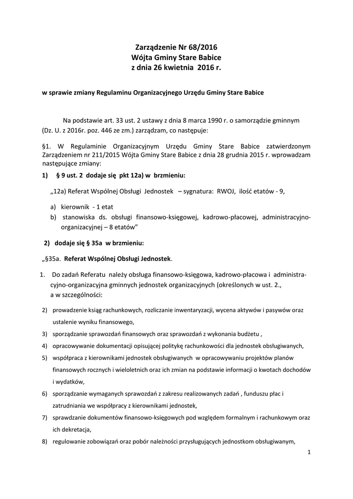 Zarządzenie Nr 68/2016 Wójta Gminy Stare Babice z dnia 26 kwietnia 2016 r. w sprawie zmiany Regulaminu Organizacyjnego Urzędu Gminy Stare Babice Na podstawie art. 33 ust. 2 ustawy z dnia 8 marca 1990 r. o samorządzie gminnym (Dz. U. z 2016r. poz. 446 ze zm.) zarządzam, co następuje: §1. W Regulaminie Organizacyjnym Urzędu Gminy Stare Babice zatwierdzonym Zarządzeniem nr 211/2015 Wójta Gminy Stare Babice z dnia 28 grudnia 2015 r. wprowadzam następujące zmiany: 1) § 9 ust. 2 dodaje się pkt 12a) w brzmieniu: „12a) Referat Wspólnej Obsługi Jednostek – sygnatura: RWOJ, ilość etatów - 9, a) kierownik - 1 etat b) stanowiska ds. obsługi finansowo-księgowej, kadrowo-płacowej, administracyjnoorganizacyjnej – 8 etatów” 2) dodaje się § 35a w brzmieniu: „§35a. Referat Wspólnej Obsługi Jednostek. 1. Do zadań Referatu należy obsługa finansowo-księgowa, kadrowo-płacowa i administracyjno-organizacyjna gminnych jednostek organizacyjnych (określonych w ust. 2., a w szczególności: 2) prowadzenie ksiąg rachunkowych, rozliczanie inwentaryzacji, wycena aktywów i pasywów oraz ustalenie wyniku finansowego, 3) sporządzanie sprawozdań finansowych oraz sprawozdań z wykonania budżetu , 4) opracowywanie dokumentacji opisującej politykę rachunkowości dla jednostek obsługiwanych, 5) współpraca z kierownikami jednostek obsługiwanych w opracowywaniu projektów planów finansowych rocznych i wieloletnich oraz ich zmian na podstawie informacji o kwotach dochodów i wydatków, 6) sporządzanie wymaganych sprawozdań z zakresu realizowanych zadań , funduszu płac i zatrudniania we współpracy z kierownikami jednostek, 7) sprawdzanie dokumentów finansowo-księgowych pod względem formalnym i rachunkowym oraz ich dekretacja, 8) regulowanie zobowiązań oraz pobór należności przysługujących jednostkom obsługiwanym, 1 9) prowadzenie windykacji należności , 10) wystawianie faktur z tytułu sprzedaży, najmu i dzierżawy majątku powierzonego jednostkom obsługiwanym oraz księgowanie należnego podatku Vat, 11) prowadzenie rejestru zakupu i sprzedaży podatku Vat oraz sporządzenie zbiorczej deklaracji Vat jednostek obsługiwanych, 12) bieżąca obsługa rachunków bankowych jednostek obsługiwanych, 13) naliczanie i rozliczanie wynagrodzeń pracowników jednostek obsługiwanych wraz z pochodnymi oraz zobowiązań z tytułu umów cywilnoprawnych, 14) przekazywanie składek od wynagrodzeń i zleceniobiorców na ubezpieczenia społeczne i zdrowotne oraz Fundusz Pracy i Państwowy Fundusz Rehabilitacji Osób Niepełnosprawnych, 15) naliczanie i odprowadzanie należnych podatków oraz dokonywanie rocznych rozliczeń podatkowych, 16) prowadzenie kartotek wynagrodzeń, 17) sporządzanie sprawozdawczości z zakresu wynagrodzeń wymaganych przepisami o statystyce publicznej, 18) prowadzenie ewidencji pomocniczej środków trwałych, wartości niematerialnych i prawnych oraz sporządzanie sprawozdań w zakresie środków trwałych, 19) zabezpieczenie i przechowywanie dokumentów księgowych, 20) opracowywanie projektów zarządzeń i instrukcji dotyczących spraw finansowo-księgowych, 21) obsługa finansowa zakładowego funduszu świadczeń socjalnych jednostek obsługiwanych, 22) prowadzenie obsługi kadrowej, 23) przygotowywanie projektów aktów prawnych podejmowanych przez organy gminy w sprawach będących przedmiotem działania referatu. 24) prowadzenie spraw związanych z organizacją konkursów na stanowisko dyrektorów szkół, przedszkoli oraz udział w pracach komisji konkursowej, 25) prowadzenie dokumentacji związanej z powierzeniem stanowiska dyrektora, 26) prowadzenie dokumentacji związanej z ocenianiem dyrektorów szkół i przedszkoli, 27) prowadzenie postępowań wyjaśniających zasadność uchwał rad pedagogicznych wnioskujących o odwołanie dyrektora szkoły, przedszkola z powierzonej mu funkcji, 28) prowadzenie spraw osobowych wynikających ze stosunku pracy dyrektorów oraz pracowników jednostek obsługiwanych prowadzonych przez Gminę, 29) obsługa spraw związanych z awansem zawodowym nauczycieli, 30) przygotowywanie propozycji dotyczących wynagradzania kierowników jednostek obsługiwanych, 2 31) prowadzenie spraw dotyczących ustalenia planu sieci publicznych szkół podstawowych i gimnazjum oraz granic ich obwodów, 32) prowadzenie spraw związanych z realizacją obowiązku szkolnego i obowiązku nauki oraz przygotowania przedszkolnego, 33) prowadzenie spraw związanych z wydawaniem zezwoleń na założenie szkół i przedszkoli publicznych przez osobę prawną lub fizyczną oraz prowadzenie ewidencji szkół i placówek niepublicznych, 34) sprawdzanie kompletności, poprawności i zgodności ze stanem faktycznym danych oświatowych gromadzonych w bazach danych Systemu Informacji Oświatowej (SIO), 35) sporządzenie zbiorczych informacji oświatowych składanych przez placówki oświatowe w jeden system informacji oświatowych (SIO) i przekazanie bazy danych do Mazowieckiego Kuratorium Oświaty, 36) prowadzenie spraw dotyczących udzielania i rozliczania dotacji dla niepublicznych przedszkoli, szkół i placówek oświatowych, 37) organizacja dowozu dzieci do szkół i opieki w czasie przewozu do i ze szkoły uczniów, w tym także uczniów niepełnosprawnych, 38) zawieranie umów z rodzicami na dowożenie uczniów niepełnosprawnych do szkół oraz ich rozliczanie, 39) prowadzenie spraw dotyczących stypendiów, 40) współpraca z jednostkami obsługiwanymi w zakresie pozyskiwania środków z budżetu państwa i pochodzących z innych źródeł oraz prowadzenie ich obsługi, 41) prowadzenie spraw związanych z udzielaniem dofinansowania pracodawcom kosztów przygotowania zawodowego młodocianych pracowników, 42) prowadzenie rejestru żłobków oraz ewidencji dziennych opiekunów, 43) przygotowywanie materiałów, analiz i informacji dla potrzeb organów gminy w zakresie działania referatu. 2. Wykaz jednostek organizacyjnych obsługi