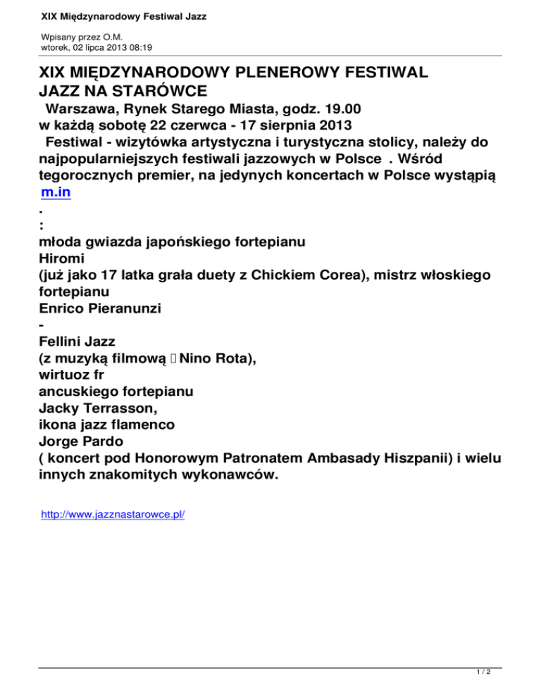 XIX Międzynarodowy Festiwal Jazz Wpisany przez O.M. wtorek, 02 lipca 2013 08:19 XIX MIĘDZYNARODOWY PLENEROWY FESTIWAL JAZZ NA STARÓWCE Warszawa, Rynek Starego Miasta, godz. 19.00 w każdą sobotę 22 czerwca - 17 sierpnia 2013 Festiwal - wizytówka artystyczna i turystyczna stolicy, należy do najpopularniejszych festiwali jazzowych w Polsce . Wśród tegorocznych premier, na jedynych koncertach w Polsce wystąpią m.in . : młoda gwiazda japońskiego fortepianu Hiromi (już jako 17 latka grała duety z Chickiem Corea), mistrz włoskiego fortepianu Enrico Pieranunzi Fellini Jazz (z muzyką filmową Nino Rota), wirtuoz fr ancuskiego fortepianu Jacky Terrasson, ikona jazz flamenco Jorge Pardo ( koncert pod Honorowym Patronatem Ambasady Hiszpanii) i wielu innych znakomitych wykonawców. http://www.jazznastarowce.pl/ 1/2 XIX Międzynarodowy Festiwal Jazz Wpisany przez O.M. wtorek, 02 lipca 2013 08:19 2/2